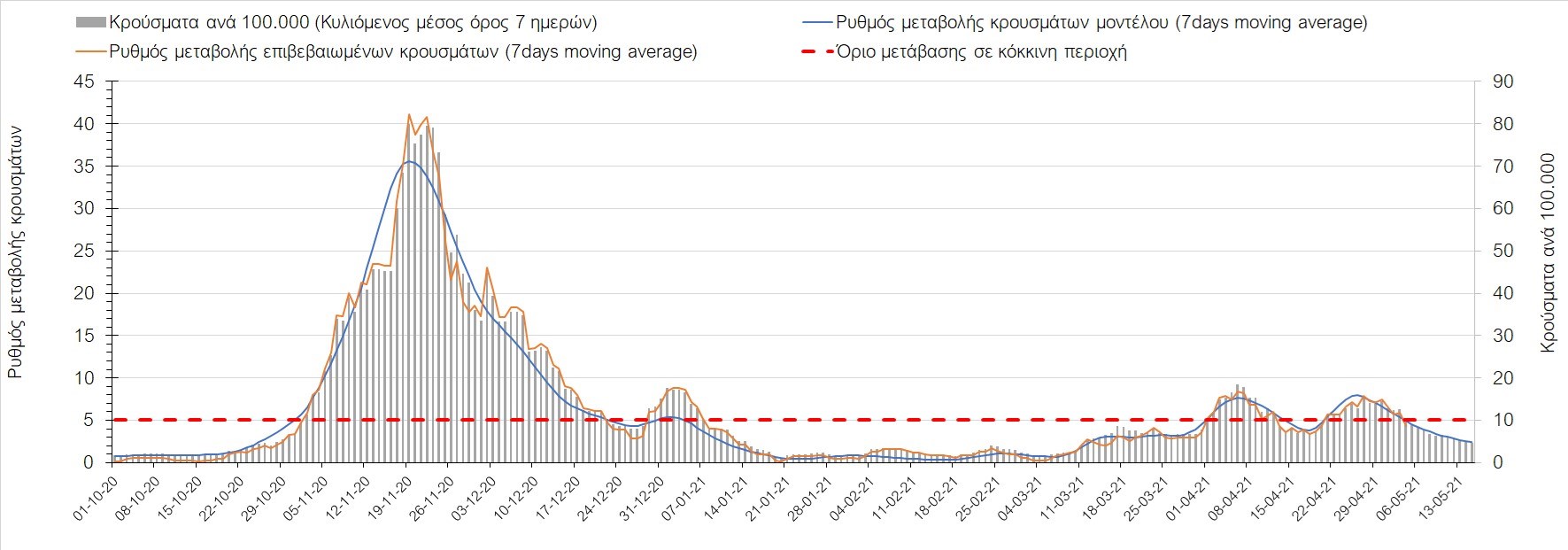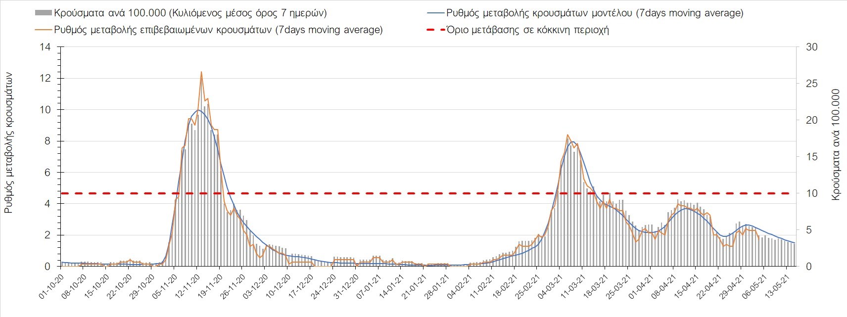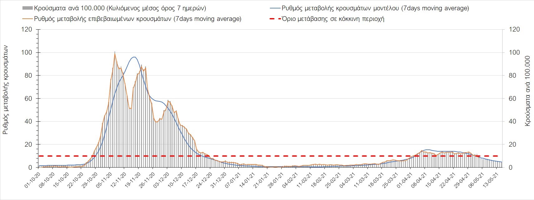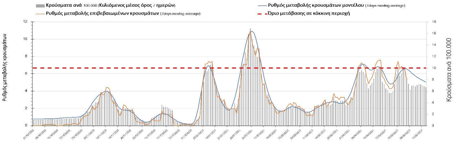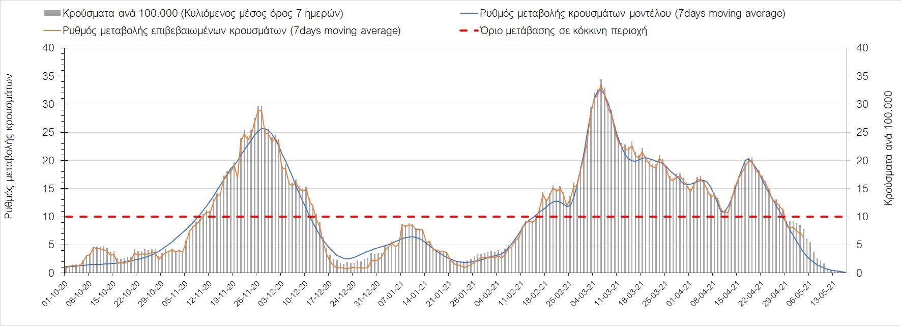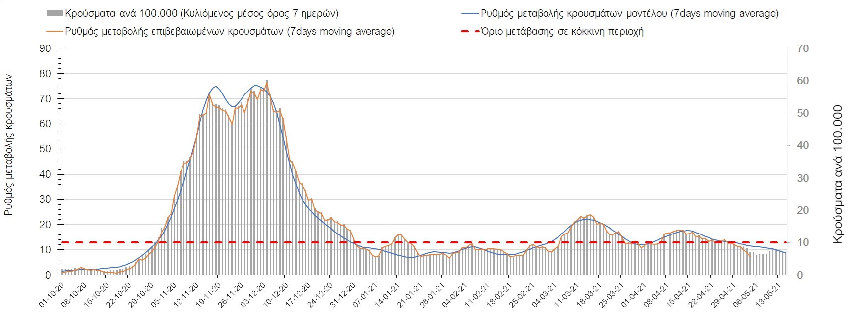 Σχήμα 44. Πορεία του ημερησίου αριθμού των κρουσμάτων (κυλιόμενος μέσος όρος 7 ημερών) στον ΈβροΣτο Ηράκλειο, όπου εντοπίστηκαν 30 κρούσματα την Τρίτη, παρατηρείται αύξηση σε σχέση με τη Δευτέρα (Σχήμα 45). Λόγω των έντονων διακυμάνσεων που σημειώθηκαν στην πορεία της πανδημίας ως αποτέλεσμα του πολύ μεγάλου αριθμού φορέων του μεταλλαγμένου στελέχους Β.1.1.7, το Ηράκλειο είχε μεγάλη διασπορά του ιού και αυτή η δυναμική καθυστέρησε τον αποχαρακτηρισμό της περιοχής ως κόκκινη, η οποία με βάση την πορεία των τελευταίων ημερών, αναμένουμε να συμβεί στις επόμενες ημέρες. Στα Χανιά με 27 κρούσματα την Τρίτη (Σχήμα 46) έχουμε αύξηση σε σχέση με προχθές, και υπάρχουν έντονες διακυμάνσεις που δυσχεραίνουν τη συστηματική αποκλιμάκωση. Τα Χανιά θα παραμείνουν ανάμεσα στις κόκκινες περιοχές όλη την πρώτη εβδομάδα του Μαΐου. Αύξηση κρουσμάτων παρατηρείται στο Ρέθυμνο με 3 κρούσματα, στο οποίο η έντονα ανοδική τάση της προηγούμενης εβδομάδας, έχει περιέλθει σε πορεία ισχυρής αποκλιμάκωσης (Σχήμα 47), που έχει φέρει την περιοχή στο όριο του αποχαρακτηρισμού ως κόκκινη. Στο Λασίθι παρατηρείται σταθεροποίηση σε σχέση με προχθές, καθώς εντοπίστηκαν 4 κρούσματα την Τρίτη, και παρατηρούνται έντονες διακυμάνσεις (Σχήμα 48), οι οποίες όμως διατηρούνται κάτω από το όριο της κόκκινης περιοχής.