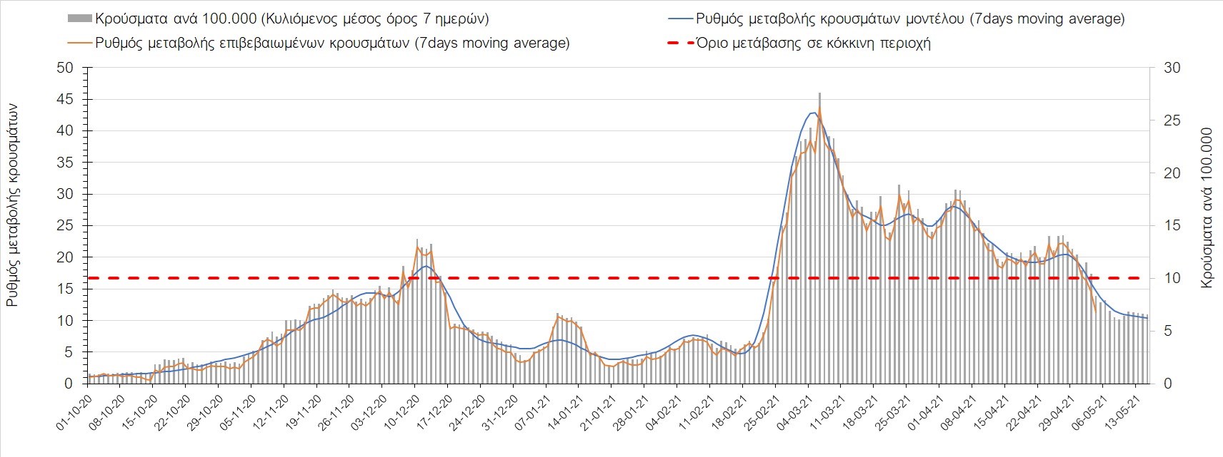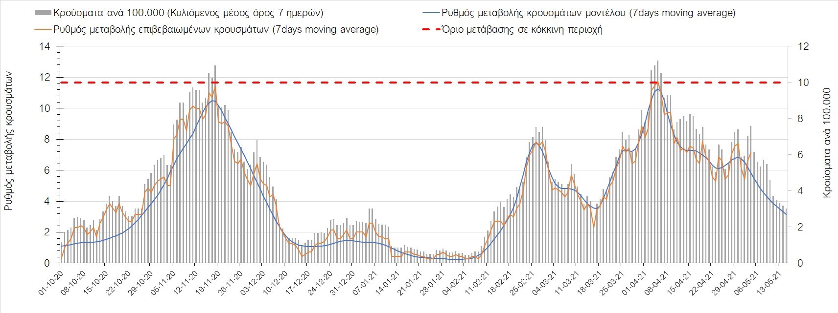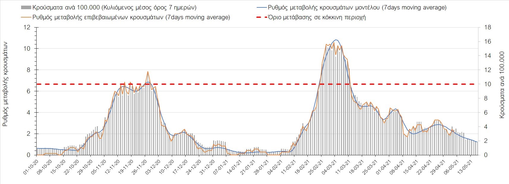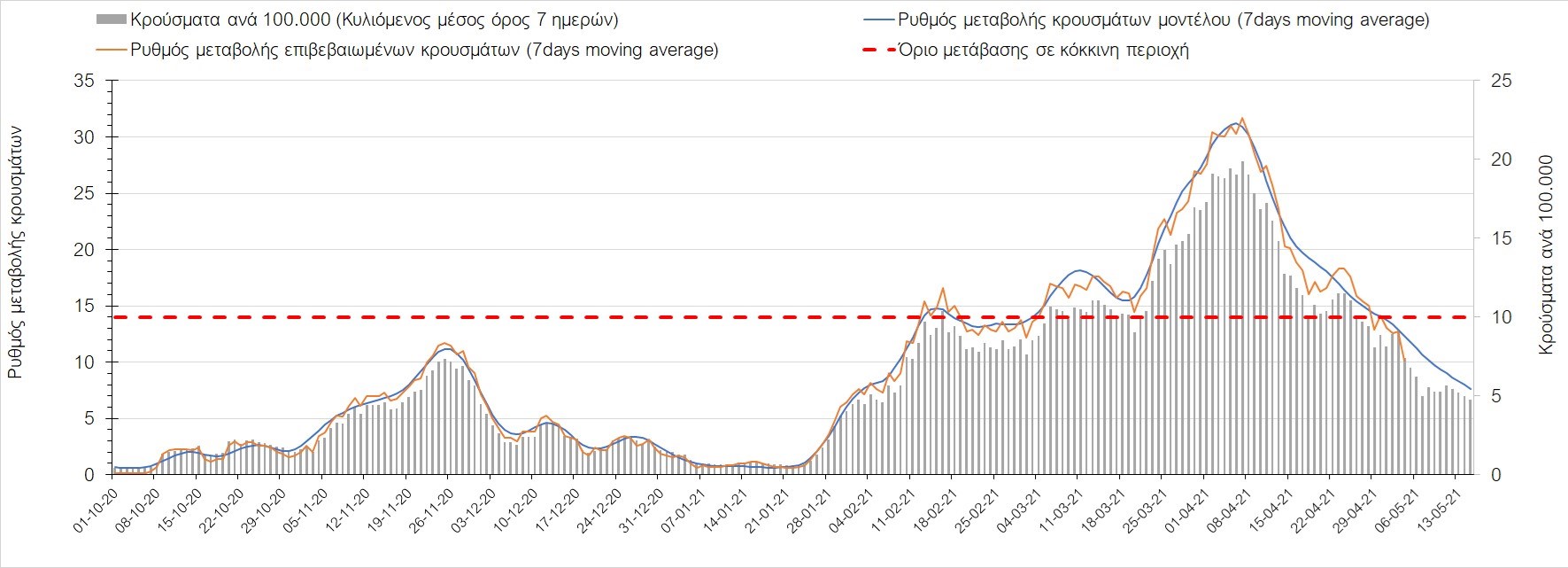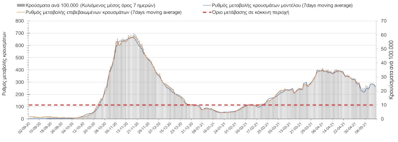 Σχήμα 44. Πορεία του ημερησίου αριθμού των κρουσμάτων (κυλιόμενος μέσος όρος 7 ημερών) στον ΈβροΣτο Ηράκλειο, όπου εντοπίστηκαν 30 κρούσματα την Τρίτη, παρατηρείται αύξηση σε σχέση με τη Δευτέρα (Σχήμα 45). Λόγω των έντονων διακυμάνσεων που σημειώθηκαν στην πορεία της πανδημίας ως αποτέλεσμα του πολύ μεγάλου αριθμού φορέων του μεταλλαγμένου στελέχους Β.1.1.7, το Ηράκλειο είχε μεγάλη διασπορά του ιού και αυτή η δυναμική καθυστέρησε τον αποχαρακτηρισμό της περιοχής ως κόκκινη, η οποία με βάση την πορεία των τελευταίων ημερών, αναμένουμε να συμβεί στις επόμενες ημέρες. Στα Χανιά με 27 κρούσματα την Τρίτη (Σχήμα 46) έχουμε αύξηση σε σχέση με προχθές, και υπάρχουν έντονες διακυμάνσεις που δυσχεραίνουν τη συστηματική αποκλιμάκωση. Τα Χανιά θα παραμείνουν ανάμεσα στις κόκκινες περιοχές όλη την πρώτη εβδομάδα του Μαΐου. Αύξηση κρουσμάτων παρατηρείται στο Ρέθυμνο με 3 κρούσματα, στο οποίο η έντονα ανοδική τάση της προηγούμενης εβδομάδας, έχει περιέλθει σε πορεία ισχυρής αποκλιμάκωσης (Σχήμα 47), που έχει φέρει την περιοχή στο όριο του αποχαρακτηρισμού ως κόκκινη. Στο Λασίθι παρατηρείται σταθεροποίηση σε σχέση με προχθές, καθώς εντοπίστηκαν 4 κρούσματα την Τρίτη, και παρατηρούνται έντονες διακυμάνσεις (Σχήμα 48), οι οποίες όμως διατηρούνται κάτω από το όριο της κόκκινης περιοχής.