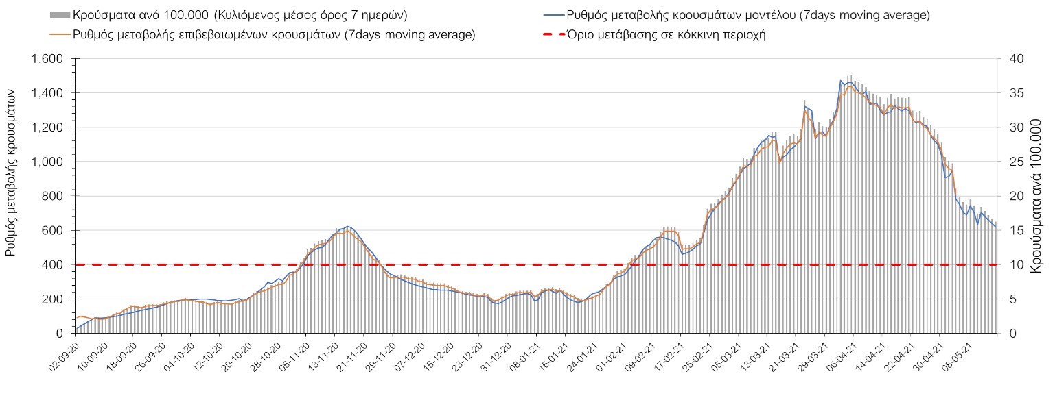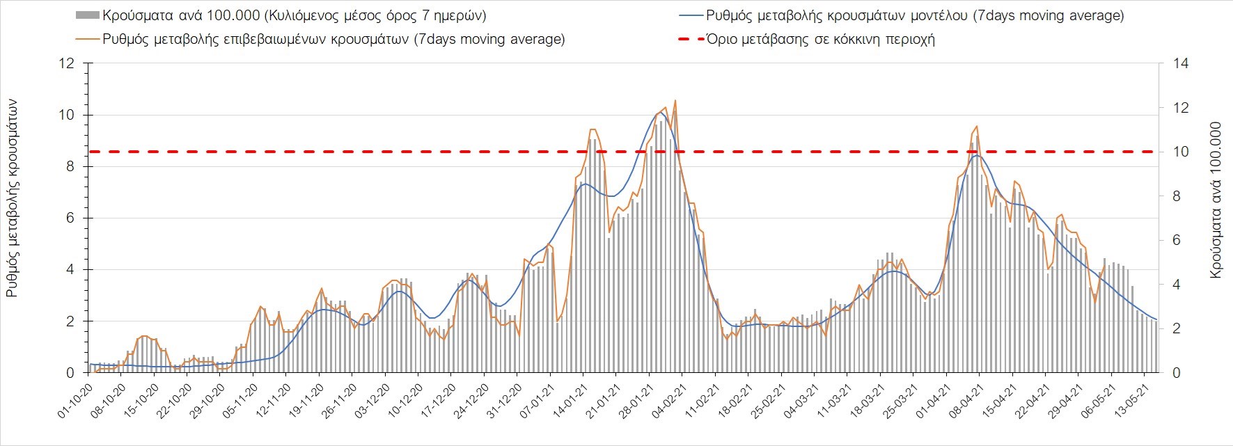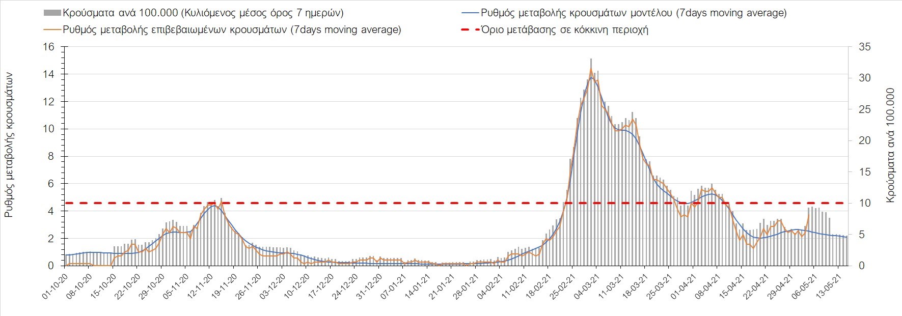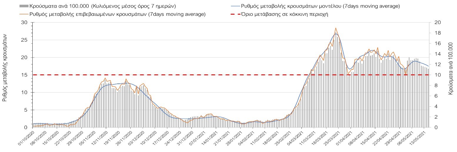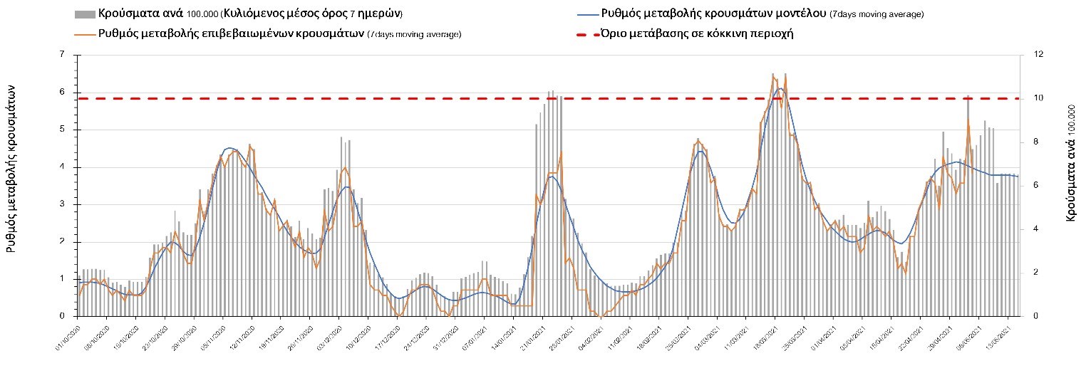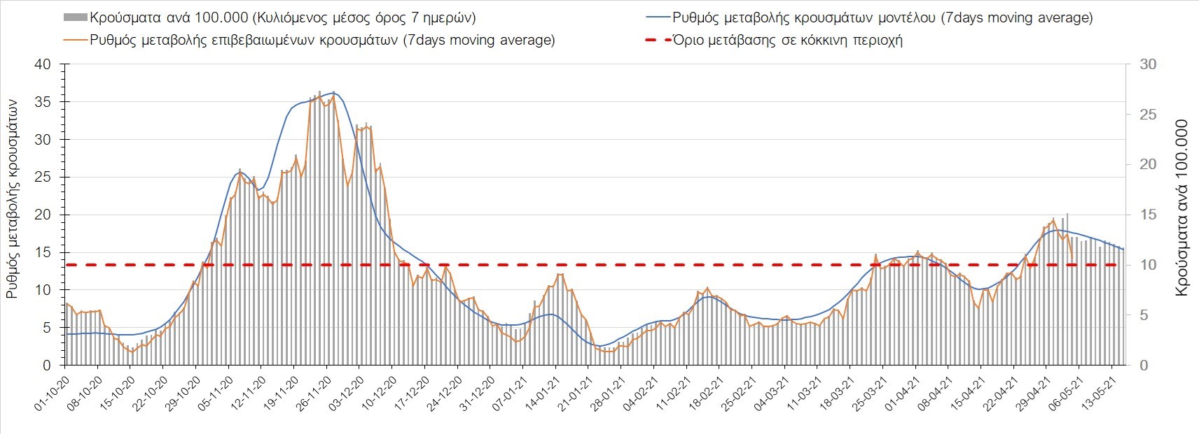 Σχήμα 44. Πορεία του ημερησίου αριθμού των κρουσμάτων (κυλιόμενος μέσος όρος 7 ημερών) στον ΈβροΣτο Ηράκλειο, όπου εντοπίστηκαν 30 κρούσματα την Τρίτη, παρατηρείται αύξηση σε σχέση με τη Δευτέρα (Σχήμα 45). Λόγω των έντονων διακυμάνσεων που σημειώθηκαν στην πορεία της πανδημίας ως αποτέλεσμα του πολύ μεγάλου αριθμού φορέων του μεταλλαγμένου στελέχους Β.1.1.7, το Ηράκλειο είχε μεγάλη διασπορά του ιού και αυτή η δυναμική καθυστέρησε τον αποχαρακτηρισμό της περιοχής ως κόκκινη, η οποία με βάση την πορεία των τελευταίων ημερών, αναμένουμε να συμβεί στις επόμενες ημέρες. Στα Χανιά με 27 κρούσματα την Τρίτη (Σχήμα 46) έχουμε αύξηση σε σχέση με προχθές, και υπάρχουν έντονες διακυμάνσεις που δυσχεραίνουν τη συστηματική αποκλιμάκωση. Τα Χανιά θα παραμείνουν ανάμεσα στις κόκκινες περιοχές όλη την πρώτη εβδομάδα του Μαΐου. Αύξηση κρουσμάτων παρατηρείται στο Ρέθυμνο με 3 κρούσματα, στο οποίο η έντονα ανοδική τάση της προηγούμενης εβδομάδας, έχει περιέλθει σε πορεία ισχυρής αποκλιμάκωσης (Σχήμα 47), που έχει φέρει την περιοχή στο όριο του αποχαρακτηρισμού ως κόκκινη. Στο Λασίθι παρατηρείται σταθεροποίηση σε σχέση με προχθές, καθώς εντοπίστηκαν 4 κρούσματα την Τρίτη, και παρατηρούνται έντονες διακυμάνσεις (Σχήμα 48), οι οποίες όμως διατηρούνται κάτω από το όριο της κόκκινης περιοχής.