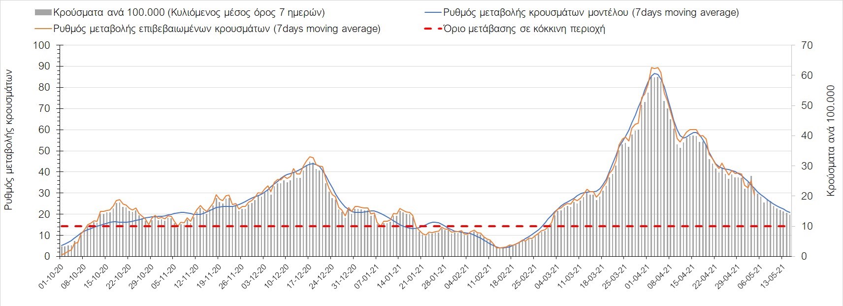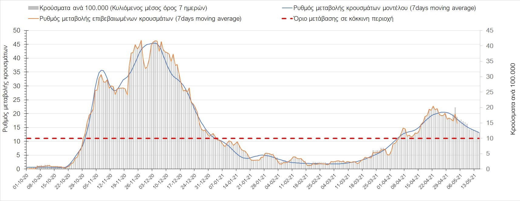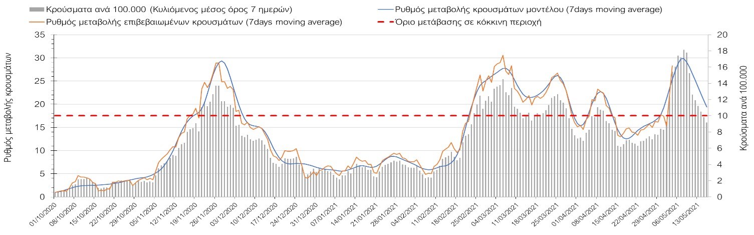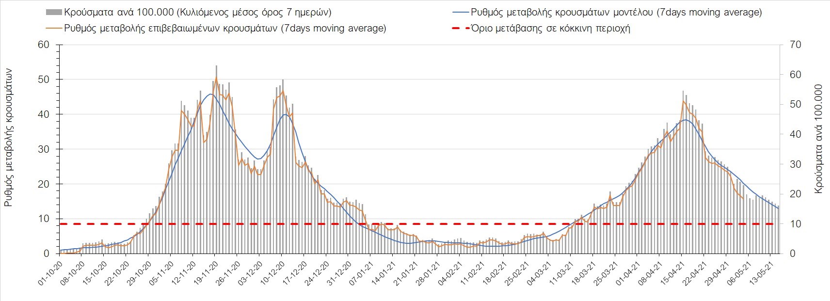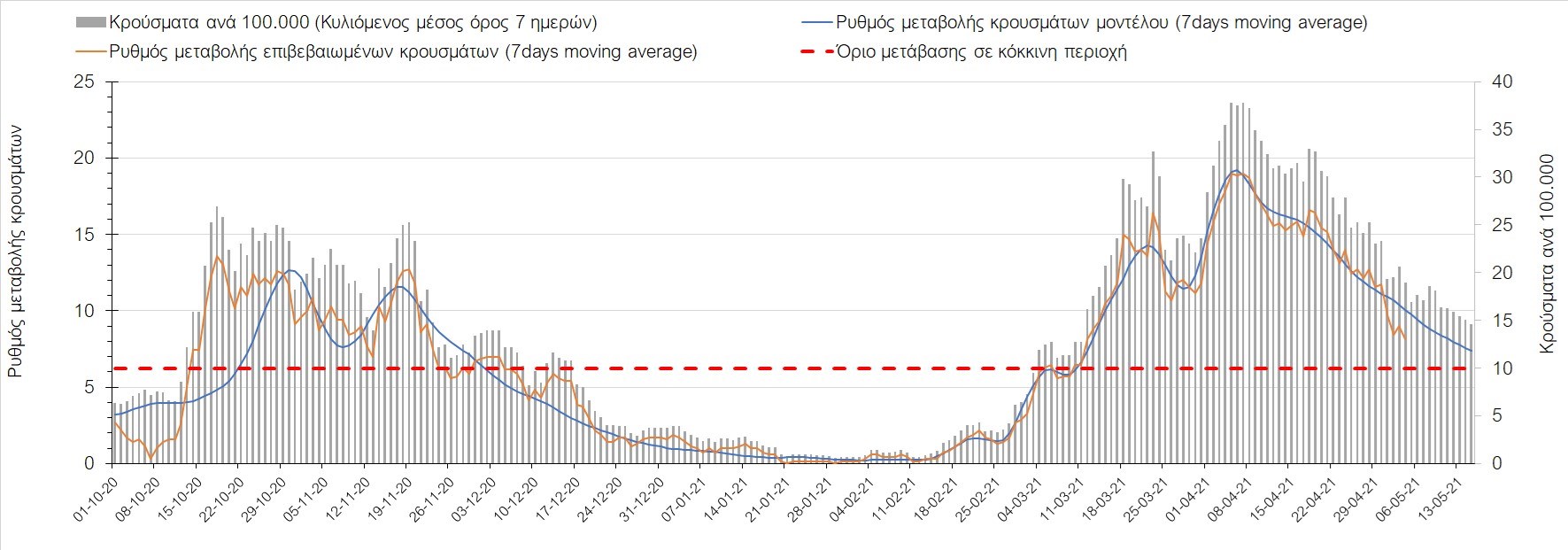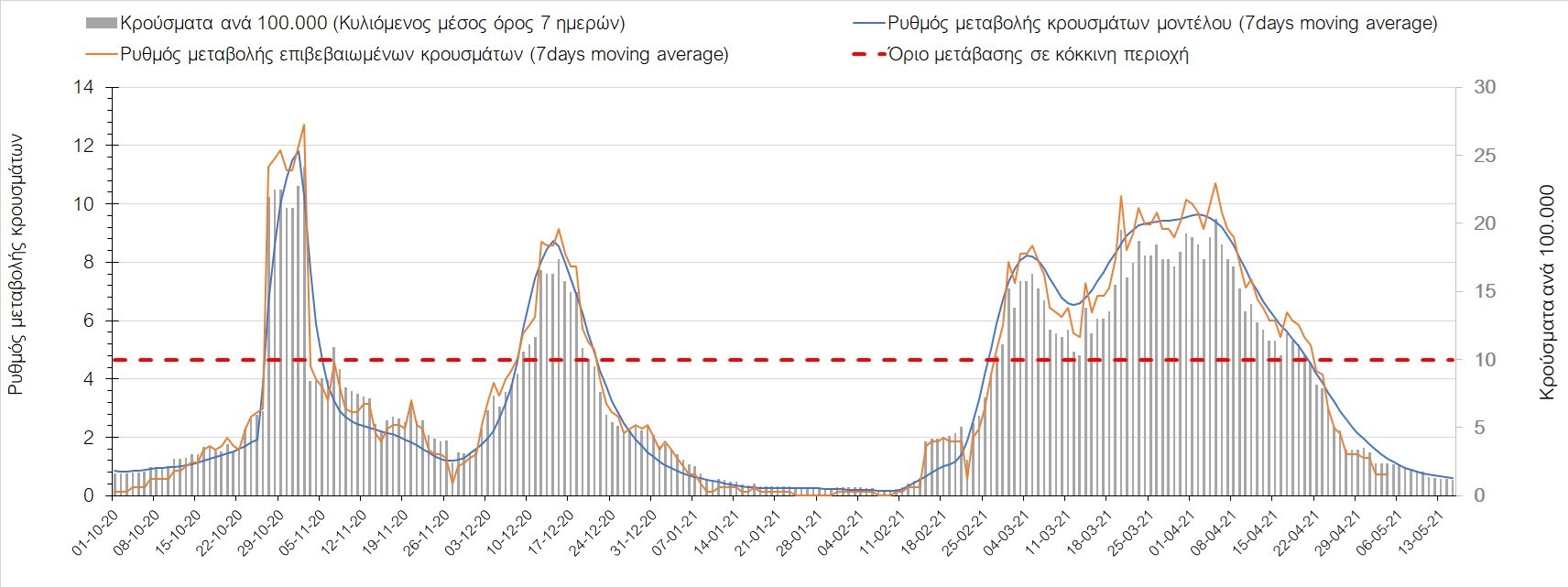 Σχήμα 44. Πορεία του ημερησίου αριθμού των κρουσμάτων (κυλιόμενος μέσος όρος 7 ημερών) στον ΈβροΣτο Ηράκλειο, όπου εντοπίστηκαν 30 κρούσματα την Τρίτη, παρατηρείται αύξηση σε σχέση με τη Δευτέρα (Σχήμα 45). Λόγω των έντονων διακυμάνσεων που σημειώθηκαν στην πορεία της πανδημίας ως αποτέλεσμα του πολύ μεγάλου αριθμού φορέων του μεταλλαγμένου στελέχους Β.1.1.7, το Ηράκλειο είχε μεγάλη διασπορά του ιού και αυτή η δυναμική καθυστέρησε τον αποχαρακτηρισμό της περιοχής ως κόκκινη, η οποία με βάση την πορεία των τελευταίων ημερών, αναμένουμε να συμβεί στις επόμενες ημέρες. Στα Χανιά με 27 κρούσματα την Τρίτη (Σχήμα 46) έχουμε αύξηση σε σχέση με προχθές, και υπάρχουν έντονες διακυμάνσεις που δυσχεραίνουν τη συστηματική αποκλιμάκωση. Τα Χανιά θα παραμείνουν ανάμεσα στις κόκκινες περιοχές όλη την πρώτη εβδομάδα του Μαΐου. Αύξηση κρουσμάτων παρατηρείται στο Ρέθυμνο με 3 κρούσματα, στο οποίο η έντονα ανοδική τάση της προηγούμενης εβδομάδας, έχει περιέλθει σε πορεία ισχυρής αποκλιμάκωσης (Σχήμα 47), που έχει φέρει την περιοχή στο όριο του αποχαρακτηρισμού ως κόκκινη. Στο Λασίθι παρατηρείται σταθεροποίηση σε σχέση με προχθές, καθώς εντοπίστηκαν 4 κρούσματα την Τρίτη, και παρατηρούνται έντονες διακυμάνσεις (Σχήμα 48), οι οποίες όμως διατηρούνται κάτω από το όριο της κόκκινης περιοχής.