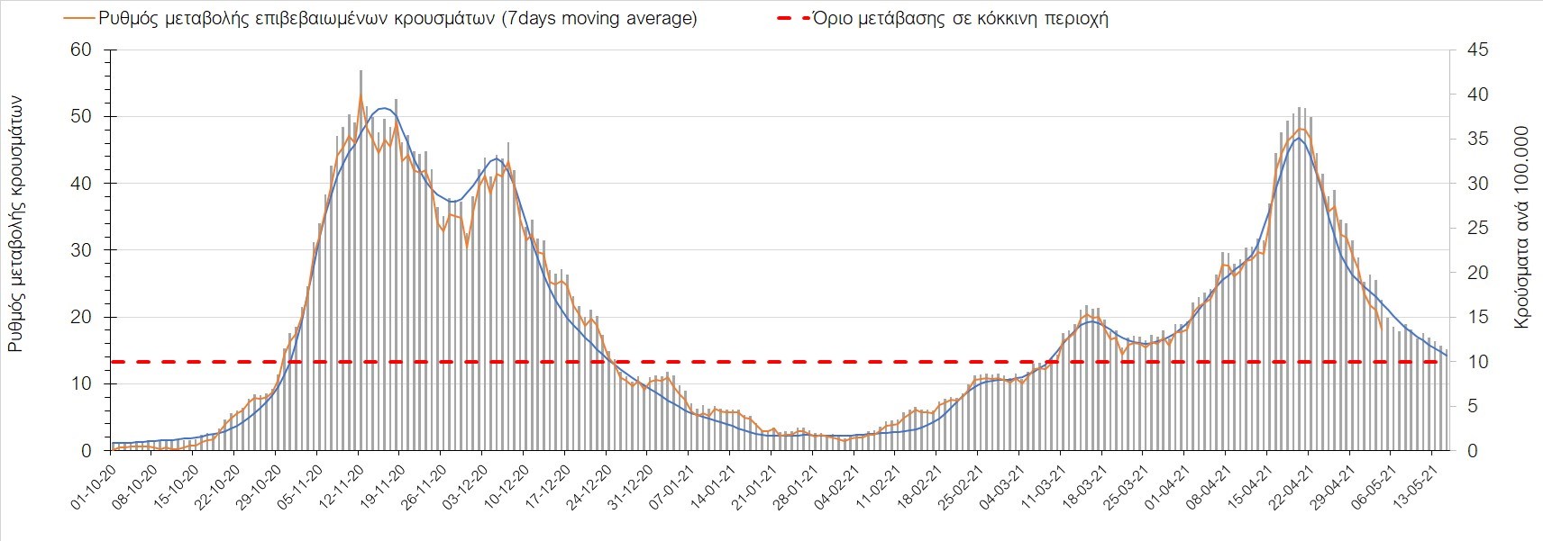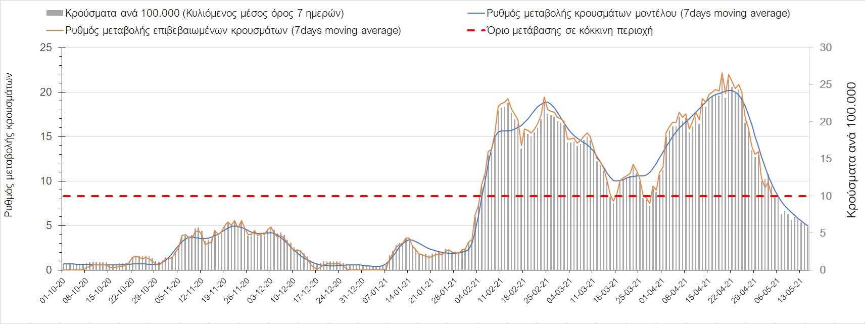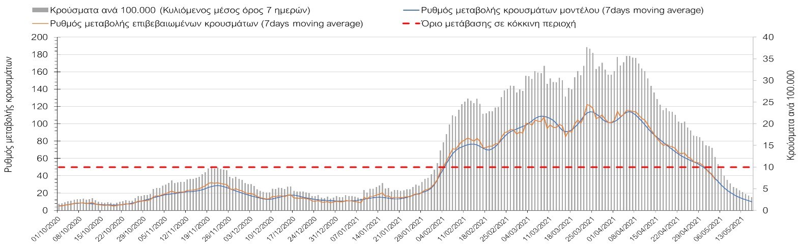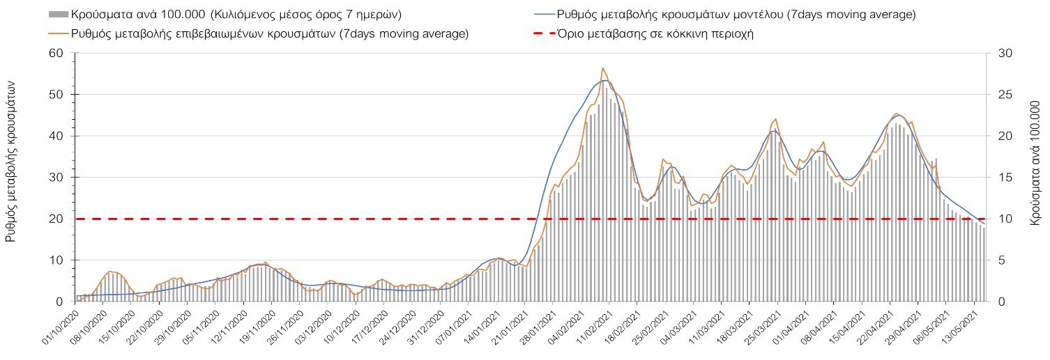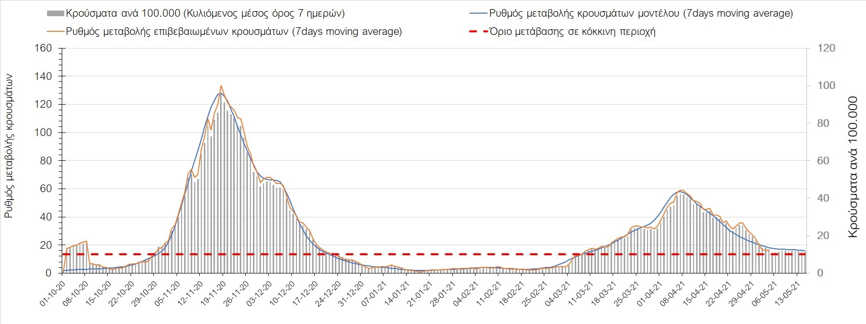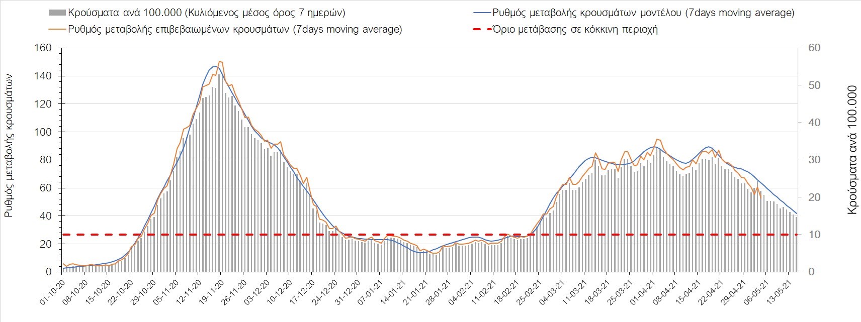 Σχήμα 44. Πορεία του ημερησίου αριθμού των κρουσμάτων (κυλιόμενος μέσος όρος 7 ημερών) στον ΈβροΣτο Ηράκλειο, όπου εντοπίστηκαν 30 κρούσματα την Τρίτη, παρατηρείται αύξηση σε σχέση με τη Δευτέρα (Σχήμα 45). Λόγω των έντονων διακυμάνσεων που σημειώθηκαν στην πορεία της πανδημίας ως αποτέλεσμα του πολύ μεγάλου αριθμού φορέων του μεταλλαγμένου στελέχους Β.1.1.7, το Ηράκλειο είχε μεγάλη διασπορά του ιού και αυτή η δυναμική καθυστέρησε τον αποχαρακτηρισμό της περιοχής ως κόκκινη, η οποία με βάση την πορεία των τελευταίων ημερών, αναμένουμε να συμβεί στις επόμενες ημέρες. Στα Χανιά με 27 κρούσματα την Τρίτη (Σχήμα 46) έχουμε αύξηση σε σχέση με προχθές, και υπάρχουν έντονες διακυμάνσεις που δυσχεραίνουν τη συστηματική αποκλιμάκωση. Τα Χανιά θα παραμείνουν ανάμεσα στις κόκκινες περιοχές όλη την πρώτη εβδομάδα του Μαΐου. Αύξηση κρουσμάτων παρατηρείται στο Ρέθυμνο με 3 κρούσματα, στο οποίο η έντονα ανοδική τάση της προηγούμενης εβδομάδας, έχει περιέλθει σε πορεία ισχυρής αποκλιμάκωσης (Σχήμα 47), που έχει φέρει την περιοχή στο όριο του αποχαρακτηρισμού ως κόκκινη. Στο Λασίθι παρατηρείται σταθεροποίηση σε σχέση με προχθές, καθώς εντοπίστηκαν 4 κρούσματα την Τρίτη, και παρατηρούνται έντονες διακυμάνσεις (Σχήμα 48), οι οποίες όμως διατηρούνται κάτω από το όριο της κόκκινης περιοχής.