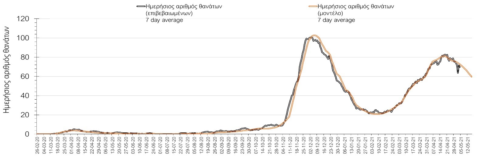Σχήμα 3. Αριθμός θανάτων (κυλιόμενος μέσος όρος 7 ημερών) σύμφωνα με τα στοιχεία του ΕΟΔΥ και τις προβλέψεις της υπολογιστικής πλατφόρμας CORE.Η πορεία της μέσης εβδομαδιαίας τιμής των κρουσμάτων, καθώς και του κυλιόμενου μέσου όρου 7 ημερών του αριθμού των κρουσμάτων ανά 100.000 πληθυσμού, όπως έχουν καταγραφεί από τον ΕΟΔΥ και η αναμενόμενη πορεία τους όπως προδιαγράφεται από την υπολογιστική πλατφόρμα CORE για την Ελληνική επικράτεια μέχρι τις 15 Μαΐου, αποτυπώνονται στο Σχήμα 4. Συνολικά αναμένουμε να συνεχιστεί η πορεία αποκλιμάκωσης, η οποία ίσως επιβραδυνθεί προσωρινά από το συνδυασμένο άνοιγμα της εστίασης στις 2 Μαΐου, και των προβλεπόμενων βαθμίδων εκπαίδευσης (Δημοτικά και Γυμνάσια) στις 10 Μαΐου. Αξίζει να σημειωθεί, ότι αυτή η προβλεπόμενη πορεία, που αφορά τόσο τα κρούσματα, όσο και τις ΜΕΘ και τους θανάτους, βασίζεται στις ακόλουθες παραδοχές: