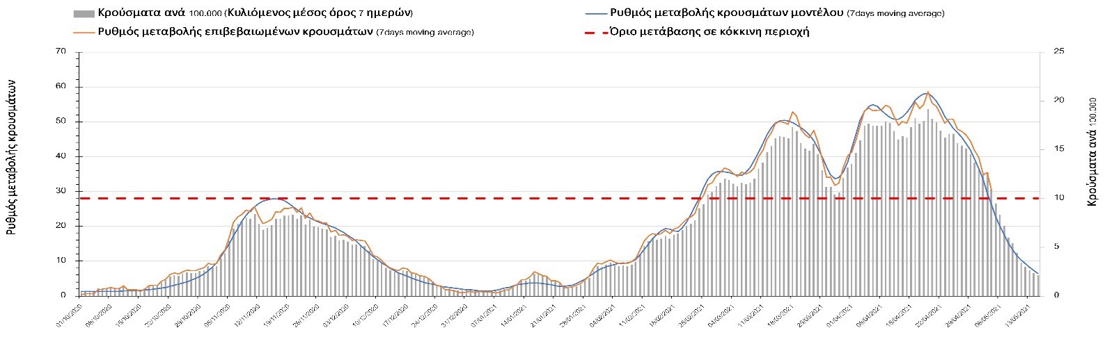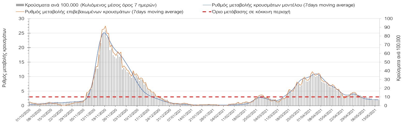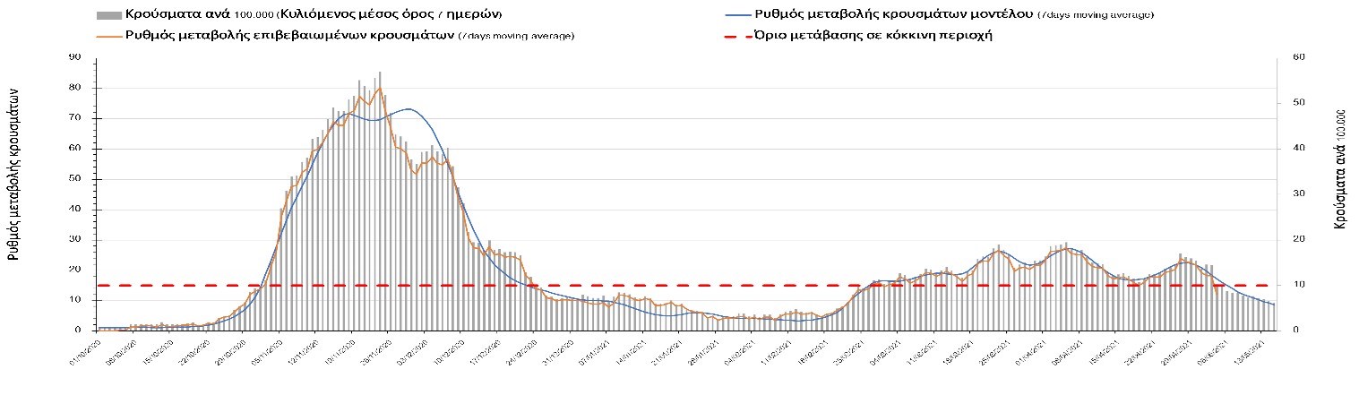 Σχήμα 52. Πορεία του ημερησίου αριθμού των κρουσμάτων (κυλιόμενος μέσος όρος 7 ημερών) στην ΘάσοΣυμπεράσματα:Με βάση τα αποτελέσματα της Τρίτης, είχαμε μείωση στον αριθμό των ασθενών σε κρίσιμη κατάσταση (διασωληνωμένοι σε ΜΕΘ) σε σχέση με τη Δευτέρα, και διαφαίνεται πολύ ελαφρά κάμψη συνολικά, η οποία εκφράζεται και στον αριθμό των θανάτων. Οι προβλέψεις αυτές συνάδουν με τις προσομοιώσεις του μοντέλου CORE, όπως και ο αριθμός των κρουσμάτων, μετά και τις επικαιροποιημένες προβλέψεις προ 2 μηνών, όπου ελήφθη υπόψιν η μεγαλύτερη διασπορά των μεταλλαγμένων και ταχύτερα μεταδιδόμενων στελεχών. Σε πανελλαδικό επίπεδο ο κυλιόμενος εβδομαδιαίος μέσος όρος του δείκτη θετικότητας διαμορφώθηκε στο 5,1% (η ημερήσια τιμή την Τρίτη είναι 6,4%) ενώ ο κυλιόμενος εβδομαδιαίος μέσος όρος του πραγματικού αριθμού αναπαραγωγής Rt (δηλαδή ο αριθμός των ατόμων που ένας φορέας μπορεί να επιμολύνει) διαμορφώθηκε στο 0,81 (τιμές του Rt κάτω από τη μονάδα υποδηλώνουν καθαρή μείωση της διασποράς του ιού στην κοινότητα). Η ταυτόχρονη μείωση και των δύο δεικτών, που παρατηρήθηκε τις προηγούμενες ημέρες και συνεχίζεται και αυτή την εβδομάδα, υποδηλώνει την κάμψη της ανοδικής τάσης στο σύνολο της χώρας. Εντούτοις, όπως επισημάνθηκε, προβληματίζει η σχετική ανακολουθία της πορείας των διασωληνωμένων, κυρίως στην Αττική, στη Θεσσαλονίκη και σε μικρότερο βαθμό στο σύνολο της χώρας. Αξίζει να σημειωθεί, ότι η συνολικά καλή πορεία που έχει διαμορφωθεί, είναι σημαντικό να διαφυλαχθεί τις ημέρες του Πάσχα, συνεπικουρούμενη από την απαγόρευση των διαπεριφερειακών μετακινήσεων. Επίσης, παρά τις συνεχόμενες ημέρες αργίας, είναι σημαντικό να διατηρηθεί στο μέτρο του δυνατού η διαδικασία των τεστ ανίχνευσης, έτσι ώστε να μπορούμε να έχουμε καλή εικόνα της διασποράς της πανδημίας στις επόμενες ημέρες, όπου συνδυάζονται με ανοίγματα που είτε ξεκίνησαν (εστίαση) είτε αναμένονται (άνοιγμα Δημοτικών και Γυμνασίων).Η ήπια αναχαίτιση του 3ου κύματος που παρατηρείται, οφείλεται σε ένα συνδυασμό παραμέτρων, οι οποίες είναι η συνέχιση του lockdown, η χρήση των self-test, η αύξηση του αριθμού των τεστ από τον ΕΟΔΥ, γεγονός που συντελεί στην απομάκρυνση από τις αλυσίδες μετάδοσης των ασυμπτωματικών και προσυμπτωματικών φορέων, η προοδευτική βελτίωση του καιρού και σε μικρότερο βαθμό η πρόοδος των εμβολιασμών, η σημασία των οποίων στον έλεγχο της πανδημίας θα αρχίσει να είναι πιο εμφανής από το τέλος του επόμενου μήνα. Όμως, με δεδομένο το άνοιγμα του λιανικού εμπορίου και των Λυκείων, είναι ακόμα πιο σημαντική η τήρηση των μέτρων, ενώ ύψιστης σημασίας στις επόμενες εβδομάδες θα αποδειχθεί η ορθή και μαζική εφαρμογή των self-test, με ταυτόχρονη αύξηση της ιχνηλασίας των επαφών των ανιχνευθέντων ως θετικοί και καραντίνα 14 ημερών για τους συμπολίτες μας που θα επιβεβαιωθεί ότι είναι θετικοί στην μόλυνση με SARS-CoV-2 ακόμη και αν είναι ασυμπτωματικοί. Δεδομένου ότι τελικά ο αριθμός των self-test που πραγματοποιούνται ημερησίως δεν έχει φθάσει στα επιθυμητά νούμερα στα οποία βασίζονται οι προβολές που παρουσιάζονται στην παρούσα τεχνική έκθεση μέχρι το Πάσχα, μόλις έχουμε νεώτερα για τον ακριβή αριθμό τους και τη συχνότητα εκτέλεσης αυτών, θα επαναεπικαιροποιήσουμε τις προβλέψεις μας. Αξίζει επίσης να σημειωθεί ότι στην Αθήνα τις τελευταίες ημέρες παρατηρήθηκαν συρροές, οι πιθανές επιπτώσεις των οποίων θ