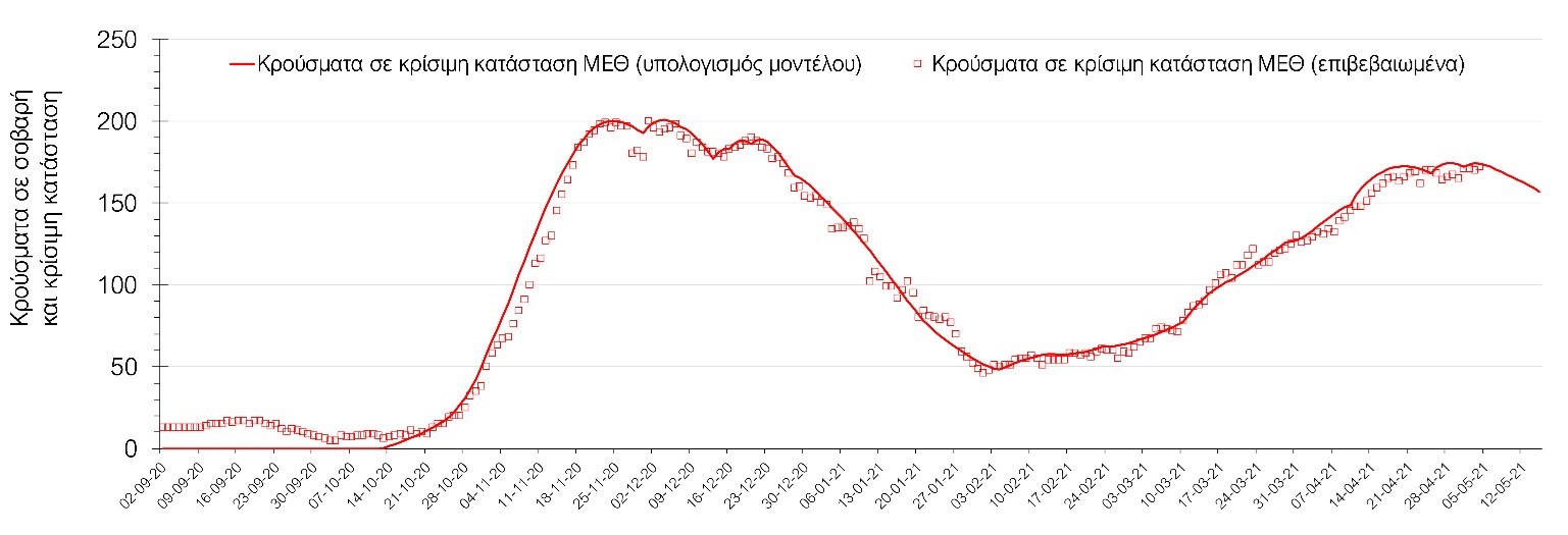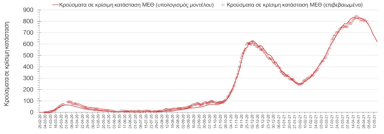 Σύμφωνα με τα στοιχεία του ΕΟΔΥ, ο αριθμός κρουσμάτων την Τρίτη ανήλθε σε 1387 νέα κρούσματα, με τα αποτελέσματα να συνάδουν με τις προβλέψεις της υπολογιστικής πλατφόρμας CORE (n=1237). Ο αριθμός των τεστ που πραγματοποιήθηκαν την Τρίτη ήταν 21511 και σε συνδυασμό με τον αριθμό των κρουσμάτων, ο δείκτης θετικότητας διαμορφώθηκε στο 6,4%. Η πραγματοποίηση αριθμού τεστ σε επίπεδα άνω των 50.000 την ημέρα (όπως και πραγματοποιείται τις τελευταίες ημέρες), συντελεί στο να εξάγουμε πιο ασφαλή συμπεράσματα σχετικά με την πορεία της πανδημίας, αλλά και να εντοπίζονται περισσότεροι ασυμπτωματικοί και προσυμπτωματικοί, συντελώντας στον περιορισμό της πανδημίας. Γενικά όμως θα πρέπει να αυξηθεί κι άλλο ο αριθμός των τεστ ανίχνευσης του SARS-CoV-2 χρησιμοποιώντας τα rapid test και τα fast test για να καταπολεμηθεί η δυναμική αύξησης της διασποράς στις περιοχές όπου μια τέτοια αύξηση διαφαίνεται από τα μέχρι τώρα δεδομένα και την υπολογιστική πλατφόρμα CORE.Ο αριθμός ημερήσιων θανάτων (81) που καταγράφηκε την Τρίτη είναι χαμηλότερος σε σχέση με τη Δευτέρα (134 σε ένα 48ωρο) και όπως είχαμε προβλέψει από την προηγούμενη εβδομάδα, ο κυλιόμενος εβδομαδιαίος μέσος όρος που σήμερα είναι 70 έχει ξεκινήσει ήπια αποκλιμάκωση σε συνδυασμό με την πτωτική πορεία του αριθμού των κρουσμάτων.Όσον αφορά στους ασθενείς σε κρίσιμη κατάσταση (διασωληνωμένοι σε ΜΕΘ), την Τρίτη ο αριθμός τους μειώθηκε σε σχέση με τη Δευτέρα (783 από 797). Παρά τις παρατηρούμενες διακυμάνσεις, διαφαίνεται να έχει ξεκινήσει η αποκλιμάκωση με βάση την επικαιροποιημένη πρόβλεψη (αυτό βέβαια με την παραδοχή ότι θα συνεχίσουν να τηρούνται τα ισχύοντα μέτρα, συμπεριλαμβανομένων των προβλεπόμενων self-test και ανοίγματα δραστηριοτήτων υψηλού συγχρωτισμού, όπως τα mall και η εστίαση θα γίνουν με την κατάλληλη προετοιμασία), η οποία όμως είναι αργή και έχει διακυμάνσεις. Αξίζει να σημειωθεί ότι ο αριθμός των ασθενών σε κρίσιμη κατάσταση όπως και των θανάτων είναι αναλογικά χαμηλότερος σε σχέση με τα αντίστοιχα μεγέθη στο δεύτερο κύμα, τόσο λόγω των εμβολιασμών ευπαθών ομάδων, όσο και του υψηλότερου αριθμού τεστ ανίχνευσης, που συντελεί στον εντοπισμό περισσότερων ασυμπτωματικών ή ήπια συμπτωματικών κρουσμάτων. Επίσης, η διασπορά των μεταλλαγμένων στελεχών που έχουν μεγαλύτερη μεταδοτικότητα από το στέλεχος του SARS-CoV-2 που κυριαρχούσε μέχρι το τέλος Φεβρουαρίου και η αυξημένη κινητικότητα του πληθυσμού έχουν μεγαλώσει το ποσοστό των νεότερων ηλικιών που μολύνονται με αποτέλεσμα η μέση ηλικία των μολύνσεων να έχει πέσει σημαντικά. Η καμπύλη εξέλιξης του αριθμού των ασθενών που νοσηλεύονται σε κλίνες ΜΕΘ με βάση τις προσομοιώσεις της πλατφόρμας CORE, όπως αυτή παρουσιάζεται στο Σχήμα 1, των ασθενών που νοσηλεύονται σε απλές κλίνες στο Σχήμα 2, ενώ μια εκτίμηση για την πορεία των θανάτων ανά ημέρα παρουσιάζεται στο Σχήμα 3.