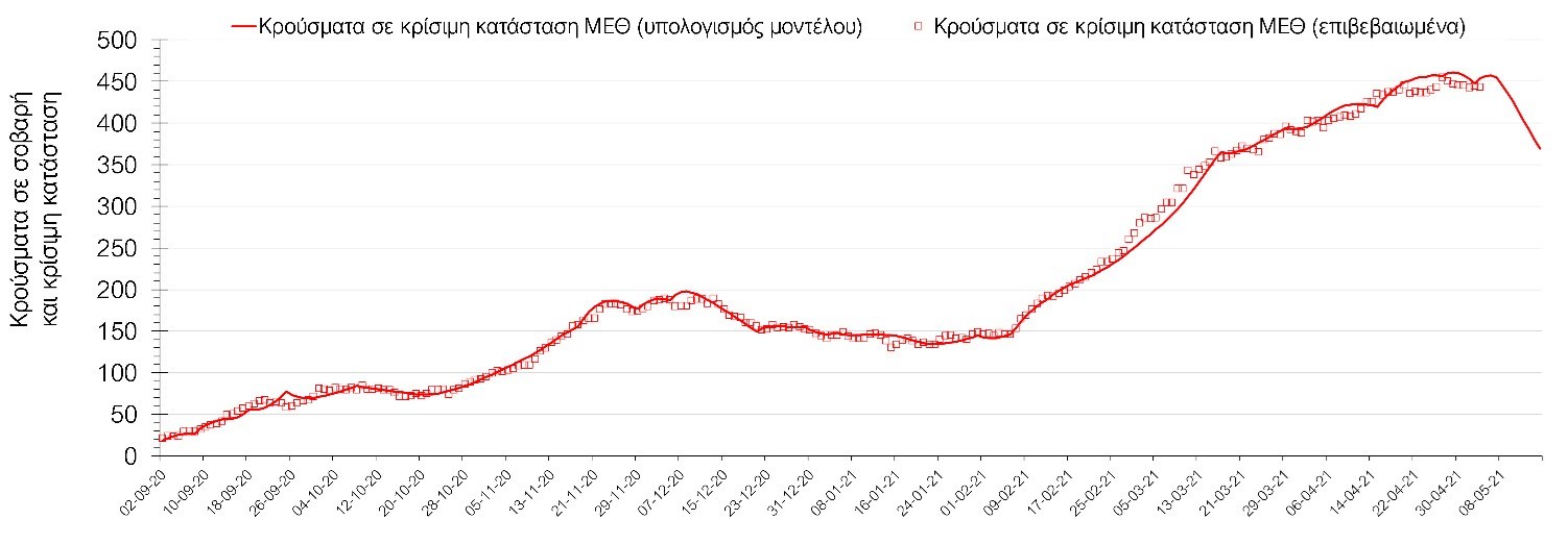 Σχήμα 6. Αριθμός κρουσμάτων σε κρίσιμη κατάσταση (ΜΕΘ) σύμφωνα με τα στοιχεία του ΕΟΔΥ και τις προβλέψεις της υπολογιστικής πλατφόρμας CORE στην ΑθήναΑυτό που προβληματίζει στην Αττική είναι η αύξηση του αριθμού των διασωληνωμένων (αν και εδώ και τρεις ημέρες παρατηρήθηκε μικρή πτώση που ελπίζουμε να συνεχιστεί), η οποία δε συνάδει με τη συνολική πορεία των κρουσμάτων, τα οποία βρίσκονται σε καθοδική πορεία, εδώ και 3 εβδομάδες. Παραπλήσια πλέον είναι και η κατάσταση στη Θεσσαλονίκη, στην οποία επίσης παρατηρείται αυξημένος αριθμός διασωληνωμένων (Σχήμα 8) σε σχέση με τα κρούσματα (Σχήμα 7). Η πορεία της διασποράς στη Θεσσαλονίκη (Σχήμα 7), αν και στις αρχές Μαρτίου ακολουθούσε τη σχετικά ήπια αύξηση που αναμέναμε, με τα δεδομένα των 395 νέων κρουσμάτων στις 9/3, των 394 στις 17/3 των 535 στις 30/3 μας έχουν οδηγήσει σε αναθεώρηση των προβλέψεων λόγω της επίσης μεγαλύτερη παρουσίας των μεταλλαγμένων στελεχών. Σύμφωνα με τις αναθεωρημένες εκτιμήσεις, αναμένεται να συνεχίσει η αργή αποκλιμάκωση των κρουσμάτων που ξεκίνησε από τις 21 Απριλίου. Η πορεία των κρουσμάτων σε κρίσιμη κατάσταση (διασωληνωμένοι σε ΜΕΘ) στη Θεσσαλονίκη, παρουσιάζονται στο Σχήμα 8.