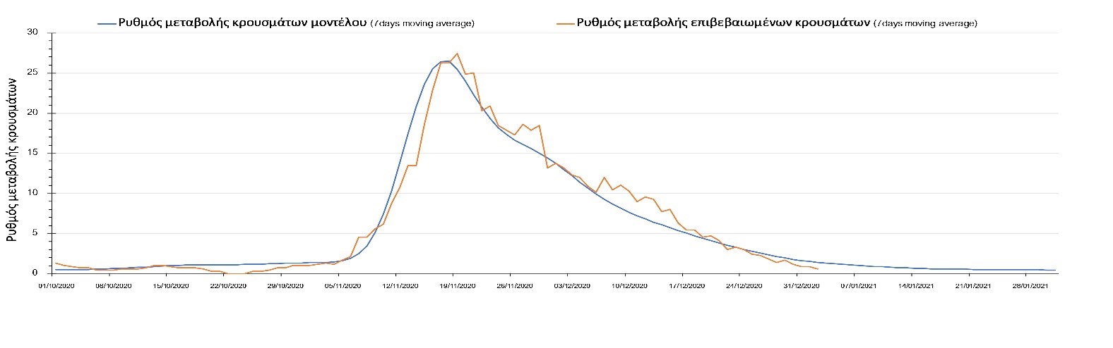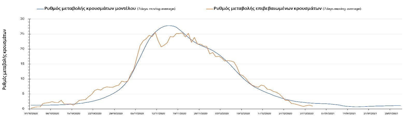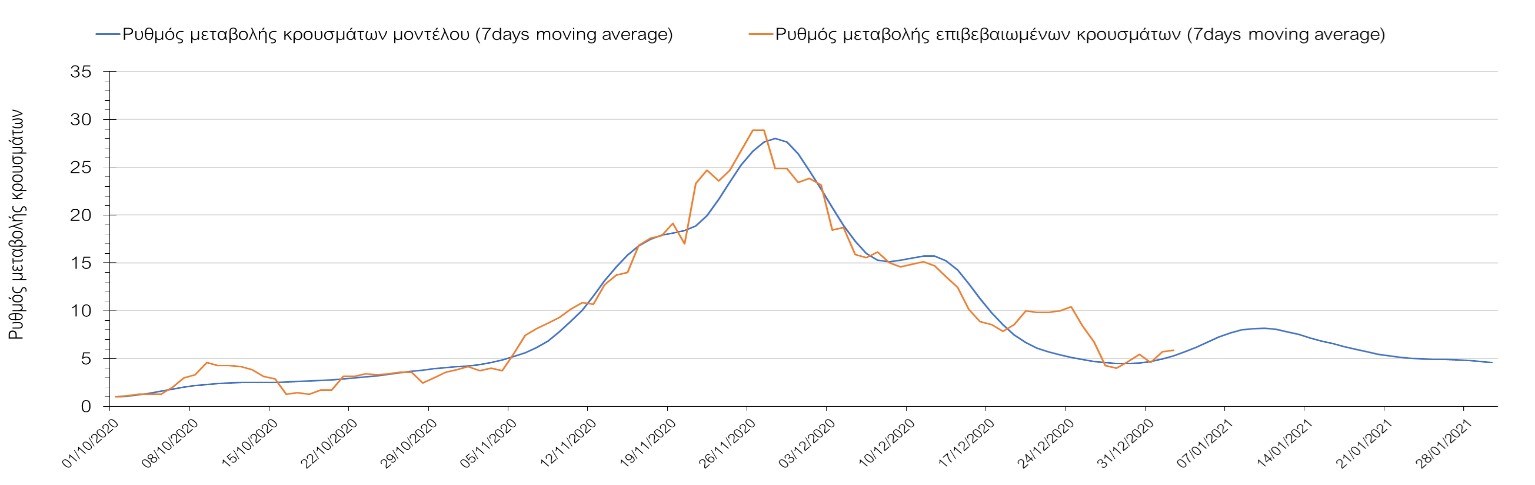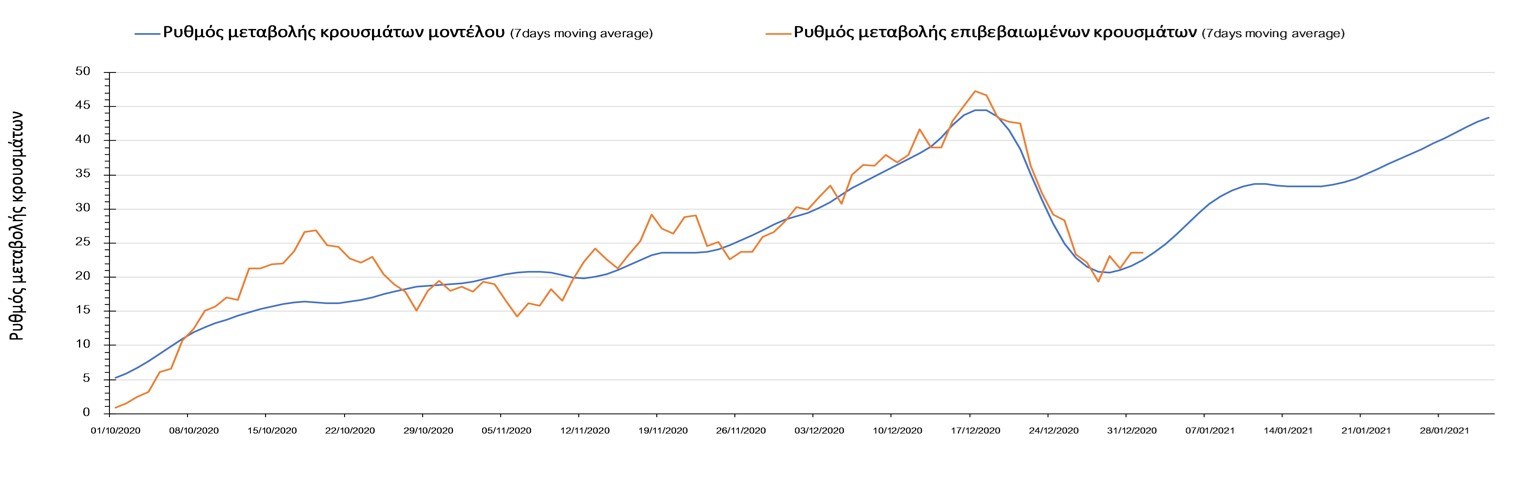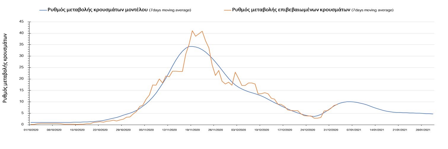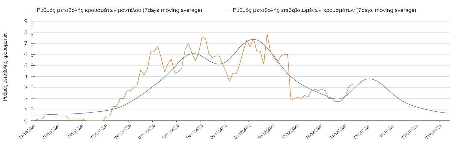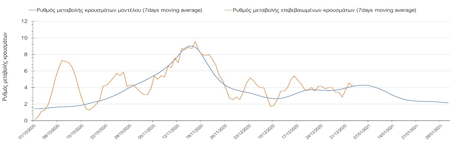 Η πορεία της μέσης εβδομαδιαίας τιμής των κρουσμάτων όπως έχουν καταγραφεί από τον ΕΟΔΥ και η αναμενόμενη πορεία τους όπως προδιαγράφεται από την υπολογιστική πλατφόρμα CORE για την Ελληνική επικράτεια μέχρι το τέλος του Ιανουαρίου, αποτυπώνονται στο Σχήμα 3. Στις προβλέψεις έχει συμπεριληφθεί η απόφαση εφαρμογής αυστηρού lockdown από την Κυριακή 3 Ιανουαρίου μέχρι και τις 10 Ιανουαρίου, ενώ στις 11 Ιανουαρίου προβλέπεται άνοιγμα των σχολείων όλων των βαθμίδων, καθώς ξανά και των κομμωτηρίων αλλά και των καταστημάτων με τη μέθοδο του click-away. Το ίδιο σενάριο μέτρων, έχει ληφθεί υπόψιν στα αποτελέσματα του μοντέλου που παρουσιάζονται και στις υπόλοιπες περιοχές.