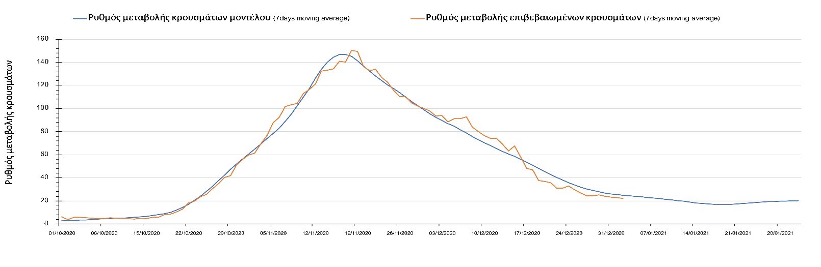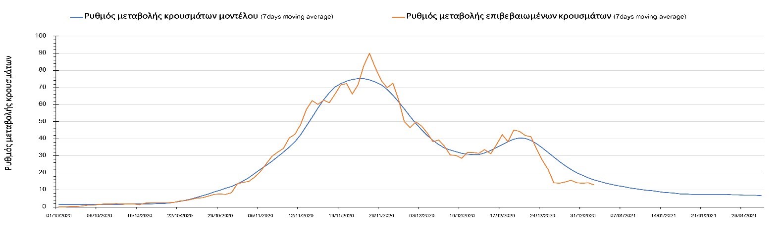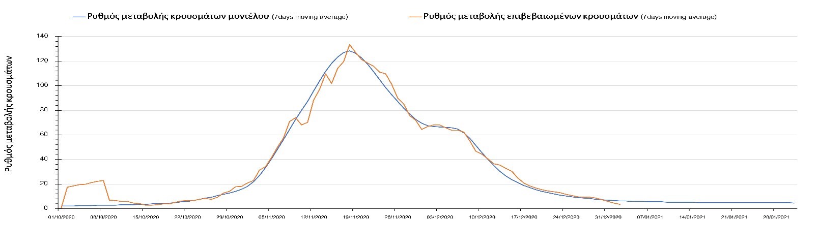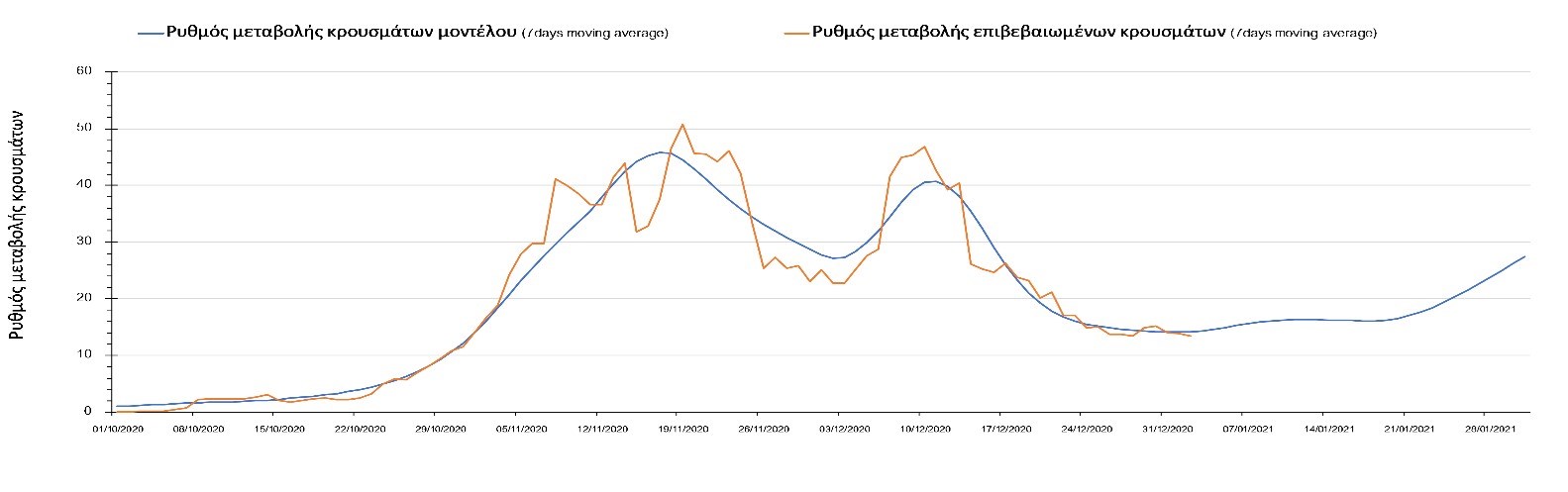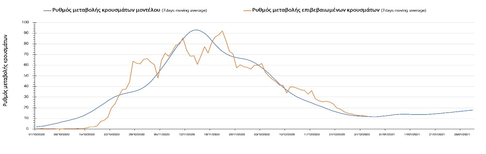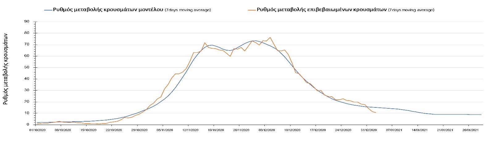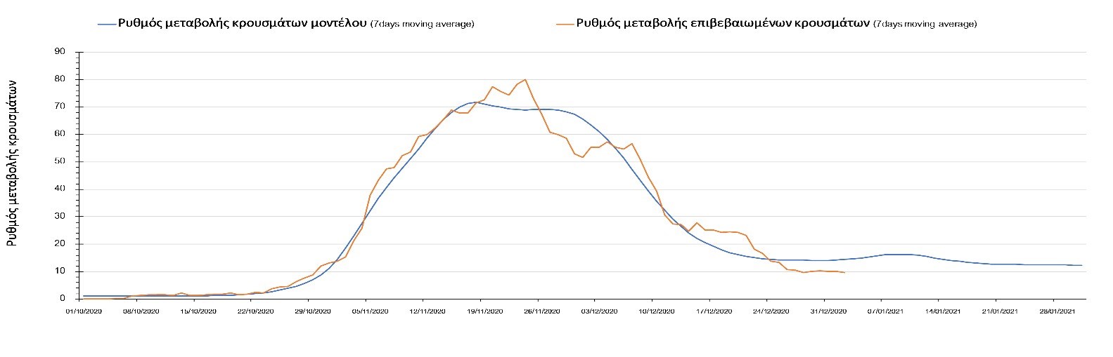 Η πορεία της μέσης εβδομαδιαίας τιμής των κρουσμάτων όπως έχουν καταγραφεί από τον ΕΟΔΥ και η αναμενόμενη πορεία τους όπως προδιαγράφεται από την υπολογιστική πλατφόρμα CORE για την Ελληνική επικράτεια μέχρι το τέλος του Ιανουαρίου, αποτυπώνονται στο Σχήμα 3. Στις προβλέψεις έχει συμπεριληφθεί η απόφαση εφαρμογής αυστηρού lockdown από την Κυριακή 3 Ιανουαρίου μέχρι και τις 10 Ιανουαρίου, ενώ στις 11 Ιανουαρίου προβλέπεται άνοιγμα των σχολείων όλων των βαθμίδων, καθώς ξανά και των κομμωτηρίων αλλά και των καταστημάτων με τη μέθοδο του click-away. Το ίδιο σενάριο μέτρων, έχει ληφθεί υπόψιν στα αποτελέσματα του μοντέλου που παρουσιάζονται και στις υπόλοιπες περιοχές.