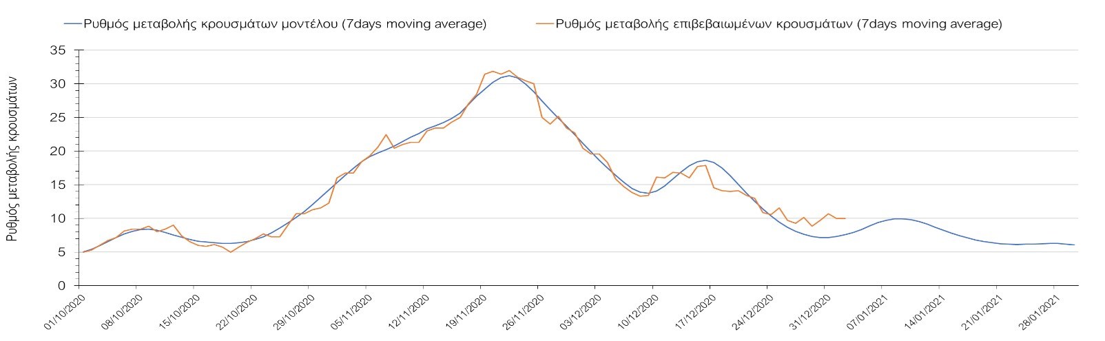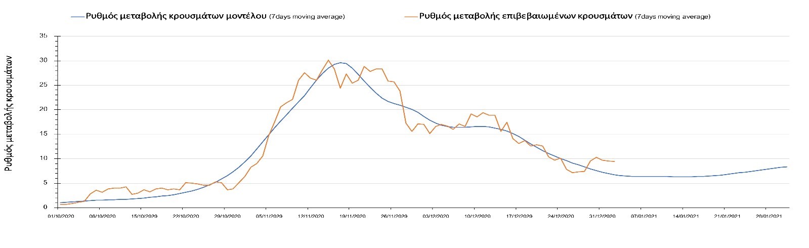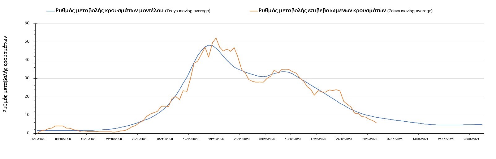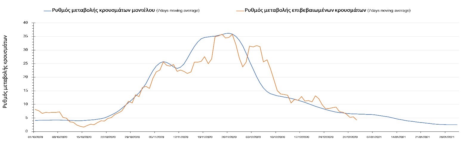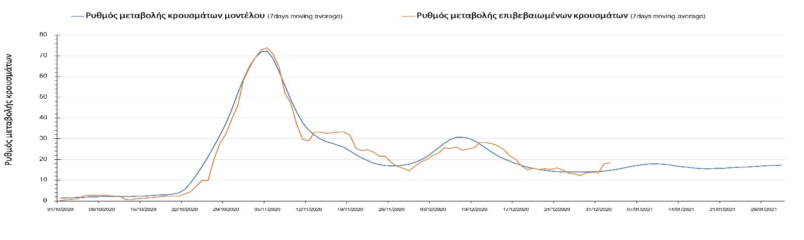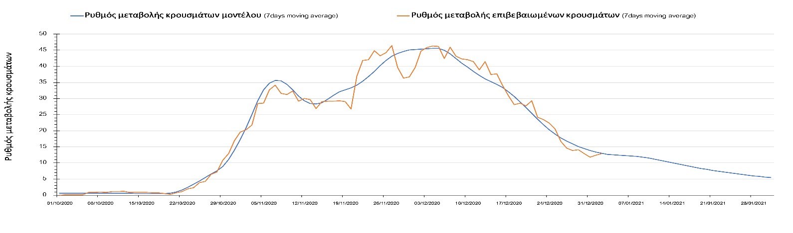 Η πορεία της μέσης εβδομαδιαίας τιμής των κρουσμάτων όπως έχουν καταγραφεί από τον ΕΟΔΥ και η αναμενόμενη πορεία τους όπως προδιαγράφεται από την υπολογιστική πλατφόρμα CORE για την Ελληνική επικράτεια μέχρι το τέλος του Ιανουαρίου, αποτυπώνονται στο Σχήμα 3. Στις προβλέψεις έχει συμπεριληφθεί η απόφαση εφαρμογής αυστηρού lockdown από την Κυριακή 3 Ιανουαρίου μέχρι και τις 10 Ιανουαρίου, ενώ στις 11 Ιανουαρίου προβλέπεται άνοιγμα των σχολείων όλων των βαθμίδων, καθώς ξανά και των κομμωτηρίων αλλά και των καταστημάτων με τη μέθοδο του click-away. Το ίδιο σενάριο μέτρων, έχει ληφθεί υπόψιν στα αποτελέσματα του μοντέλου που παρουσιάζονται και στις υπόλοιπες περιοχές.