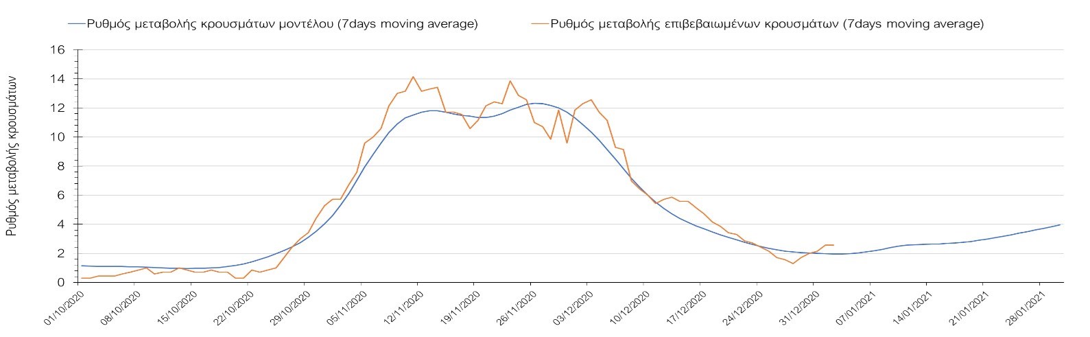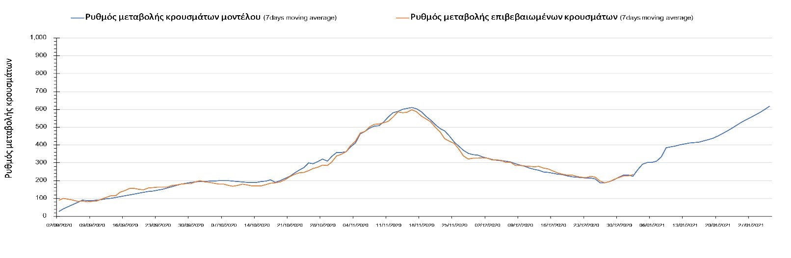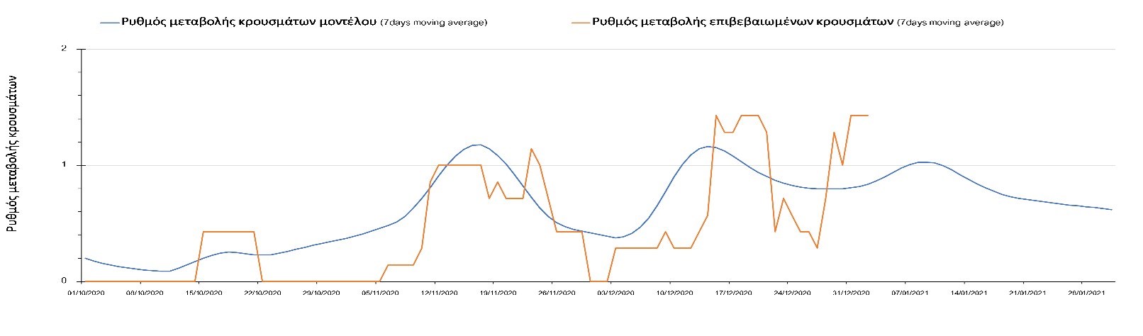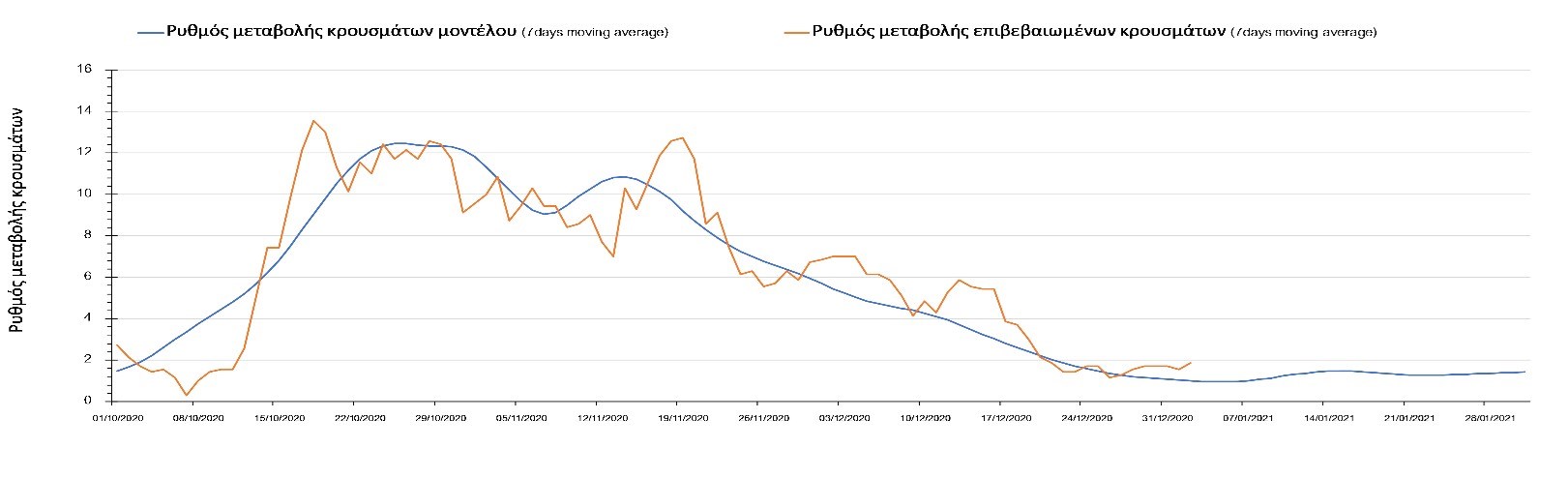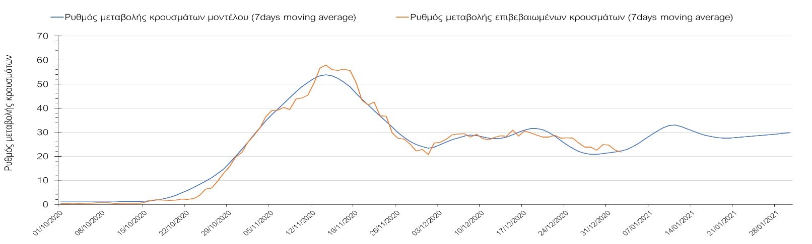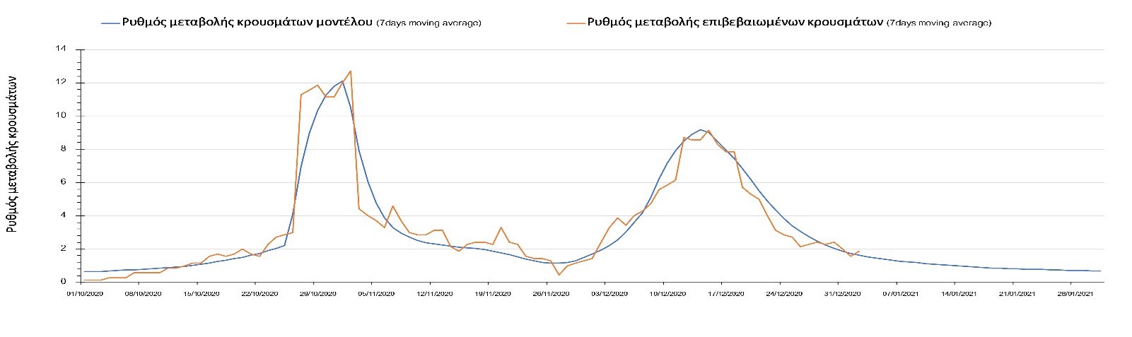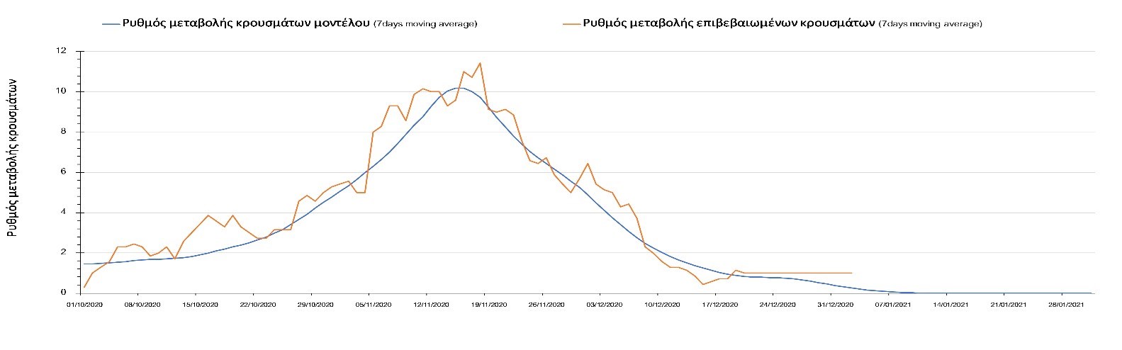 Η πορεία της μέσης εβδομαδιαίας τιμής των κρουσμάτων όπως έχουν καταγραφεί από τον ΕΟΔΥ και η αναμενόμενη πορεία τους όπως προδιαγράφεται από την υπολογιστική πλατφόρμα CORE για την Ελληνική επικράτεια μέχρι το τέλος του Ιανουαρίου, αποτυπώνονται στο Σχήμα 3. Στις προβλέψεις έχει συμπεριληφθεί η απόφαση εφαρμογής αυστηρού lockdown από την Κυριακή 3 Ιανουαρίου μέχρι και τις 10 Ιανουαρίου, ενώ στις 11 Ιανουαρίου προβλέπεται άνοιγμα των σχολείων όλων των βαθμίδων, καθώς ξανά και των κομμωτηρίων αλλά και των καταστημάτων με τη μέθοδο του click-away. Το ίδιο σενάριο μέτρων, έχει ληφθεί υπόψιν στα αποτελέσματα του μοντέλου που παρουσιάζονται και στις υπόλοιπες περιοχές.
