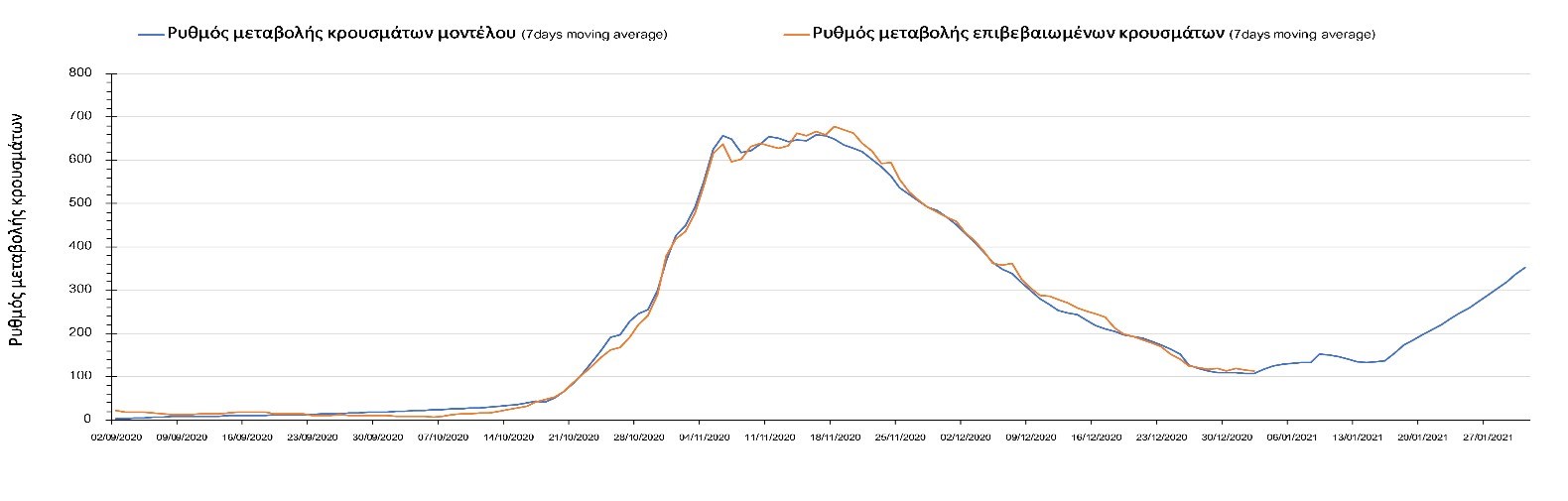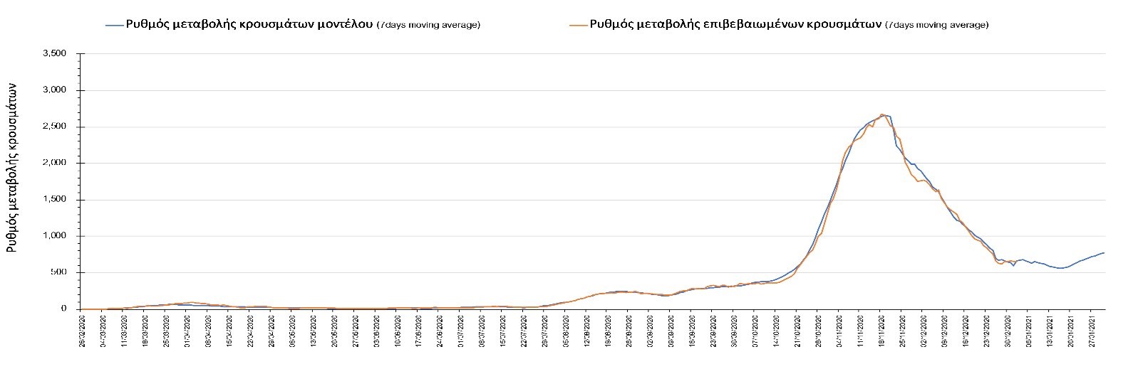 Σχήμα 4. Πορεία του ημερησίου αριθμού των κρουσμάτων (κυλιόμενος μέσος όρος 7 ημερών) στην Αττική