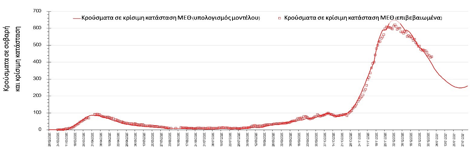 Σχήμα 1. Αριθμός κρουσμάτων σε κρίσιμη κατάσταση (ΜΕΘ) σύμφωνα με τα στοιχεία του ΕΟΔΥ και τις προβλέψεις της υπολογιστικής πλατφόρμας CORE.
