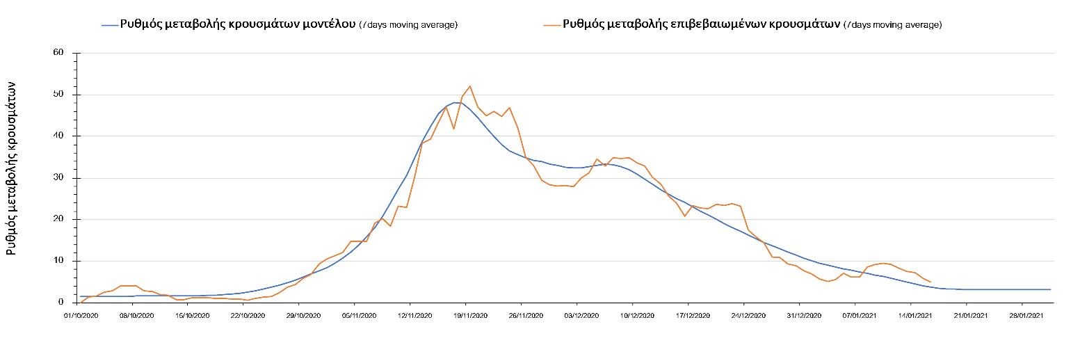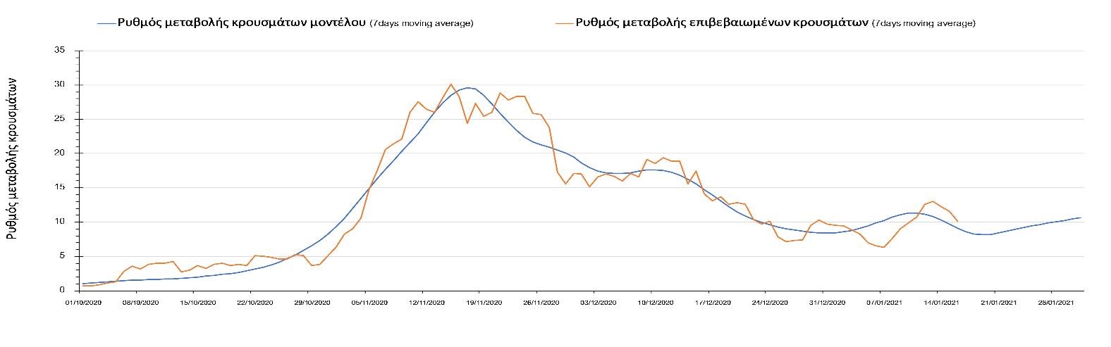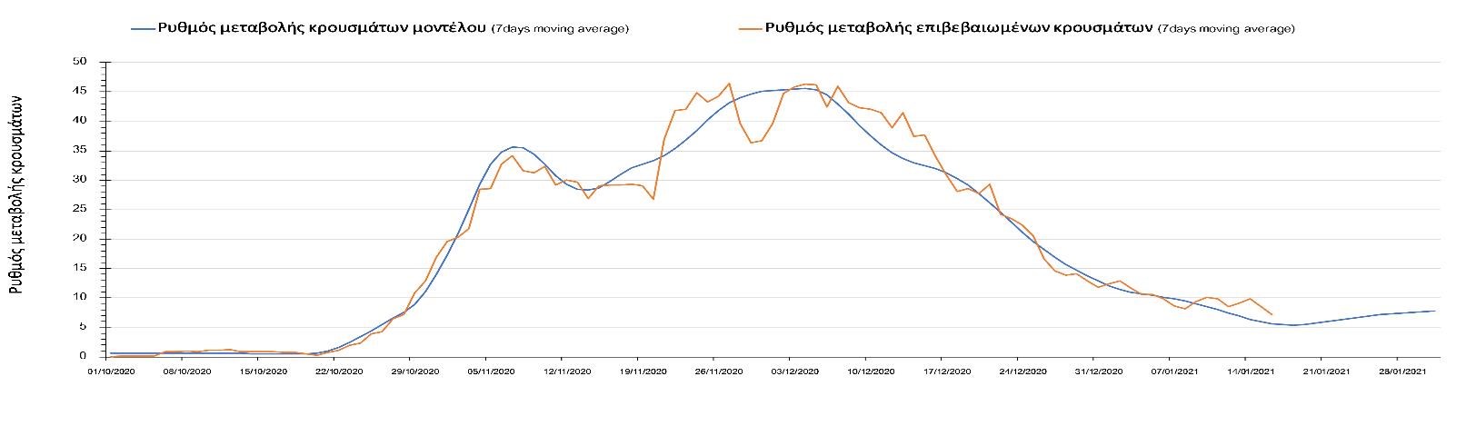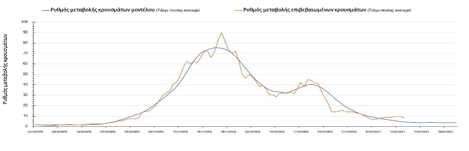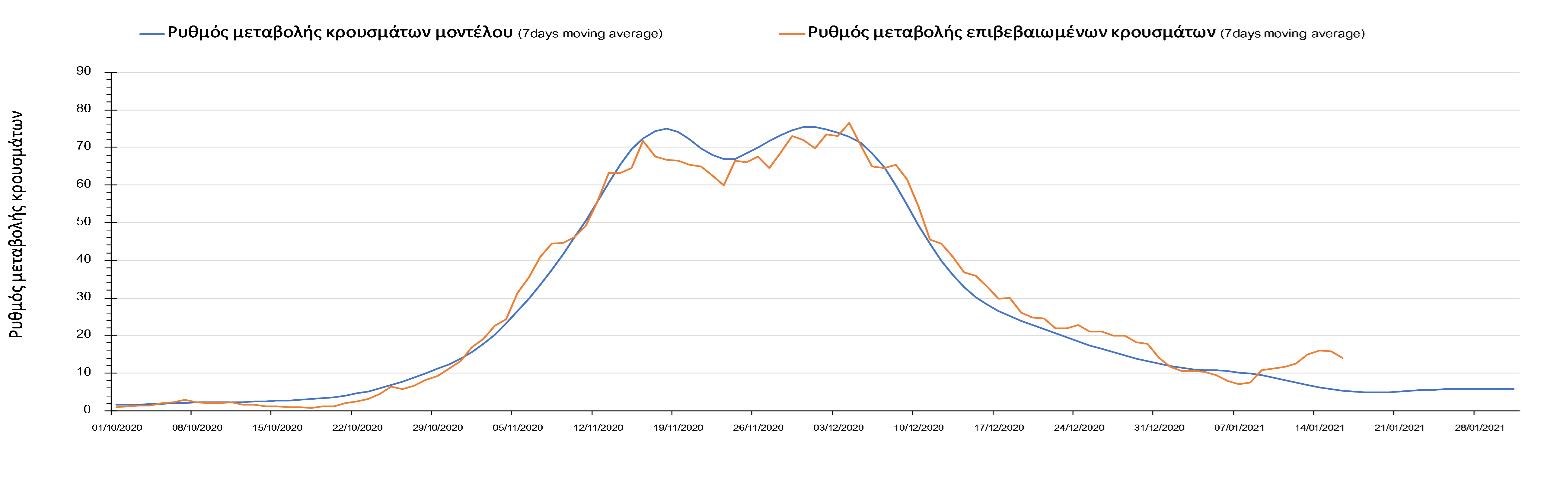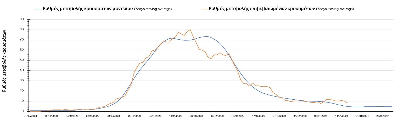 Όπως φαίνεται από το σχήμα, από τις 8 Ιανουαρίου έχουμε μια αύξηση κρουσμάτων μέχρι τις 11 Ιανουαρίου και η οποία οφείλεται στη μείωση της περιστολής που σημειώθηκε στις γιορτές. Από τις 11 μέχρι τις 18 Ιανουαρίου προβλέπεται μια μείωση κρουσμάτων λόγω της εφαρμογής του lockdown που είναι σε ισχύ αυτήν την εβδομάδα. Από τις 19-20 Ιανουαρίου και έπειτα προβλέπεται να διαφανεί μια ελαφρά αύξηση των κρουσμάτων που θα συνεχιστεί μέχρι το τέλος του μήνα.