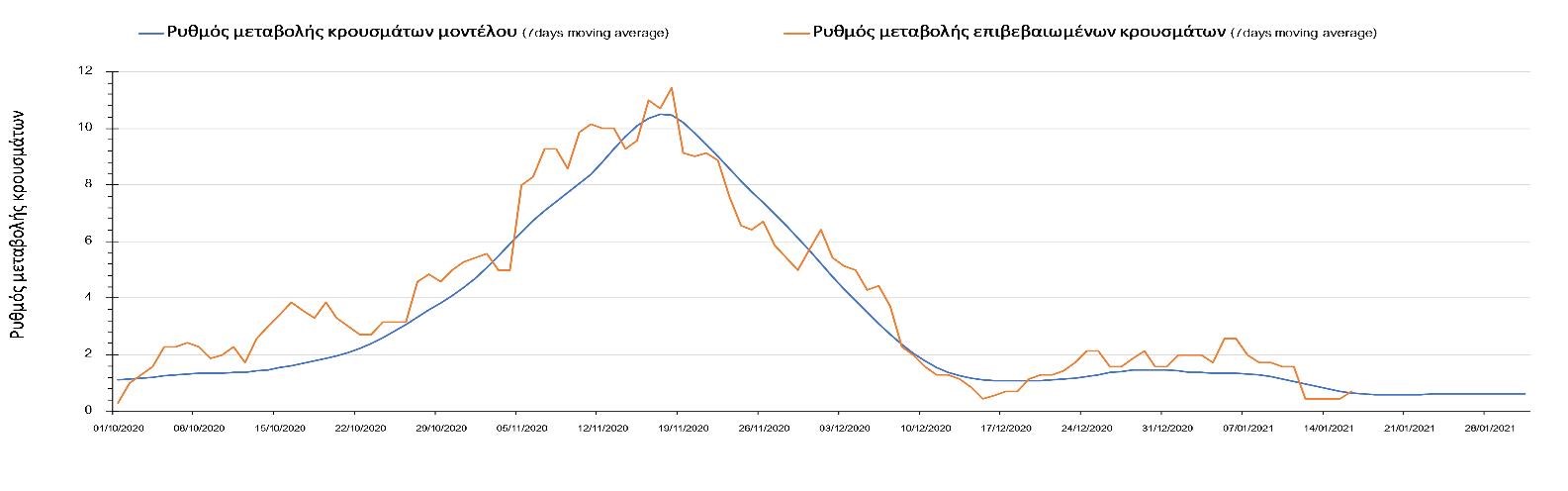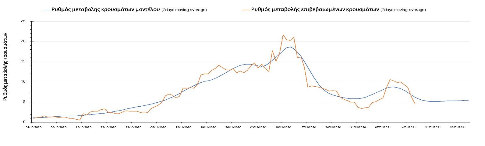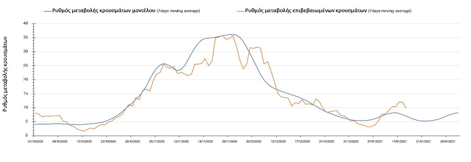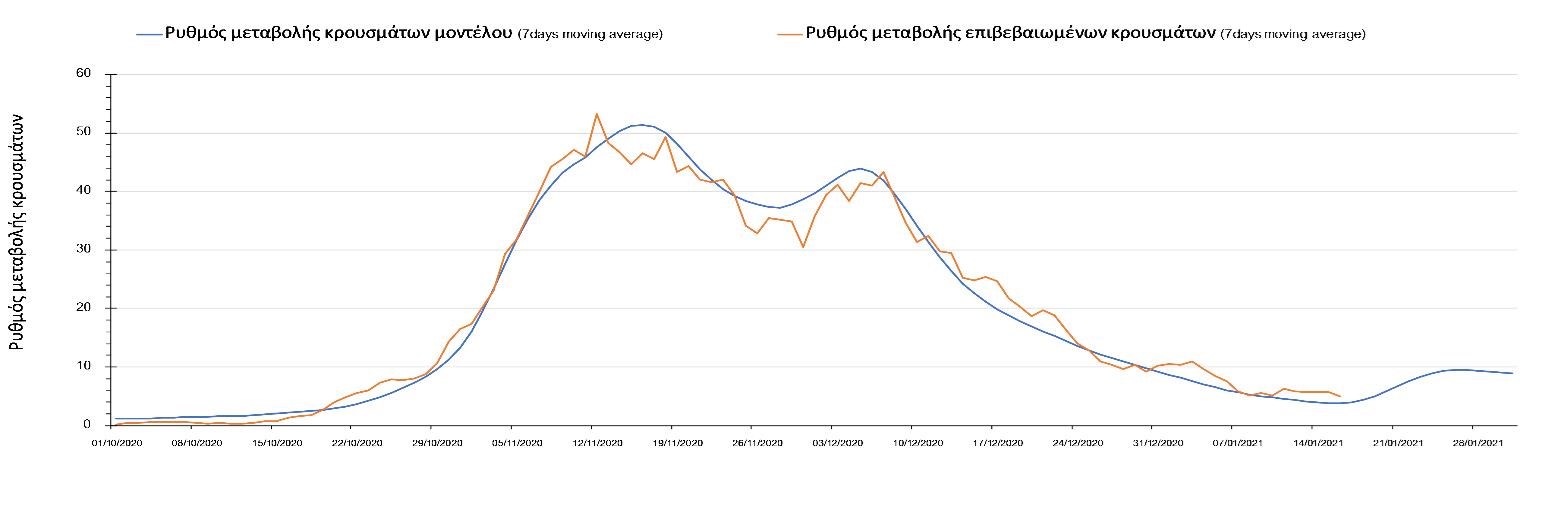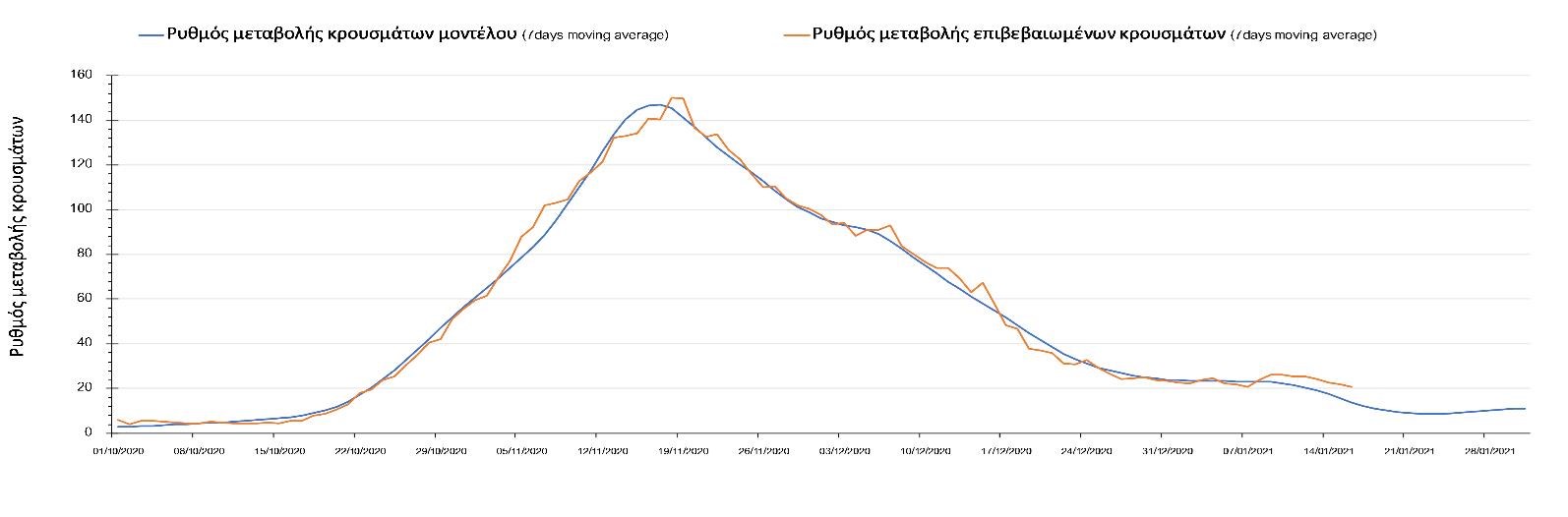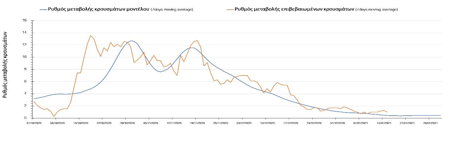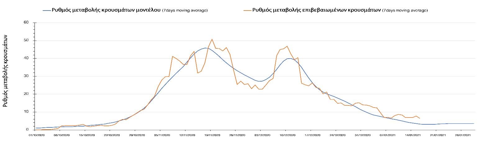 Όπως φαίνεται από το σχήμα, από τις 8 Ιανουαρίου έχουμε μια αύξηση κρουσμάτων μέχρι τις 11 Ιανουαρίου και η οποία οφείλεται στη μείωση της περιστολής που σημειώθηκε στις γιορτές. Από τις 11 μέχρι τις 18 Ιανουαρίου προβλέπεται μια μείωση κρουσμάτων λόγω της εφαρμογής του lockdown που είναι σε ισχύ αυτήν την εβδομάδα. Από τις 19-20 Ιανουαρίου και έπειτα προβλέπεται να διαφανεί μια ελαφρά αύξηση των κρουσμάτων που θα συνεχιστεί μέχρι το τέλος του μήνα.
