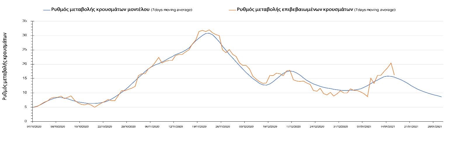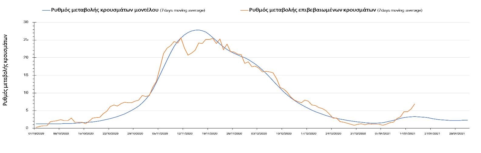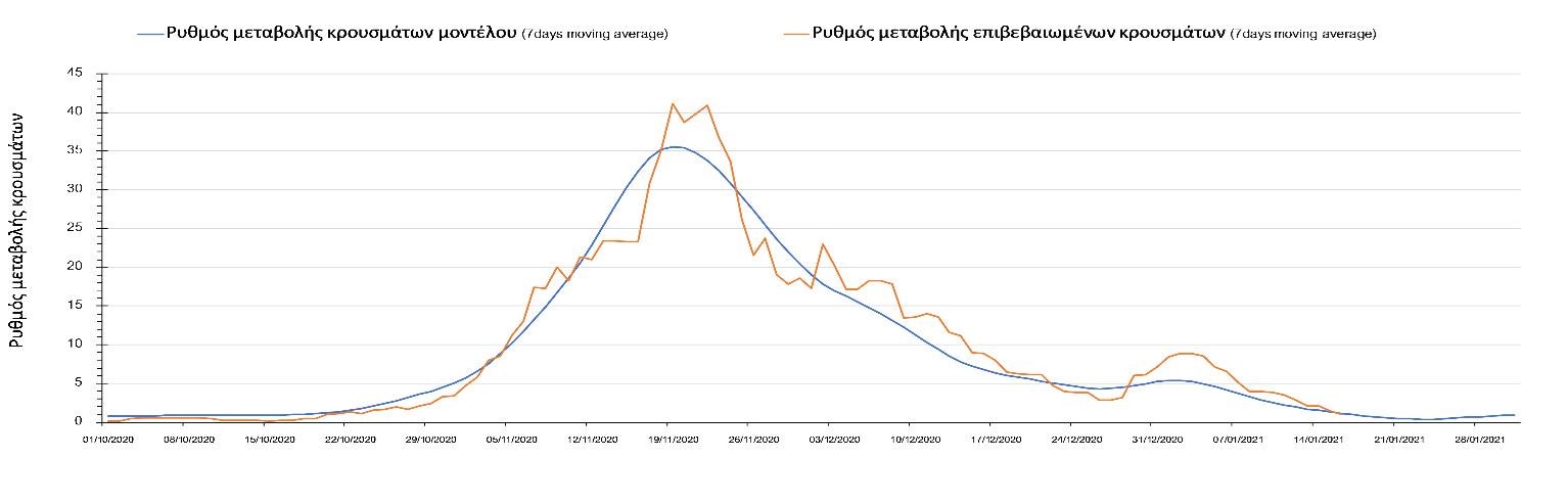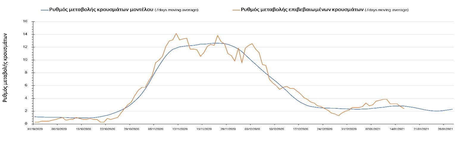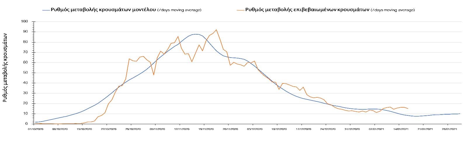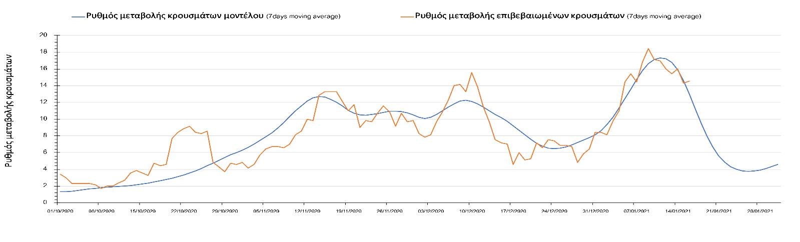 Όπως φαίνεται από το σχήμα, από τις 8 Ιανουαρίου έχουμε μια αύξηση κρουσμάτων μέχρι τις 11 Ιανουαρίου και η οποία οφείλεται στη μείωση της περιστολής που σημειώθηκε στις γιορτές. Από τις 11 μέχρι τις 18 Ιανουαρίου προβλέπεται μια μείωση κρουσμάτων λόγω της εφαρμογής του lockdown που είναι σε ισχύ αυτήν την εβδομάδα. Από τις 19-20 Ιανουαρίου και έπειτα προβλέπεται να διαφανεί μια ελαφρά αύξηση των κρουσμάτων που θα συνεχιστεί μέχρι το τέλος του μήνα.