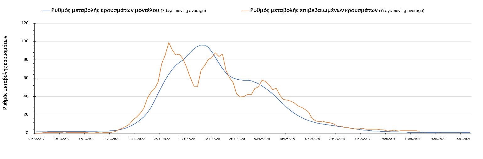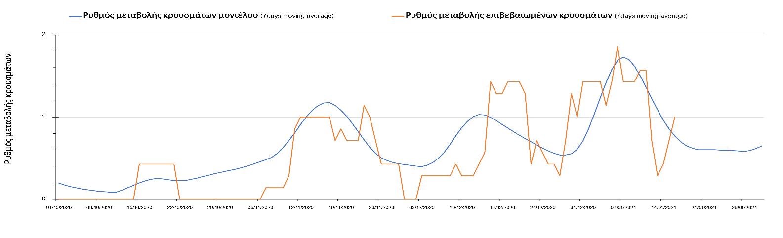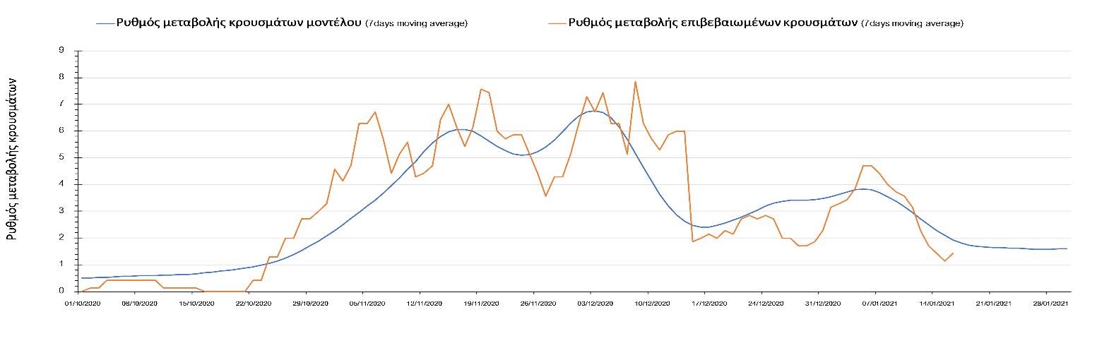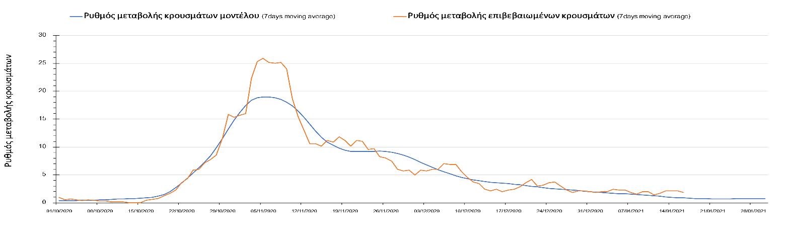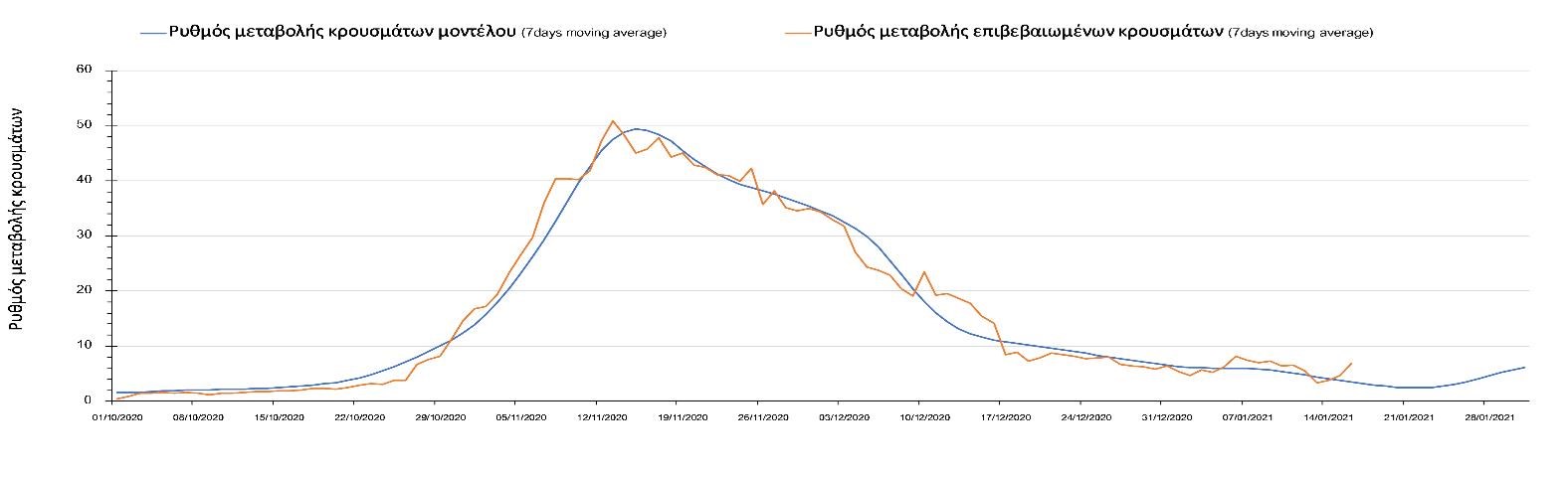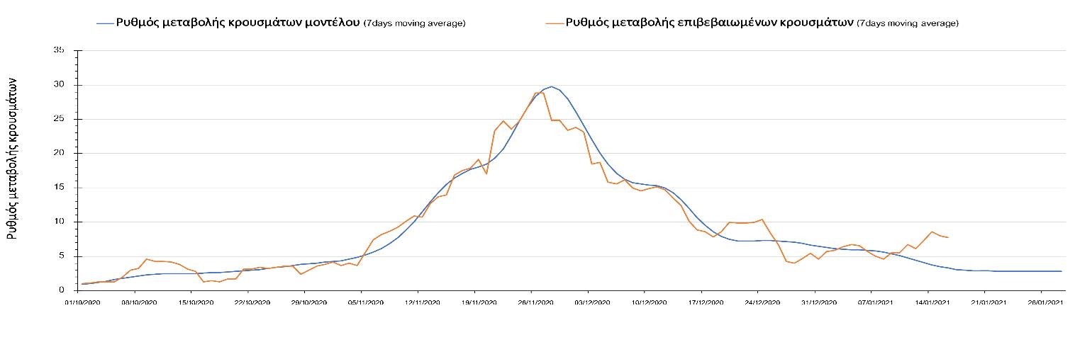 Όπως φαίνεται από το σχήμα, από τις 8 Ιανουαρίου έχουμε μια αύξηση κρουσμάτων μέχρι τις 11 Ιανουαρίου και η οποία οφείλεται στη μείωση της περιστολής που σημειώθηκε στις γιορτές. Από τις 11 μέχρι τις 18 Ιανουαρίου προβλέπεται μια μείωση κρουσμάτων λόγω της εφαρμογής του lockdown που είναι σε ισχύ αυτήν την εβδομάδα. Από τις 19-20 Ιανουαρίου και έπειτα προβλέπεται να διαφανεί μια ελαφρά αύξηση των κρουσμάτων που θα συνεχιστεί μέχρι το τέλος του μήνα.