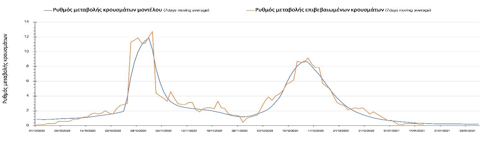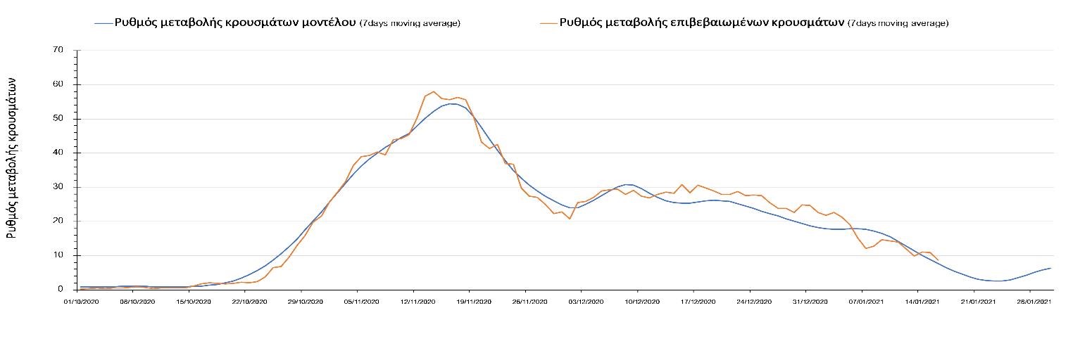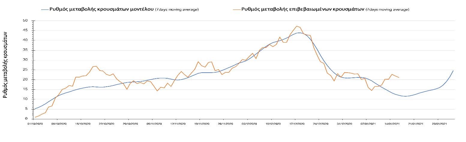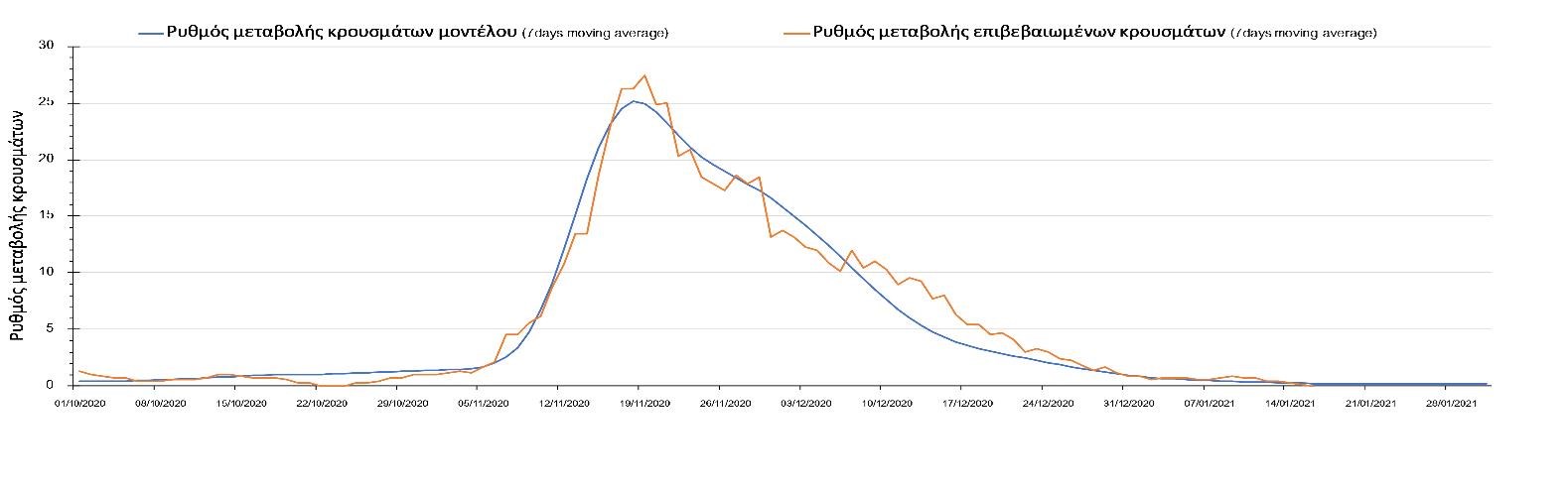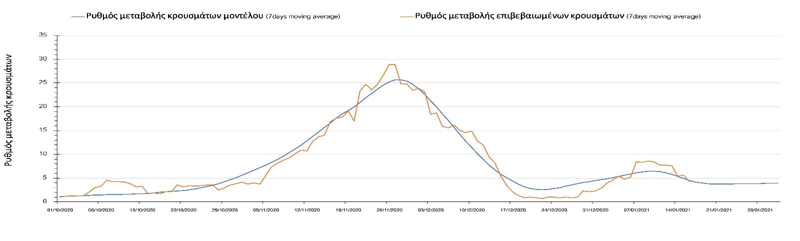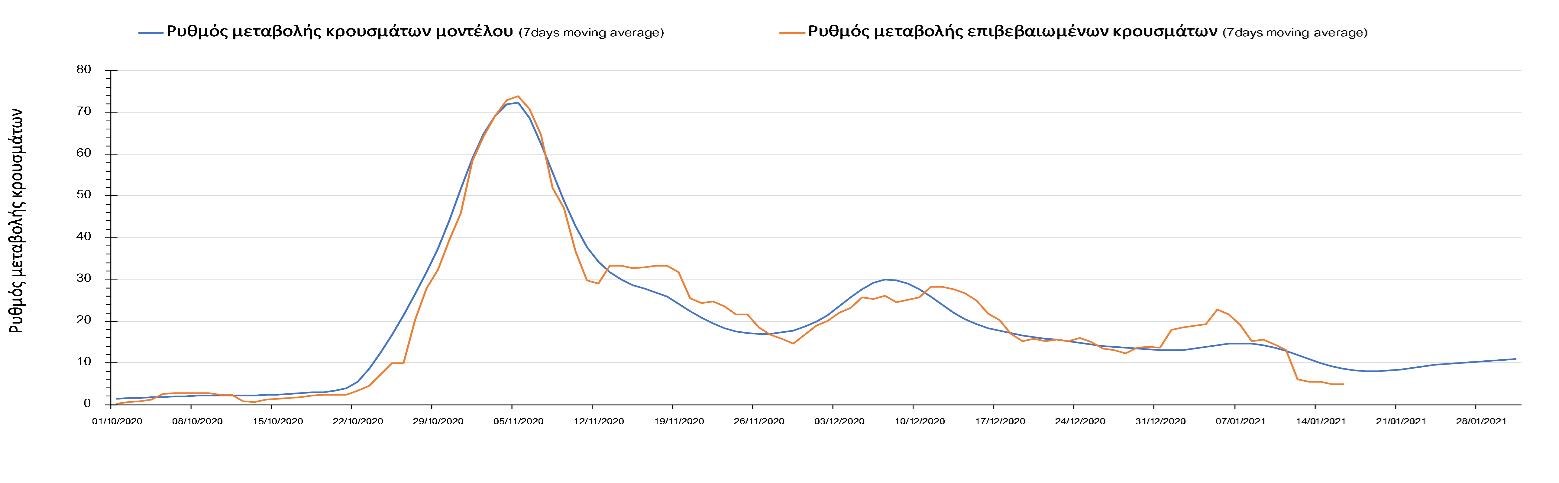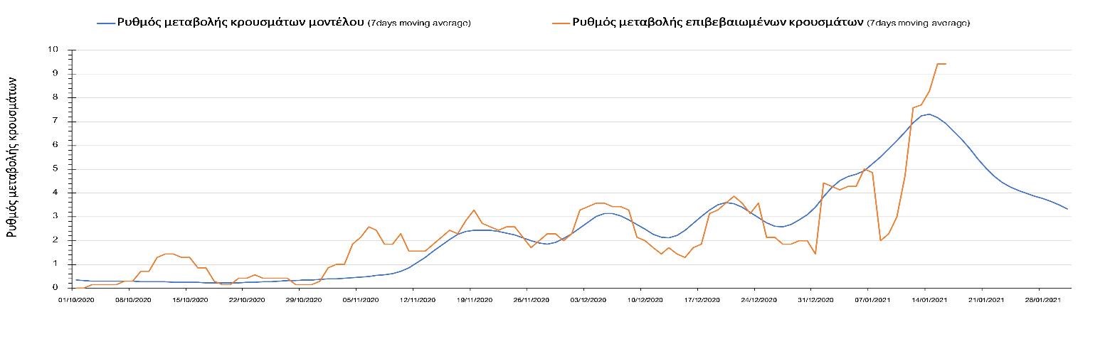 Όπως φαίνεται από το σχήμα, από τις 8 Ιανουαρίου έχουμε μια αύξηση κρουσμάτων μέχρι τις 11 Ιανουαρίου και η οποία οφείλεται στη μείωση της περιστολής που σημειώθηκε στις γιορτές. Από τις 11 μέχρι τις 18 Ιανουαρίου προβλέπεται μια μείωση κρουσμάτων λόγω της εφαρμογής του lockdown που είναι σε ισχύ αυτήν την εβδομάδα. Από τις 19-20 Ιανουαρίου και έπειτα προβλέπεται να διαφανεί μια ελαφρά αύξηση των κρουσμάτων που θα συνεχιστεί μέχρι το τέλος του μήνα.