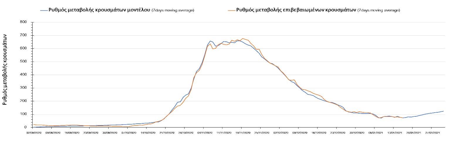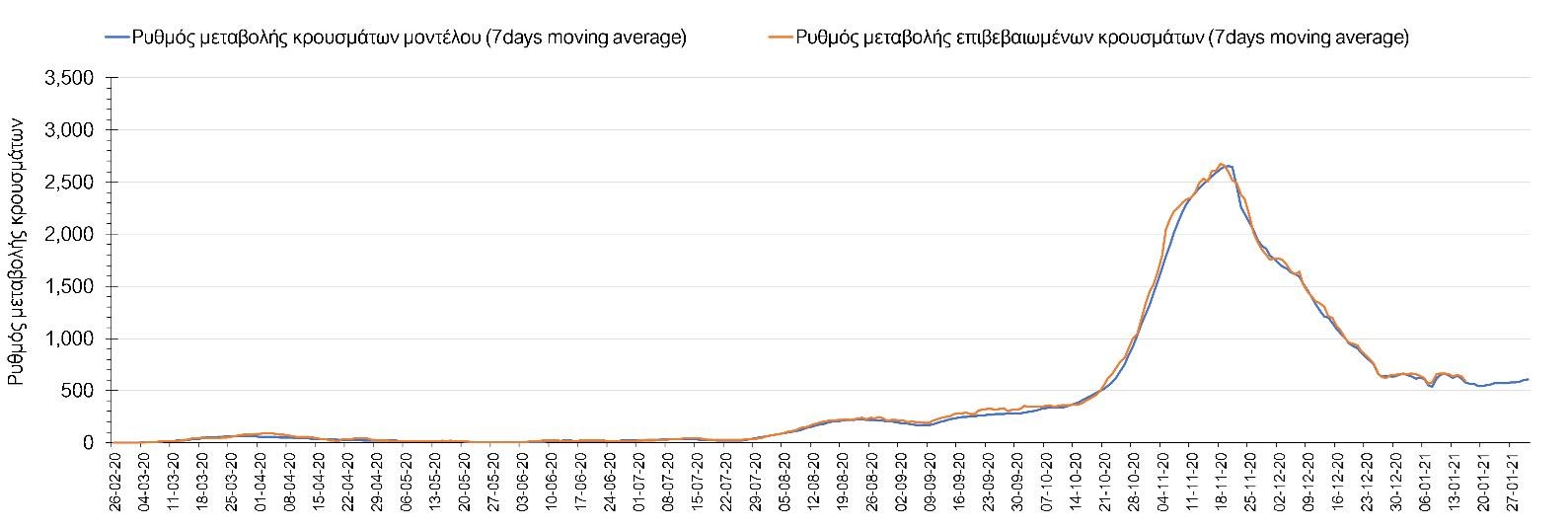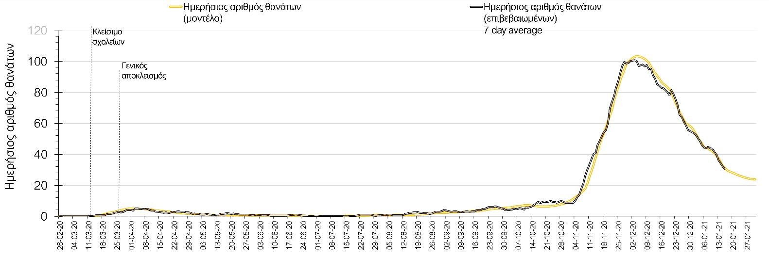 Η πορεία της μέσης εβδομαδιαίας τιμής των κρουσμάτων όπως έχουν καταγραφεί από τον ΕΟΔΥ και η αναμενόμενη πορεία τους όπως προδιαγράφεται από την υπολογιστική πλατφόρμα CORE για την Ελληνική επικράτεια μέχρι το τέλος του Ιανουαρίου, αποτυπώνονται στο Σχήμα 3. Στις προβλέψεις έχει συμπεριληφθεί η απόφαση εφαρμογής αυστηρού lockdown από την Κυριακή 3 Ιανουαρίου μέχρι και τις 17 Ιανουαρίου. Στις 11 Ιανουαρίου προβλέπεται άνοιγμα της πρωτοβάθμιας εκπαίδευσης, ενώ το άνοιγμα των βιβλιοπωλείων, κομμωτηρίων, λιανικού εμπορίου και των εμπορικών καταστημάτων από τη Δευτέρα 18/1.