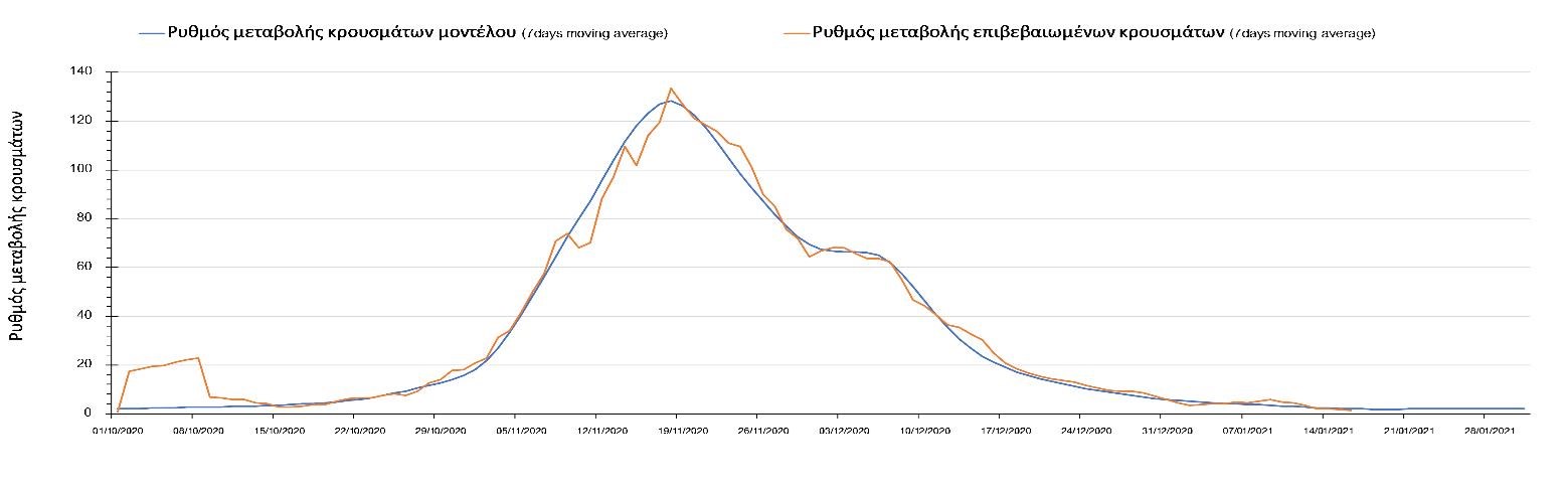 Συμπεράσματα:Η συνολική πορεία των κρουσμάτων, αλλά και η αποκλιμάκωση που παρατηρείται στον αριθμό των ασθενών σε κρίσιμη κατάσταση (διασωληνωμένοι σε ΜΕΘ), μετά τα αποτελέσματα, συνάδει με τις προσομοιώσεις του μοντέλου CORE για τον επόμενο μήνα. Παρά την εφαρμογή οριζοντίων μέτρων ανάσχεσης της πανδημίας, η πορεία της τελευταίας διαφοροποιείται από περιοχή σε περιοχή, ενώ σε συγκεκριμένες περιοχές αποτυπώθηκε η έλλειψη τήρησης των μέτρων τις ημέρες της πρωτοχρονιάς. Οι παραπάνω παρατηρήσεις τείνουν στο συμπέρασμα ότι η διαχείριση του υγειονομικού κινδύνου θα πρέπει να εξεταστεί σε τοπικό επίπεδο από τη στιγμή που συνολικά στη χώρα φαίνεται να έχουμε ξεπεράσει την κορύφωση του συγκεκριμένου επιδημικού κύματος του Νοεμβρίου. Παρόλα αυτά, συνιστάται προσεκτική μελέτη των αποτελεσμάτων των επόμενων ημερών, λόγω του συνωστισμού που προέκυψε στις οικογενειακές συγκεντρώσεις και στην αυξημένη κίνηση σε δημόσιους χώρους λόγω των αργιών.