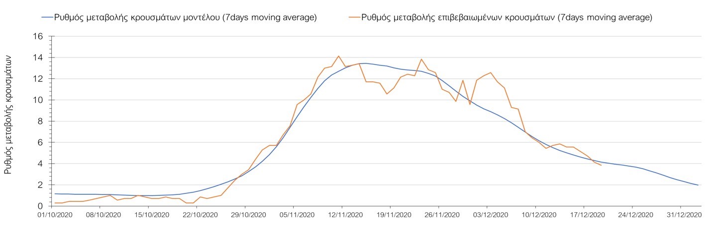 Σχήμα 2. Αριθμός θανάτων (κυλιόμενος μέσος όρος 7 ημερών) σύμφωνα με τα στοιχεία του ΕΟΔΥ και τις προβλέψεις της υπολογιστικής πλατφόρμας CORE.Και στις δύο περιπτώσεις φαίνεται ότι βρισκόμαστε στην αρχή της αποκλιμάκωσης όπως είχαμε προβλέψει. Περιμένουμε ότι αυτή η αποκλιμάκωση θα πραγματοποιηθεί και σε ό,τι αφορά στον αριθμό των ασθενών που είναι διασωληνομένοι σε ΜΕΘ και στους θανάτους από COVID-19. Η πορεία της μέσης εβδομαδιαίας τιμής των κρουσμάτων όπως έχουν καταγραφεί από τον ΕΟΔΥ και η αναμενόμενη πορεία τους μέχρι το τέλος του χρόνου, σύμφωνα με την υπάρχουσα κατάσταση και την απόφαση παράτασης του lockdown μέχρι και τις 7 Ιανουαρίου, όπως προδιαγράφεται από την υπολογιστική πλατφόρμα CORE για την Ελληνική επικράτεια, αποτυπώνονται στο Σχήμα 3.
