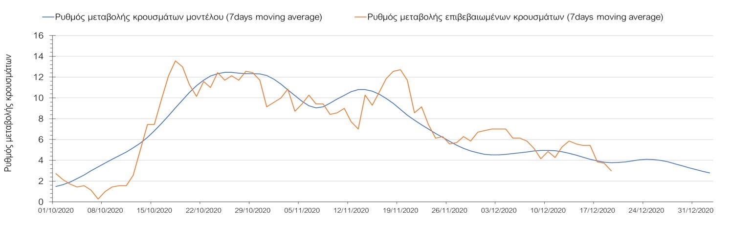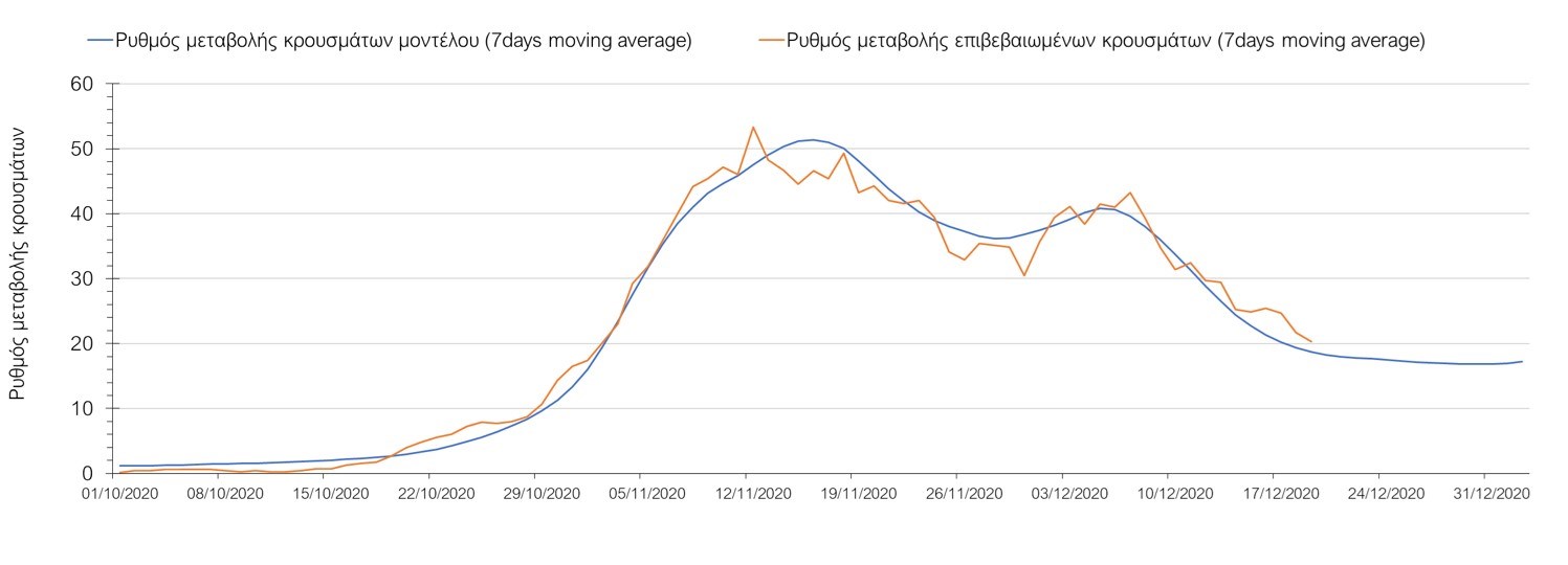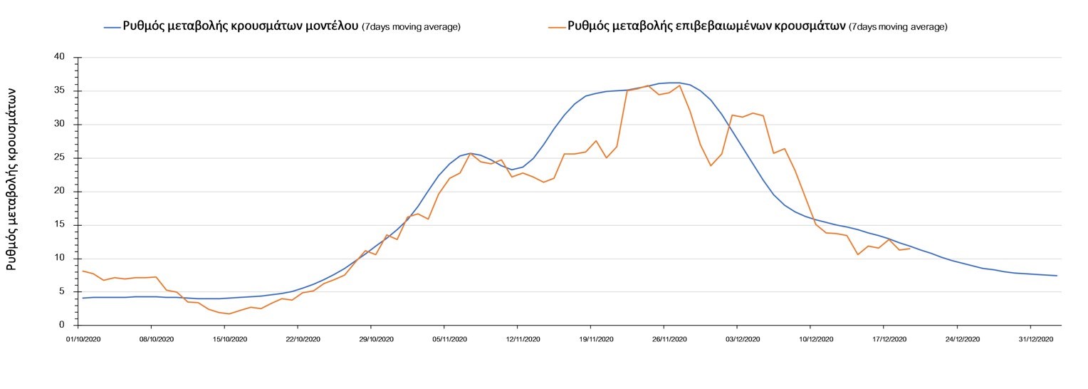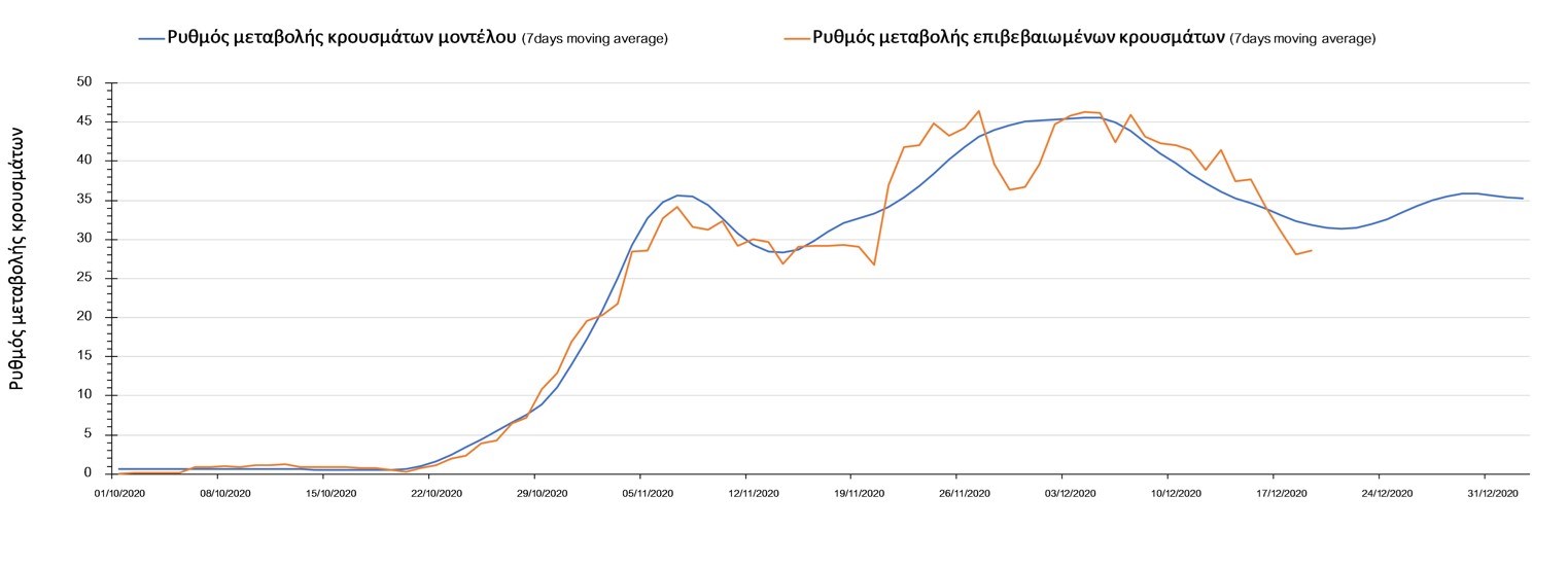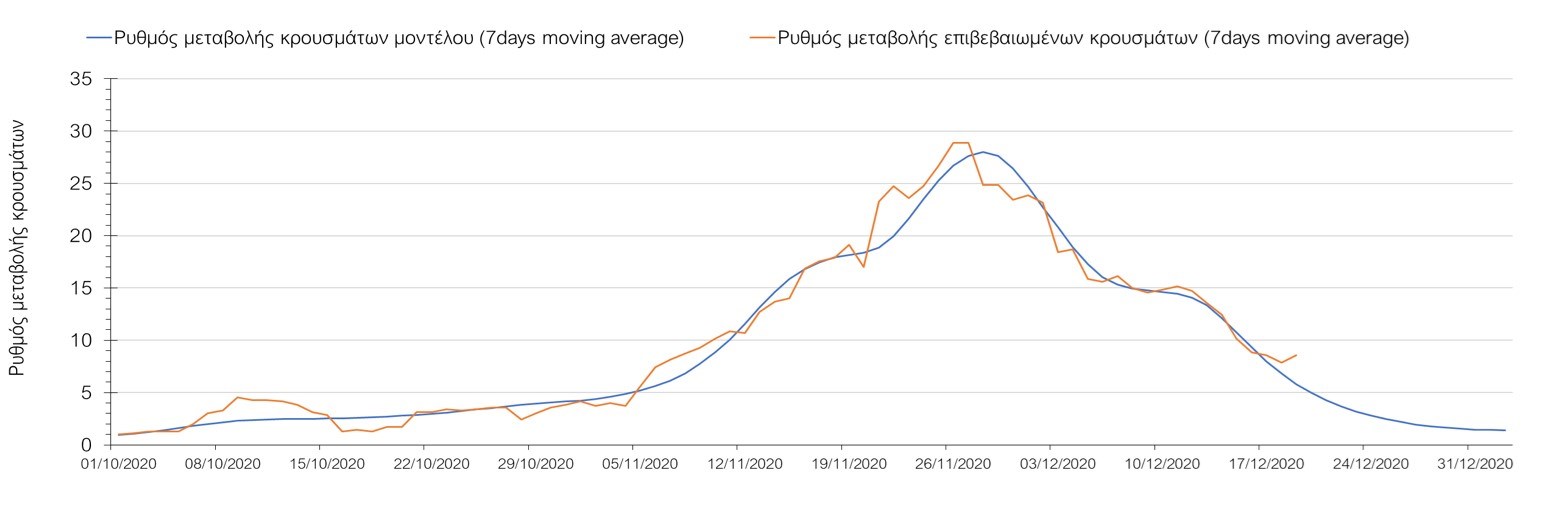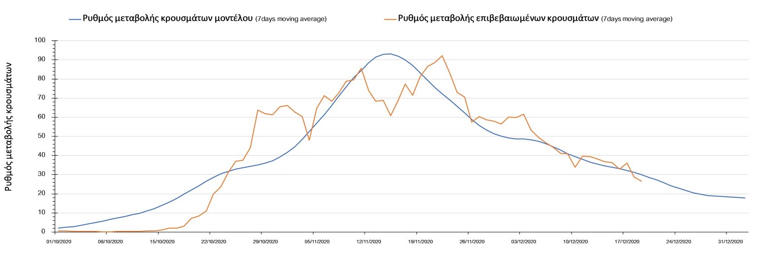 Σχήμα 2. Αριθμός θανάτων (κυλιόμενος μέσος όρος 7 ημερών) σύμφωνα με τα στοιχεία του ΕΟΔΥ και τις προβλέψεις της υπολογιστικής πλατφόρμας CORE.Και στις δύο περιπτώσεις φαίνεται ότι βρισκόμαστε στην αρχή της αποκλιμάκωσης όπως είχαμε προβλέψει. Περιμένουμε ότι αυτή η αποκλιμάκωση θα πραγματοποιηθεί και σε ό,τι αφορά στον αριθμό των ασθενών που είναι διασωληνομένοι σε ΜΕΘ και στους θανάτους από COVID-19. Η πορεία της μέσης εβδομαδιαίας τιμής των κρουσμάτων όπως έχουν καταγραφεί από τον ΕΟΔΥ και η αναμενόμενη πορεία τους μέχρι το τέλος του χρόνου, σύμφωνα με την υπάρχουσα κατάσταση και την απόφαση παράτασης του lockdown μέχρι και τις 7 Ιανουαρίου, όπως προδιαγράφεται από την υπολογιστική πλατφόρμα CORE για την Ελληνική επικράτεια, αποτυπώνονται στο Σχήμα 3.