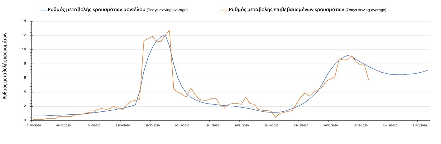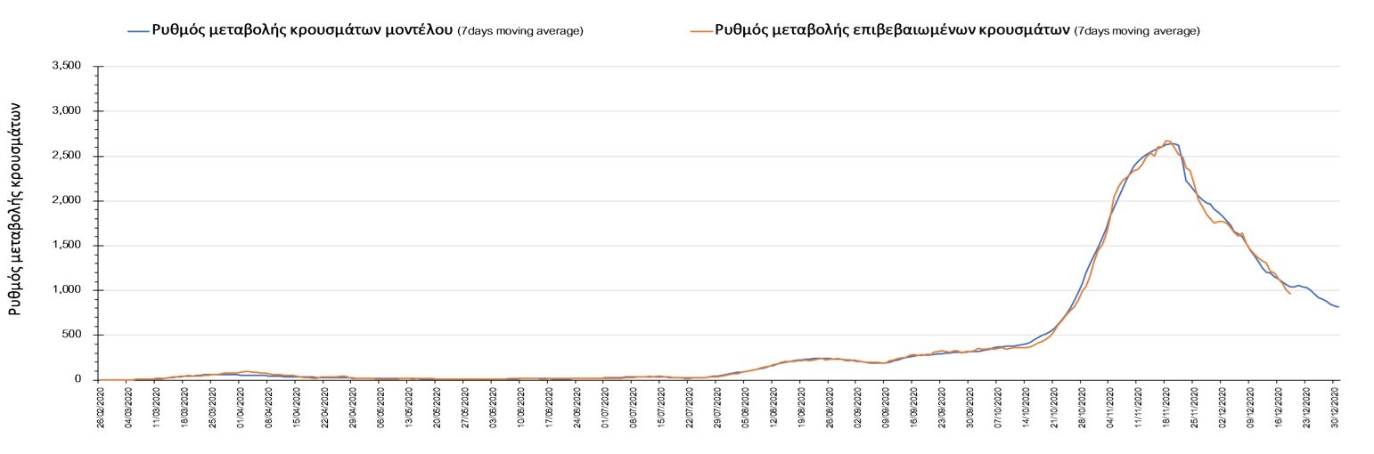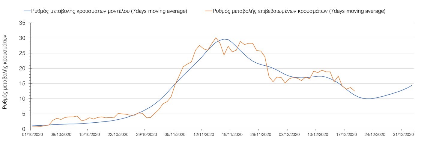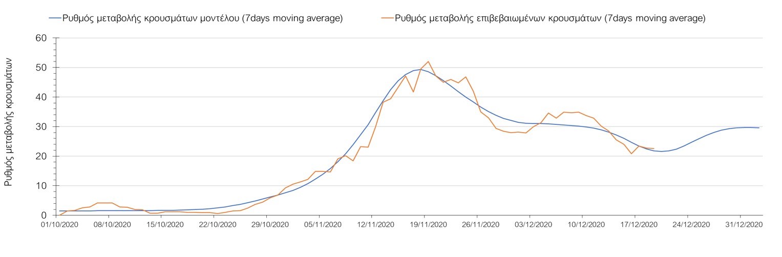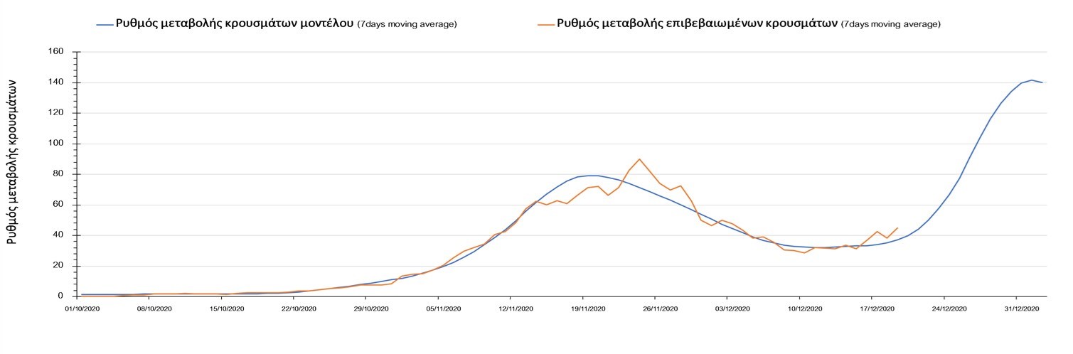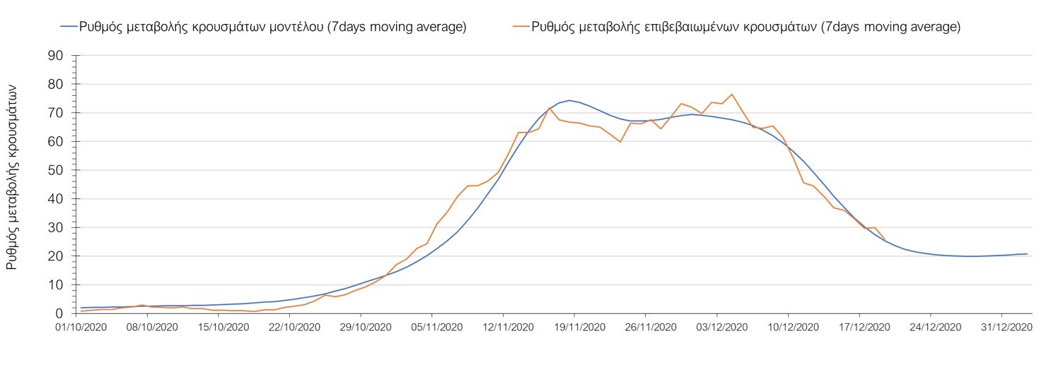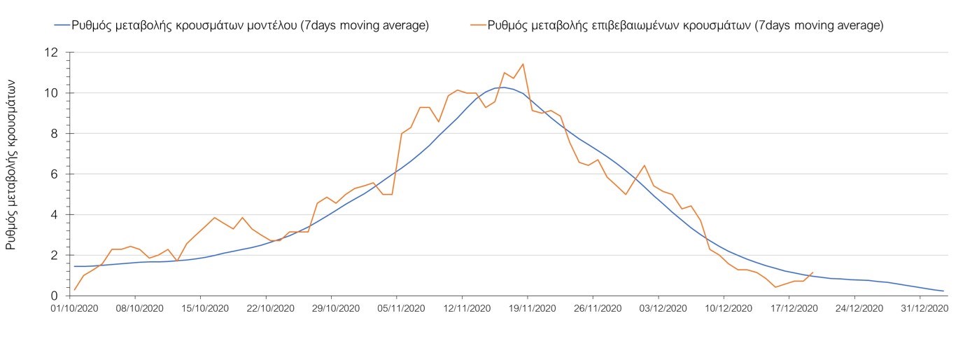 Σχήμα 2. Αριθμός θανάτων (κυλιόμενος μέσος όρος 7 ημερών) σύμφωνα με τα στοιχεία του ΕΟΔΥ και τις προβλέψεις της υπολογιστικής πλατφόρμας CORE.Και στις δύο περιπτώσεις φαίνεται ότι βρισκόμαστε στην αρχή της αποκλιμάκωσης όπως είχαμε προβλέψει. Περιμένουμε ότι αυτή η αποκλιμάκωση θα πραγματοποιηθεί και σε ό,τι αφορά στον αριθμό των ασθενών που είναι διασωληνομένοι σε ΜΕΘ και στους θανάτους από COVID-19. Η πορεία της μέσης εβδομαδιαίας τιμής των κρουσμάτων όπως έχουν καταγραφεί από τον ΕΟΔΥ και η αναμενόμενη πορεία τους μέχρι το τέλος του χρόνου, σύμφωνα με την υπάρχουσα κατάσταση και την απόφαση παράτασης του lockdown μέχρι και τις 7 Ιανουαρίου, όπως προδιαγράφεται από την υπολογιστική πλατφόρμα CORE για την Ελληνική επικράτεια, αποτυπώνονται στο Σχήμα 3.