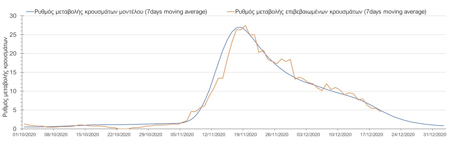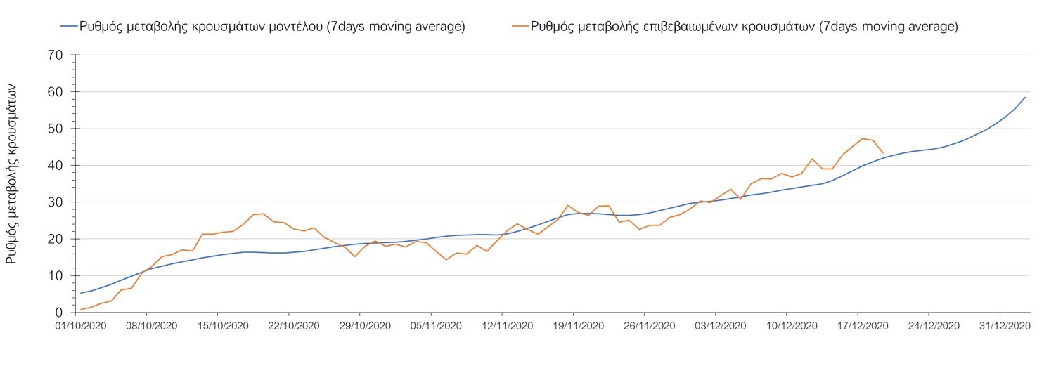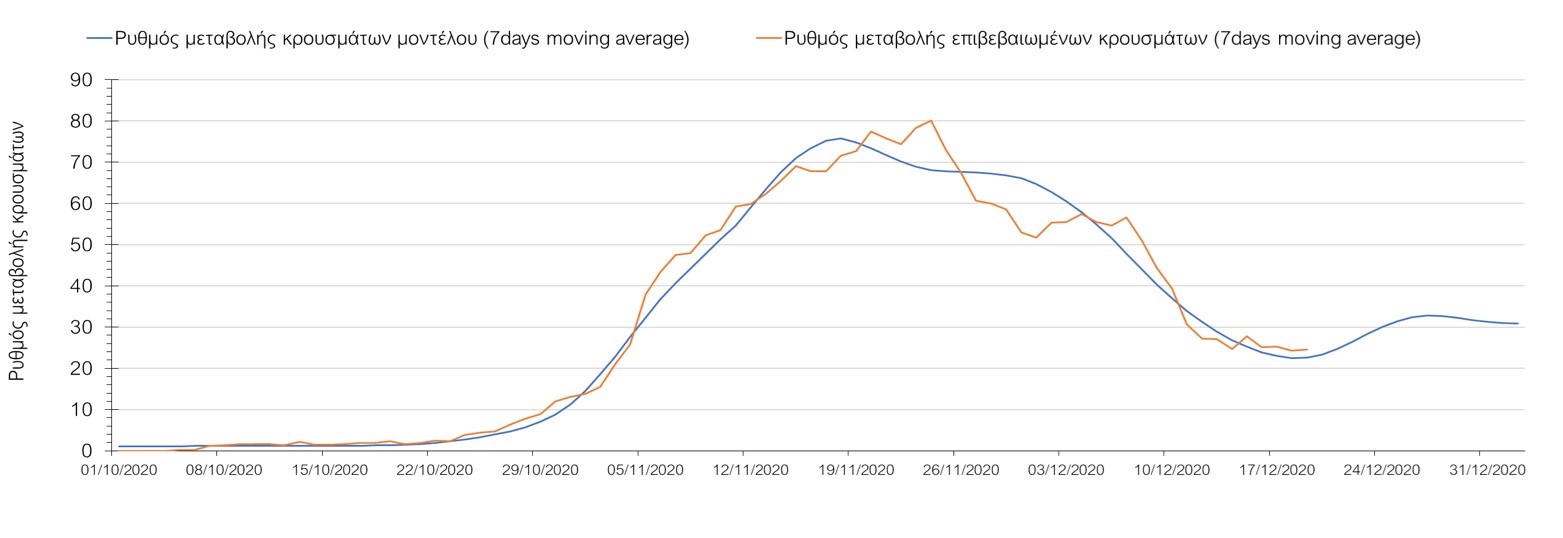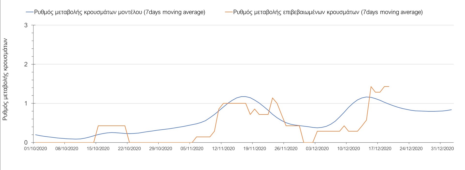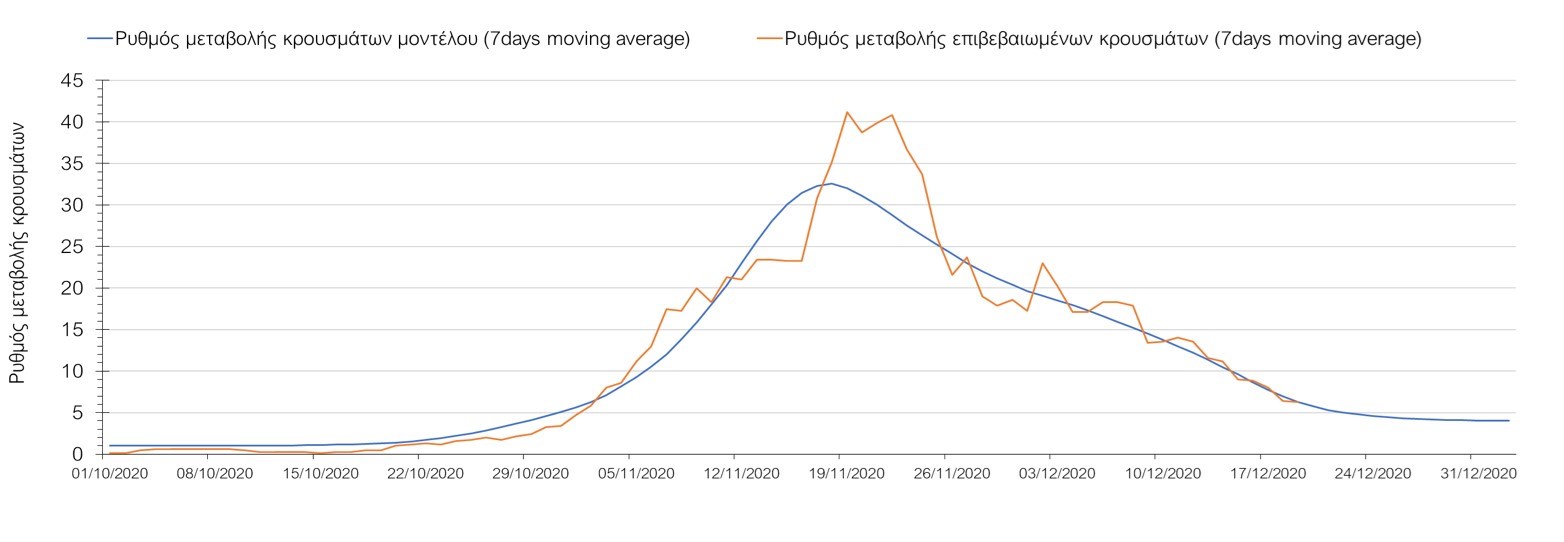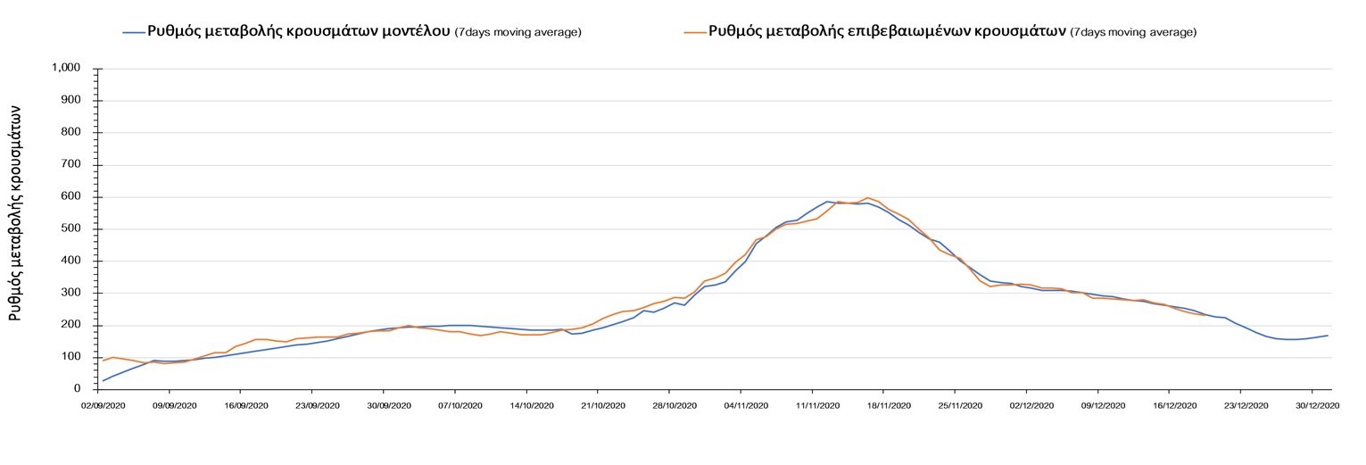 Σχήμα 2. Αριθμός θανάτων (κυλιόμενος μέσος όρος 7 ημερών) σύμφωνα με τα στοιχεία του ΕΟΔΥ και τις προβλέψεις της υπολογιστικής πλατφόρμας CORE.Και στις δύο περιπτώσεις φαίνεται ότι βρισκόμαστε στην αρχή της αποκλιμάκωσης όπως είχαμε προβλέψει. Περιμένουμε ότι αυτή η αποκλιμάκωση θα πραγματοποιηθεί και σε ό,τι αφορά στον αριθμό των ασθενών που είναι διασωληνομένοι σε ΜΕΘ και στους θανάτους από COVID-19. Η πορεία της μέσης εβδομαδιαίας τιμής των κρουσμάτων όπως έχουν καταγραφεί από τον ΕΟΔΥ και η αναμενόμενη πορεία τους μέχρι το τέλος του χρόνου, σύμφωνα με την υπάρχουσα κατάσταση και την απόφαση παράτασης του lockdown μέχρι και τις 7 Ιανουαρίου, όπως προδιαγράφεται από την υπολογιστική πλατφόρμα CORE για την Ελληνική επικράτεια, αποτυπώνονται στο Σχήμα 3.