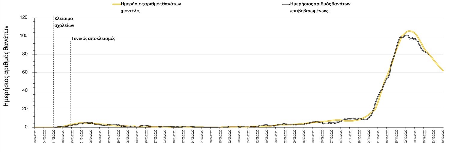 Ο αριθμός θανάτων (58) είναι μειωμένος σε σχέση με την Παρασκευή (96), και ακολουθεί με υστέρηση δύο εβδομάδων την καμπύλη αποκλιμάκωσης σε ό,τι αφορά τα επιβεβαιωμένα κρούσματα. Ο γενικά υψηλός αριθμός των θανάτων που καταγράφεται ακόμη και αυτή την εβδομάδα σε συνδυασμό με την παρατηρούμενη μείωση των επιβεβαιωμένων κρουσμάτων σε σχέση με την προηγούμενη εβδομάδα μπορεί να ερμηνευθεί από το γεγονός ότι έγινε πιο συνεπής εφαρμογή του lockdown μετά τις 17-18 Νοεμβρίου, περίπου 10 μέρες μετά την ανακοίνωση του.