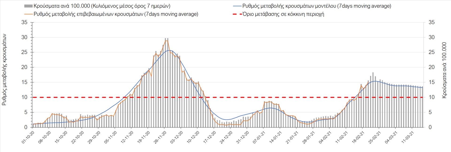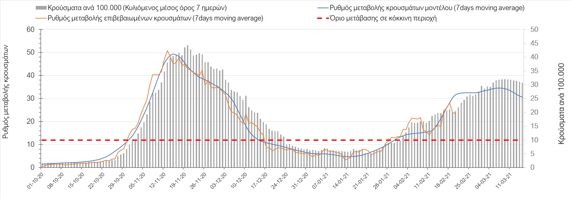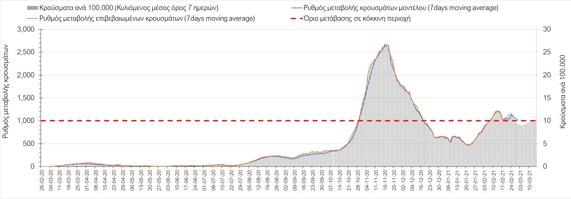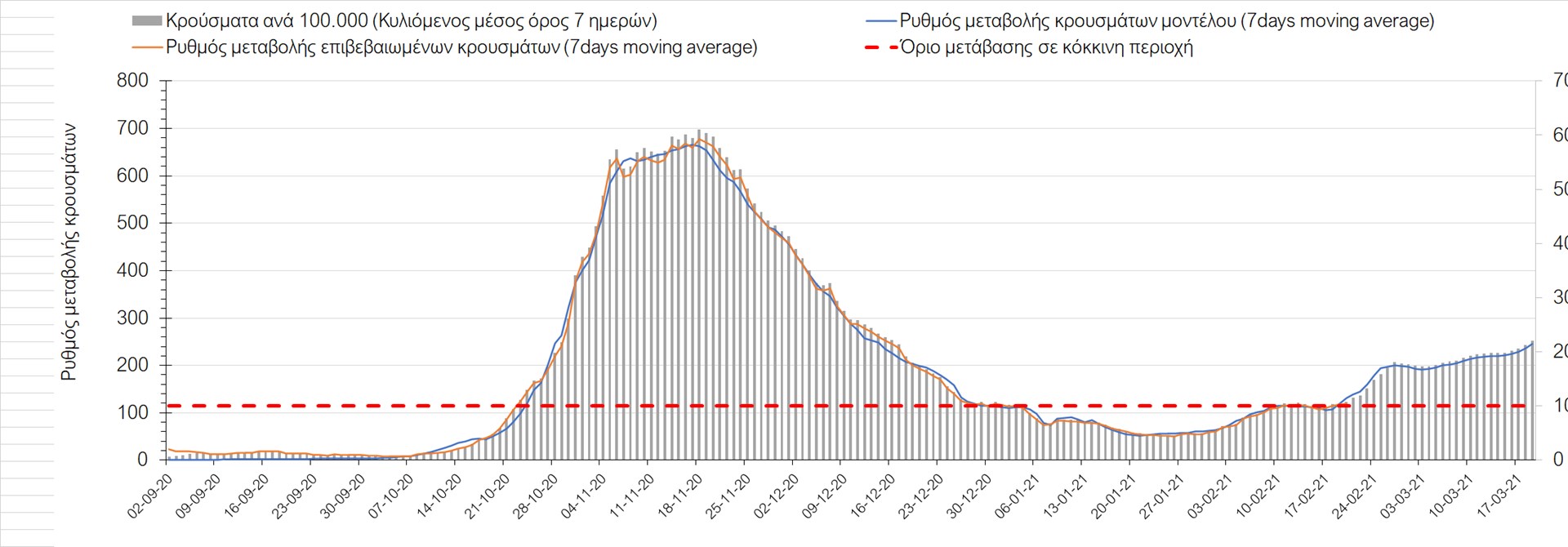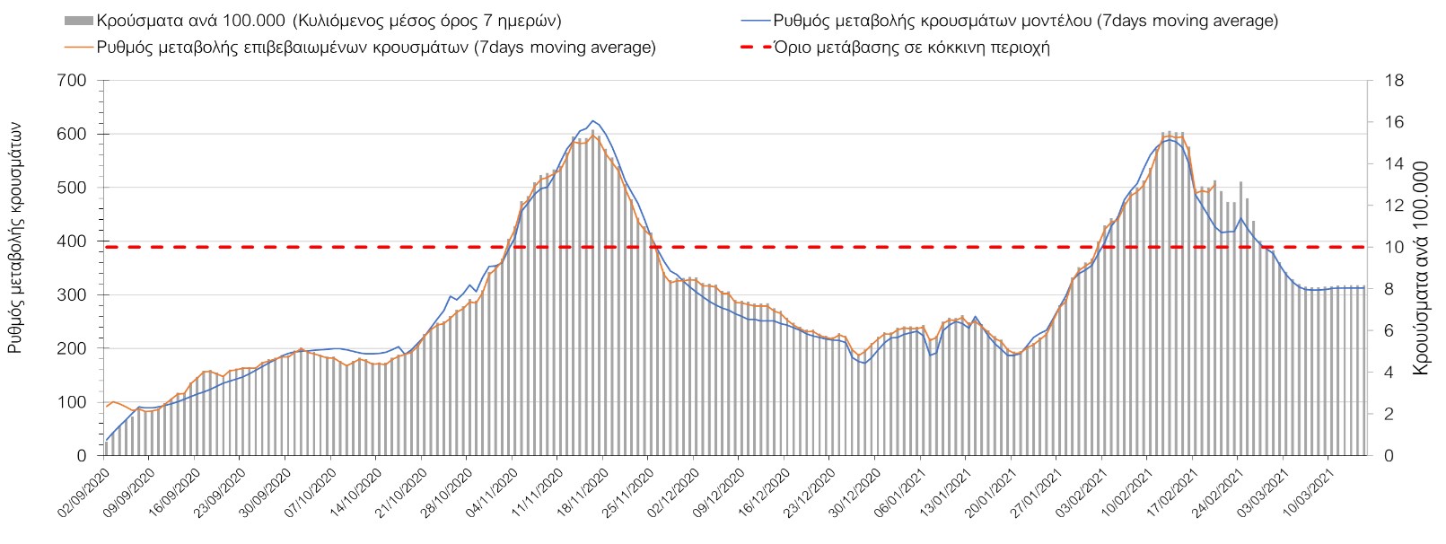Και στις δύο περιπτώσεις φαίνεται ότι πλέον ξεπερνάμε τη φάση της αποκλιμάκωσης (βλέπε σχήματα 1 και 2) και εισερχόμαστε σε νέα ανοδική τροχιά, η οποία όμως μπορεί να ανακοπεί από την καλή εφαρμογή των ήδη σε ισχύ μέτρων ελέγχου της διασποράς.