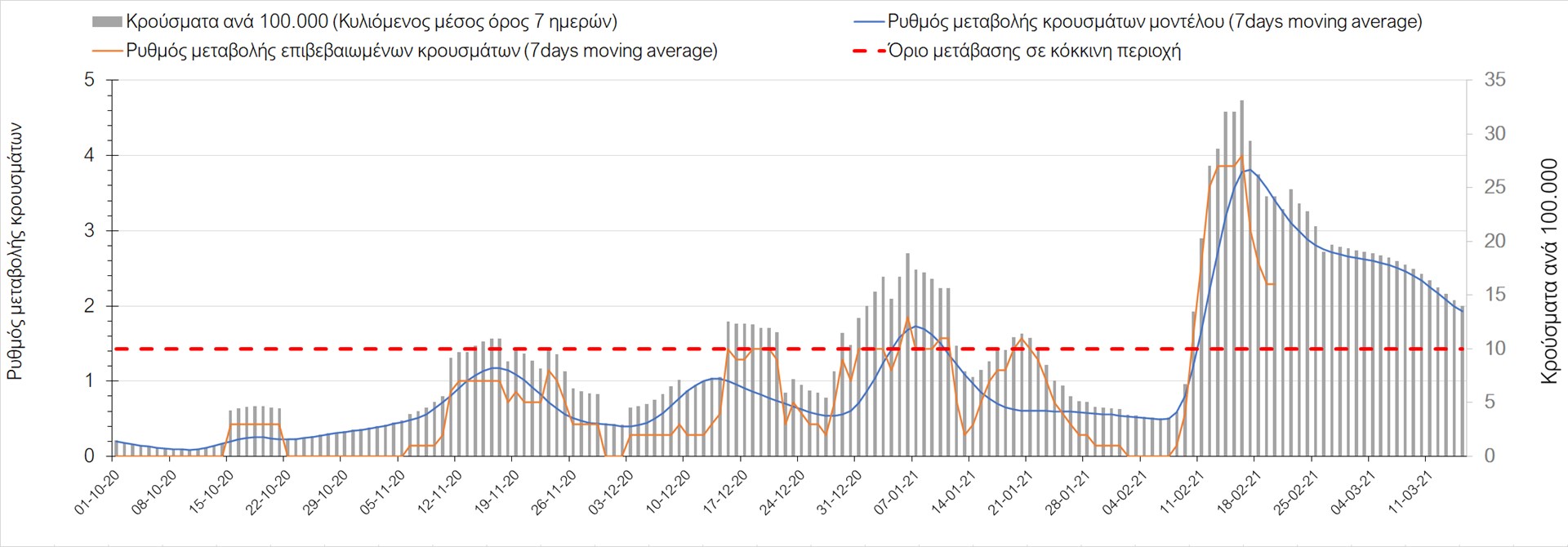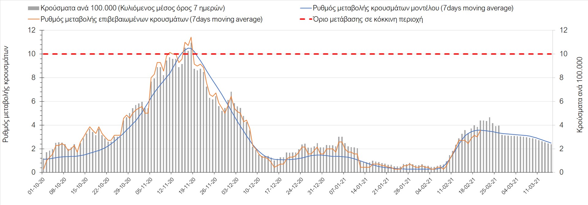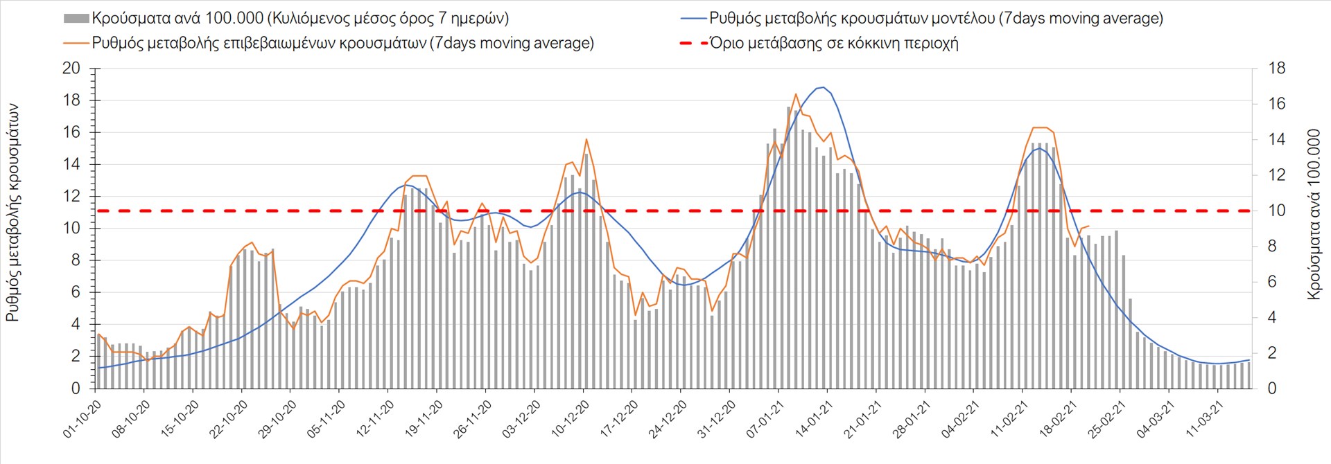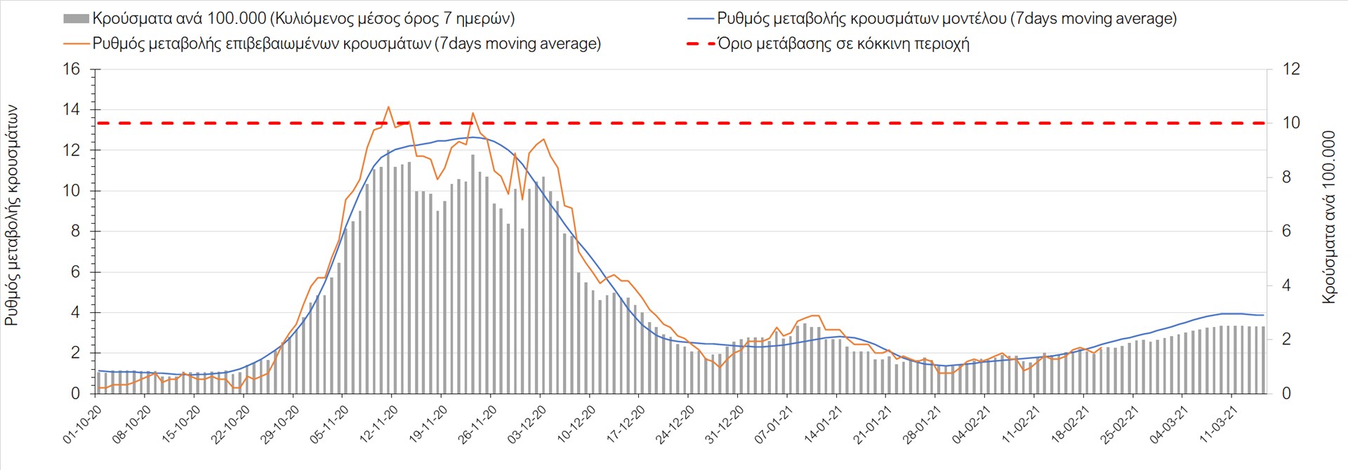 Και στις δύο περιπτώσεις φαίνεται ότι πλέον ξεπερνάμε τη φάση της αποκλιμάκωσης (βλέπε σχήματα 1 και 2) και εισερχόμαστε σε νέα ανοδική τροχιά, η οποία όμως μπορεί να ανακοπεί από την καλή εφαρμογή των ήδη σε ισχύ μέτρων ελέγχου της διασποράς.