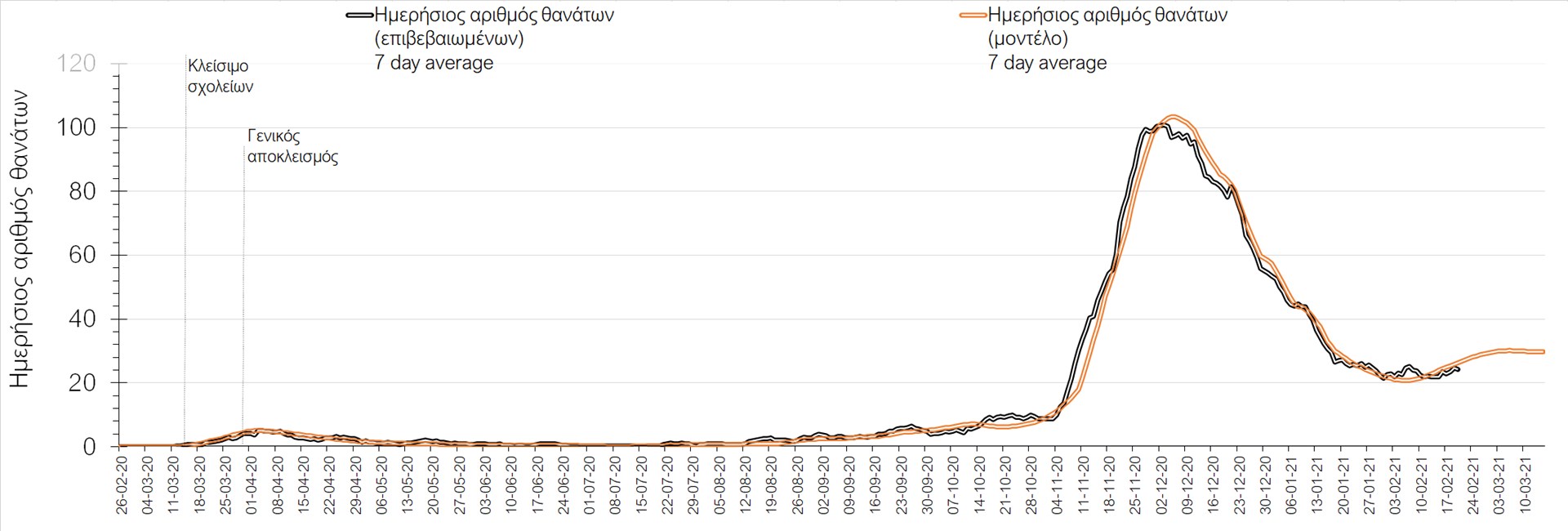 Ο αριθμός θανάτων (23) είναι μειωμένος σε σχέση με προχθές (28), και όπως είχαμε προβλέψει από την προηγούμενη εβδομάδα, δεν αναμένεται να μειωθεί περαιτέρω κάτω από τους 20 (σε επίπεδο μέσης εβδομαδιαίας τιμής), με δεδομένη την αύξηση του αριθμού των κρουσμάτων και την αύξηση του αριθμού των διασωληνωμένων που έχει ήδη ξεκινήσει. Αντίθετα αναμένεται να συνεχίσει με ήπια αυξητική πορεία.