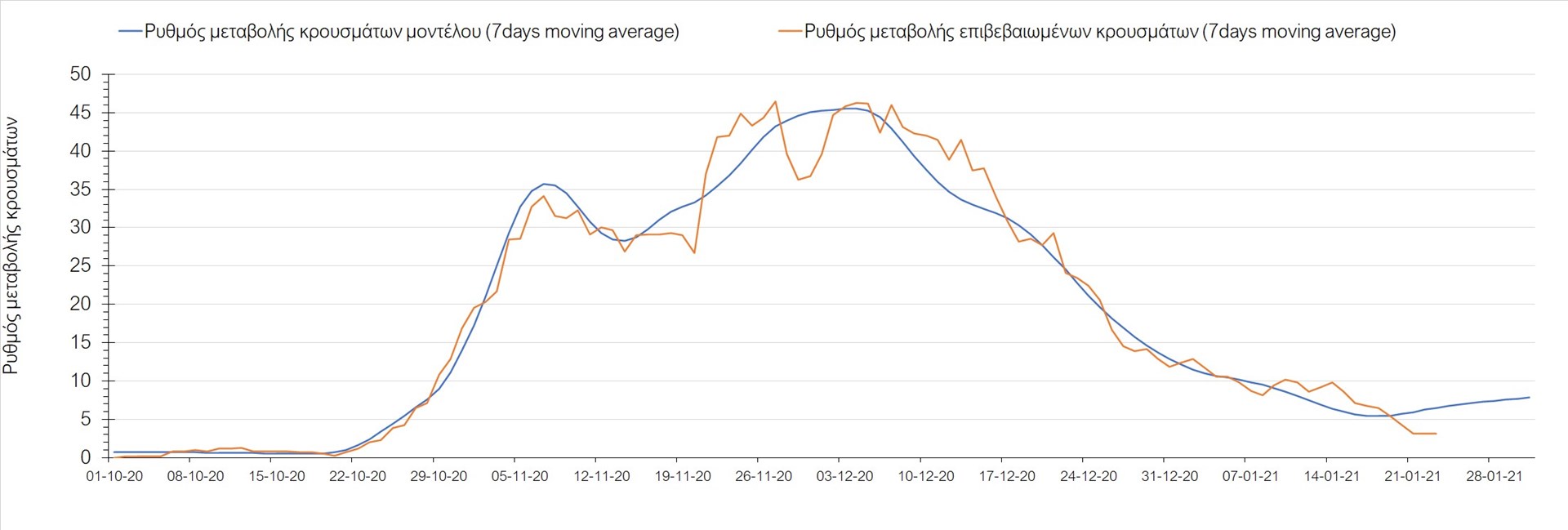 Όπως φαίνεται από το διάγραμμα, από τις 8 Ιανουαρίου έχουμε μια αύξηση κρουσμάτων μέχρι τις 11 Ιανουαρίου η οποία οφείλεται στη μείωση της περιστολής που σημειώθηκε στις γιορτές. Από τις 11 μέχρι τις 18 Ιανουαρίου προβλεπόταν μια μείωση κρουσμάτων λόγω της εφαρμογής του lockdown που είναι σε ισχύ και αυτήν την εβδομάδα και η οποία όντως παρατηρήθηκε. Από τις 23 Ιανουαρίου και έπειτα προβλέπεται να διαφανεί μια ελαφρά αύξηση στον κυλιόμενο μέσο όρο των κρουσμάτων που θα συνεχιστεί μέχρι το τέλος του μήνα, η οποία επίσης έχει αρχίσει να διαφαίνεται, παρόλο που ο αριθμός των τεστ είναι λίγο χαμηλότερος από τα συνήθη επίπεδα των 35000.
