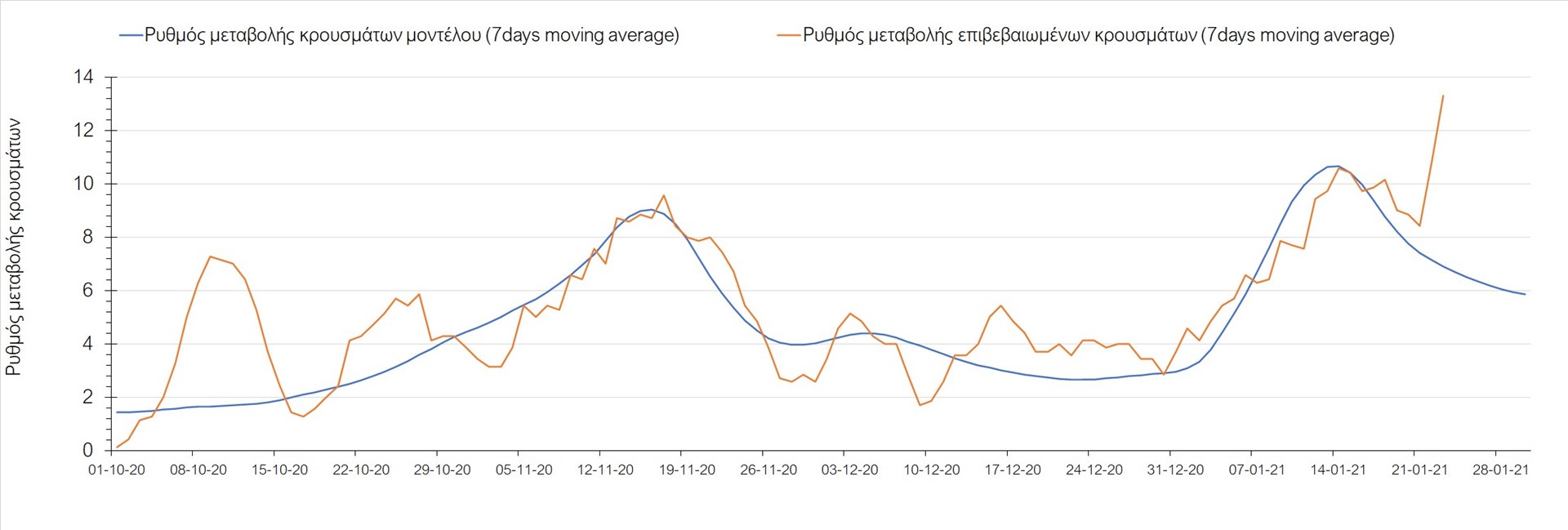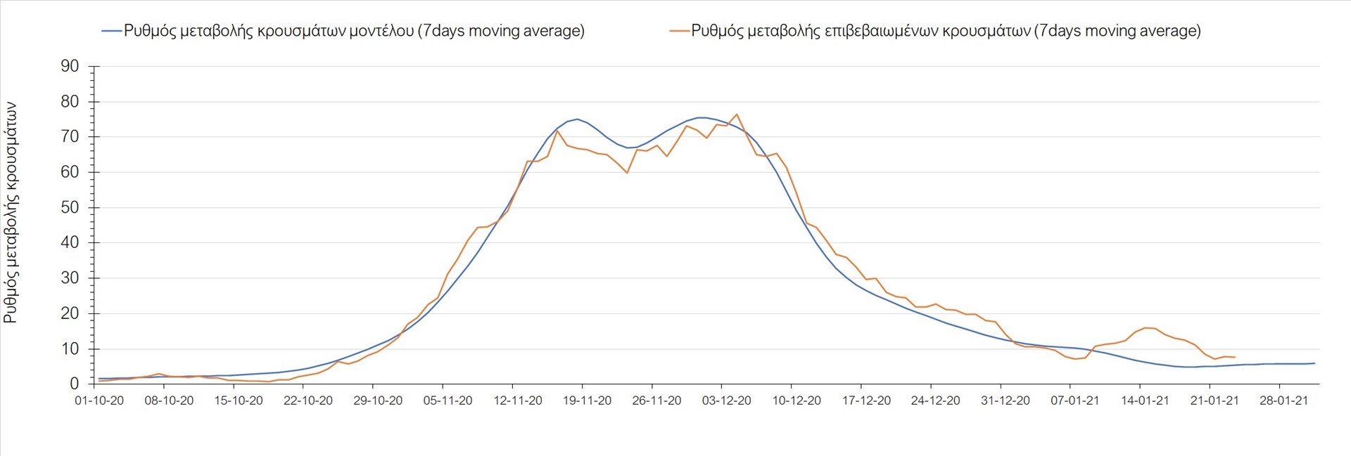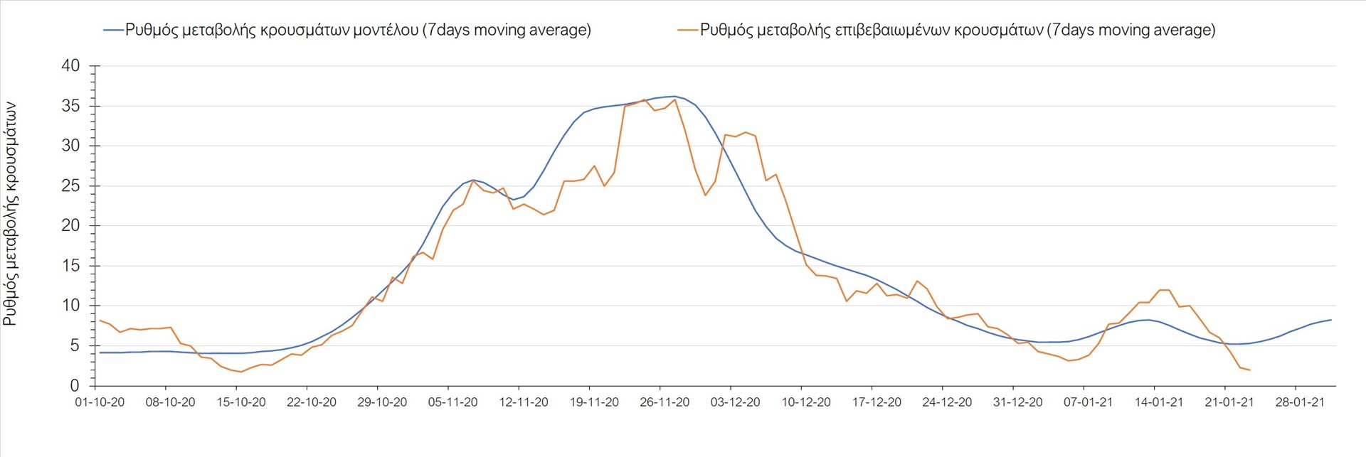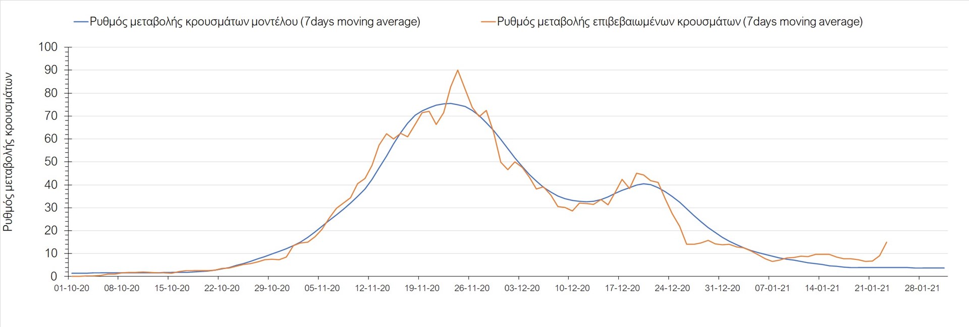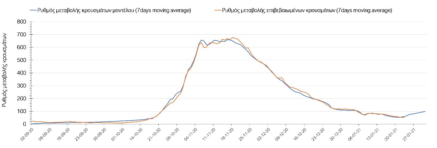 Όπως φαίνεται από το διάγραμμα, από τις 8 Ιανουαρίου έχουμε μια αύξηση κρουσμάτων μέχρι τις 11 Ιανουαρίου η οποία οφείλεται στη μείωση της περιστολής που σημειώθηκε στις γιορτές. Από τις 11 μέχρι τις 18 Ιανουαρίου προβλεπόταν μια μείωση κρουσμάτων λόγω της εφαρμογής του lockdown που είναι σε ισχύ και αυτήν την εβδομάδα και η οποία όντως παρατηρήθηκε. Από τις 23 Ιανουαρίου και έπειτα προβλέπεται να διαφανεί μια ελαφρά αύξηση στον κυλιόμενο μέσο όρο των κρουσμάτων που θα συνεχιστεί μέχρι το τέλος του μήνα, η οποία επίσης έχει αρχίσει να διαφαίνεται, παρόλο που ο αριθμός των τεστ είναι λίγο χαμηλότερος από τα συνήθη επίπεδα των 35000.