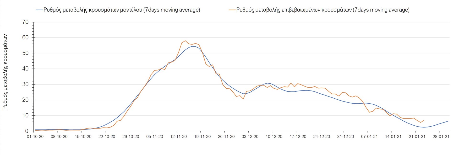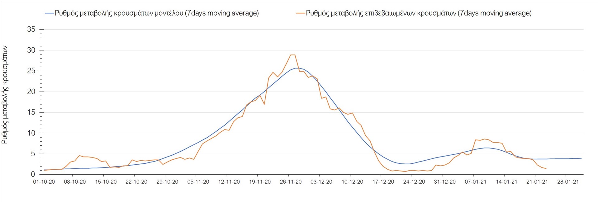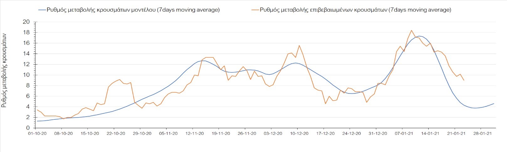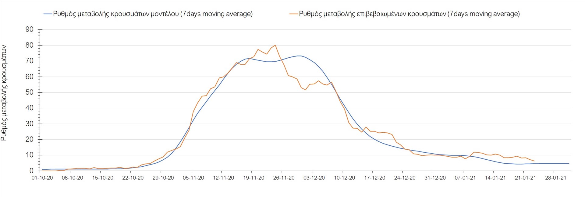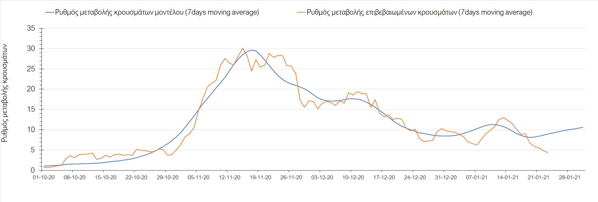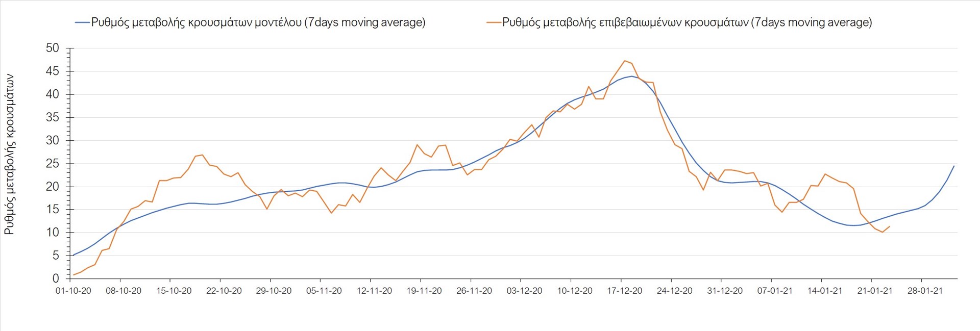 Όπως φαίνεται από το διάγραμμα, από τις 8 Ιανουαρίου έχουμε μια αύξηση κρουσμάτων μέχρι τις 11 Ιανουαρίου η οποία οφείλεται στη μείωση της περιστολής που σημειώθηκε στις γιορτές. Από τις 11 μέχρι τις 18 Ιανουαρίου προβλεπόταν μια μείωση κρουσμάτων λόγω της εφαρμογής του lockdown που είναι σε ισχύ και αυτήν την εβδομάδα και η οποία όντως παρατηρήθηκε. Από τις 23 Ιανουαρίου και έπειτα προβλέπεται να διαφανεί μια ελαφρά αύξηση στον κυλιόμενο μέσο όρο των κρουσμάτων που θα συνεχιστεί μέχρι το τέλος του μήνα, η οποία επίσης έχει αρχίσει να διαφαίνεται, παρόλο που ο αριθμός των τεστ είναι λίγο χαμηλότερος από τα συνήθη επίπεδα των 35000.