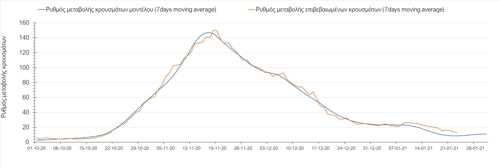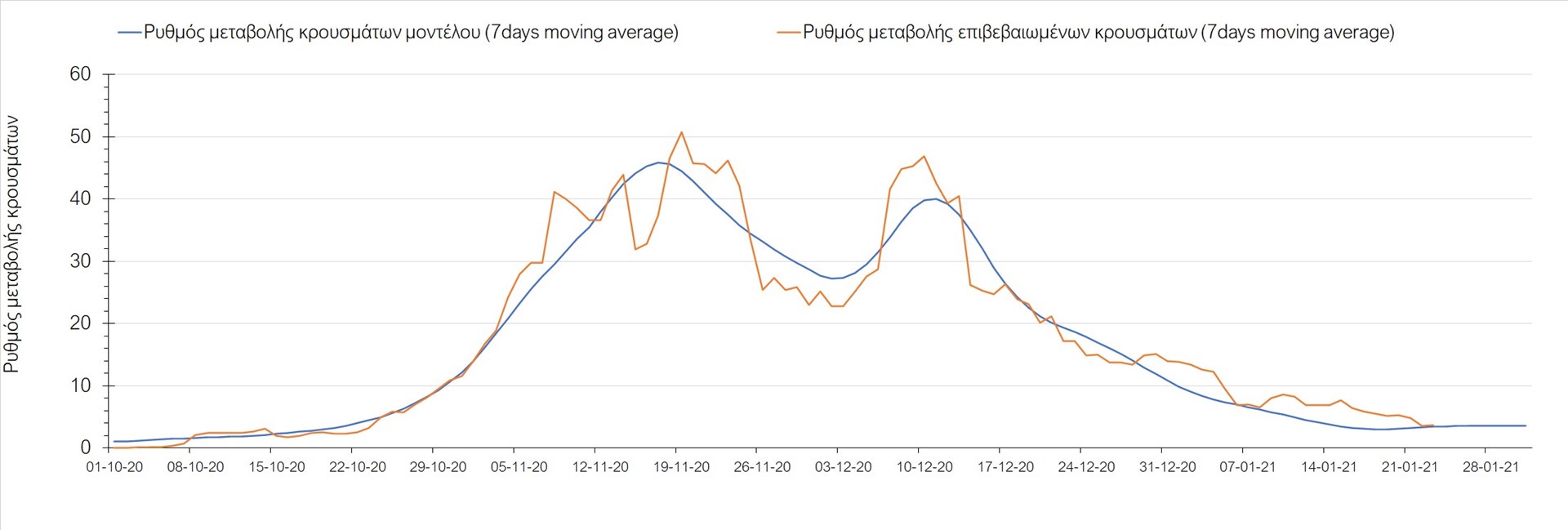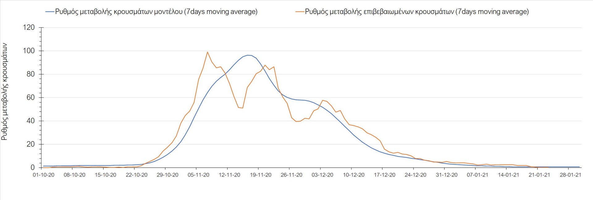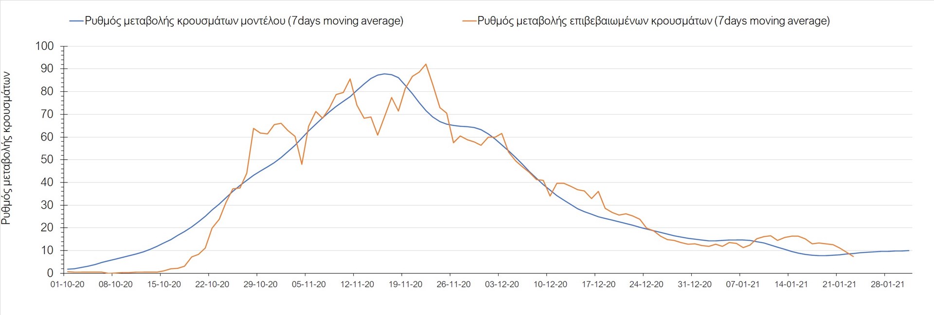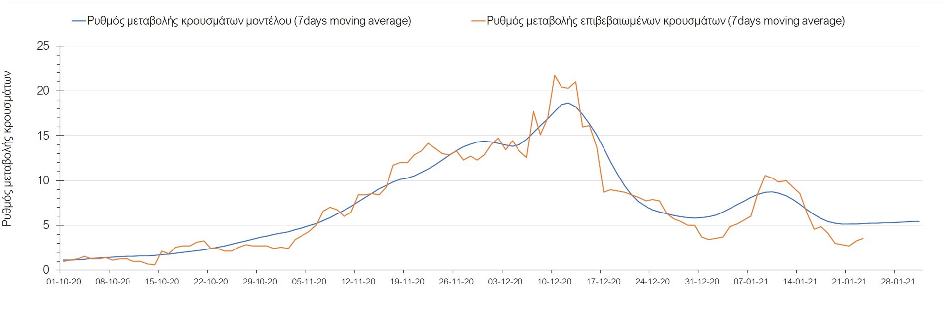 Όπως φαίνεται από το διάγραμμα, από τις 8 Ιανουαρίου έχουμε μια αύξηση κρουσμάτων μέχρι τις 11 Ιανουαρίου η οποία οφείλεται στη μείωση της περιστολής που σημειώθηκε στις γιορτές. Από τις 11 μέχρι τις 18 Ιανουαρίου προβλεπόταν μια μείωση κρουσμάτων λόγω της εφαρμογής του lockdown που είναι σε ισχύ και αυτήν την εβδομάδα και η οποία όντως παρατηρήθηκε. Από τις 23 Ιανουαρίου και έπειτα προβλέπεται να διαφανεί μια ελαφρά αύξηση στον κυλιόμενο μέσο όρο των κρουσμάτων που θα συνεχιστεί μέχρι το τέλος του μήνα, η οποία επίσης έχει αρχίσει να διαφαίνεται, παρόλο που ο αριθμός των τεστ είναι λίγο χαμηλότερος από τα συνήθη επίπεδα των 35000.