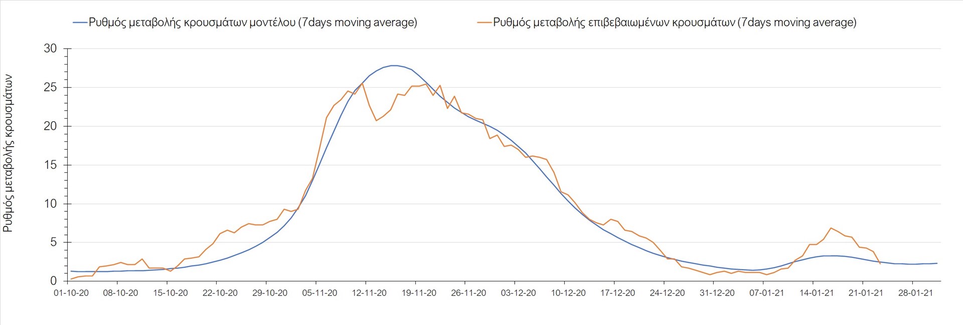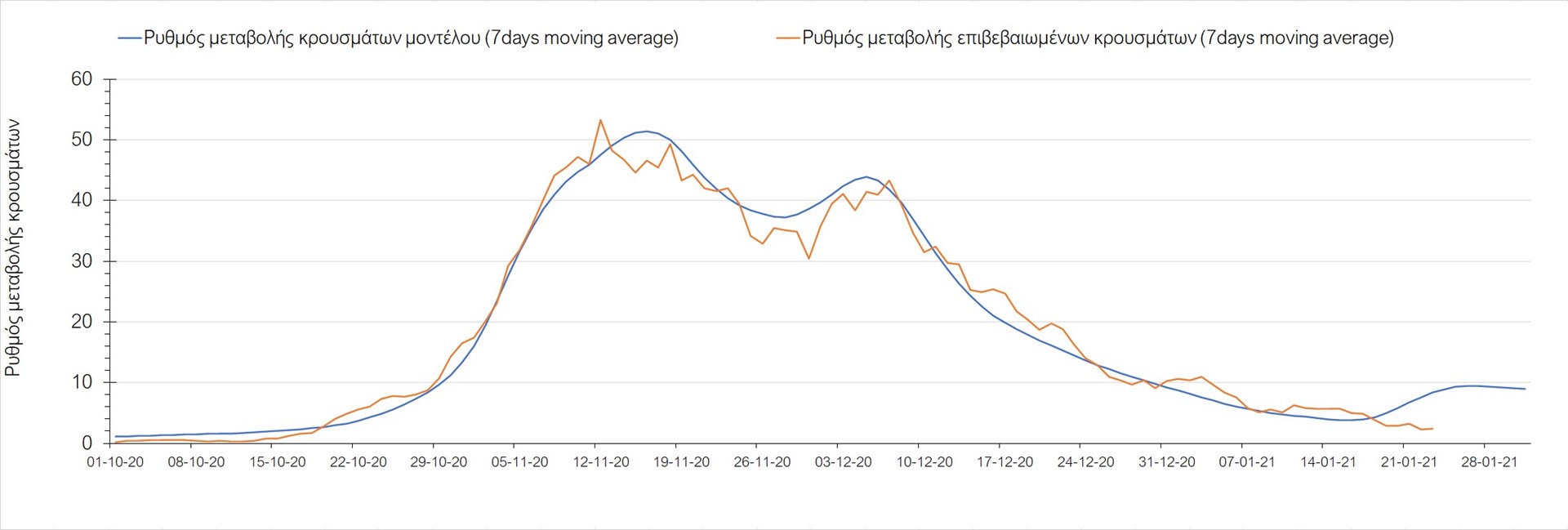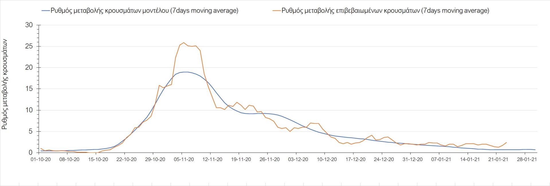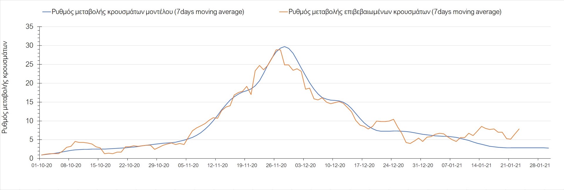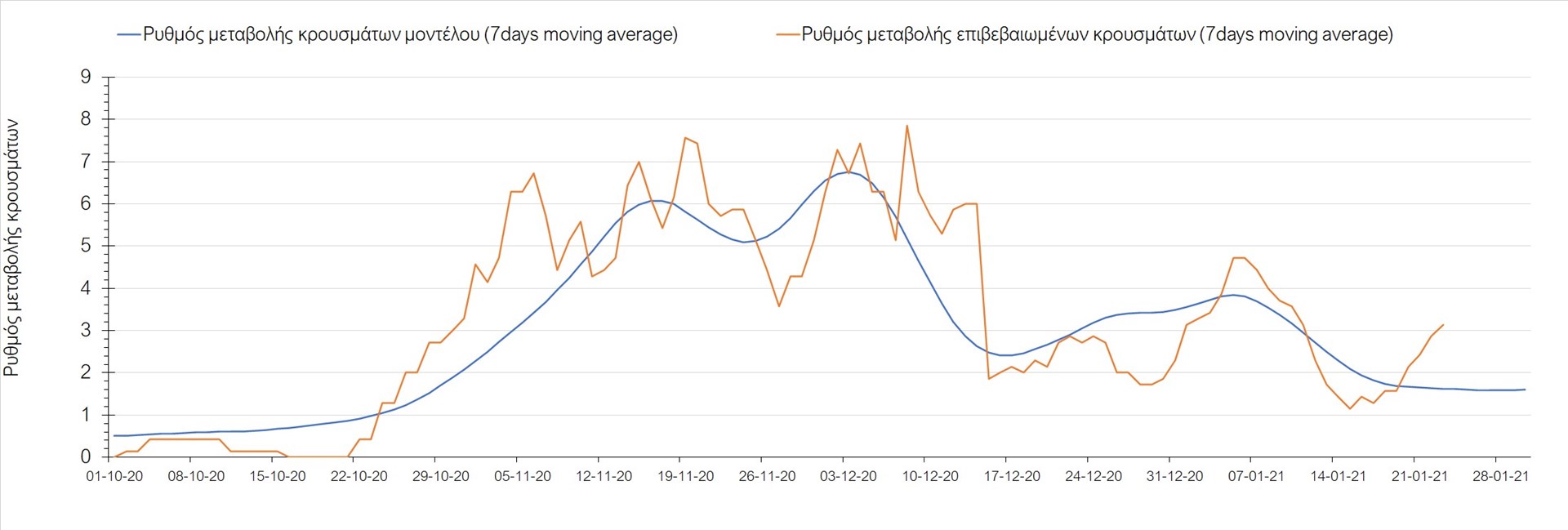 Όπως φαίνεται από το διάγραμμα, από τις 8 Ιανουαρίου έχουμε μια αύξηση κρουσμάτων μέχρι τις 11 Ιανουαρίου η οποία οφείλεται στη μείωση της περιστολής που σημειώθηκε στις γιορτές. Από τις 11 μέχρι τις 18 Ιανουαρίου προβλεπόταν μια μείωση κρουσμάτων λόγω της εφαρμογής του lockdown που είναι σε ισχύ και αυτήν την εβδομάδα και η οποία όντως παρατηρήθηκε. Από τις 23 Ιανουαρίου και έπειτα προβλέπεται να διαφανεί μια ελαφρά αύξηση στον κυλιόμενο μέσο όρο των κρουσμάτων που θα συνεχιστεί μέχρι το τέλος του μήνα, η οποία επίσης έχει αρχίσει να διαφαίνεται, παρόλο που ο αριθμός των τεστ είναι λίγο χαμηλότερος από τα συνήθη επίπεδα των 35000.