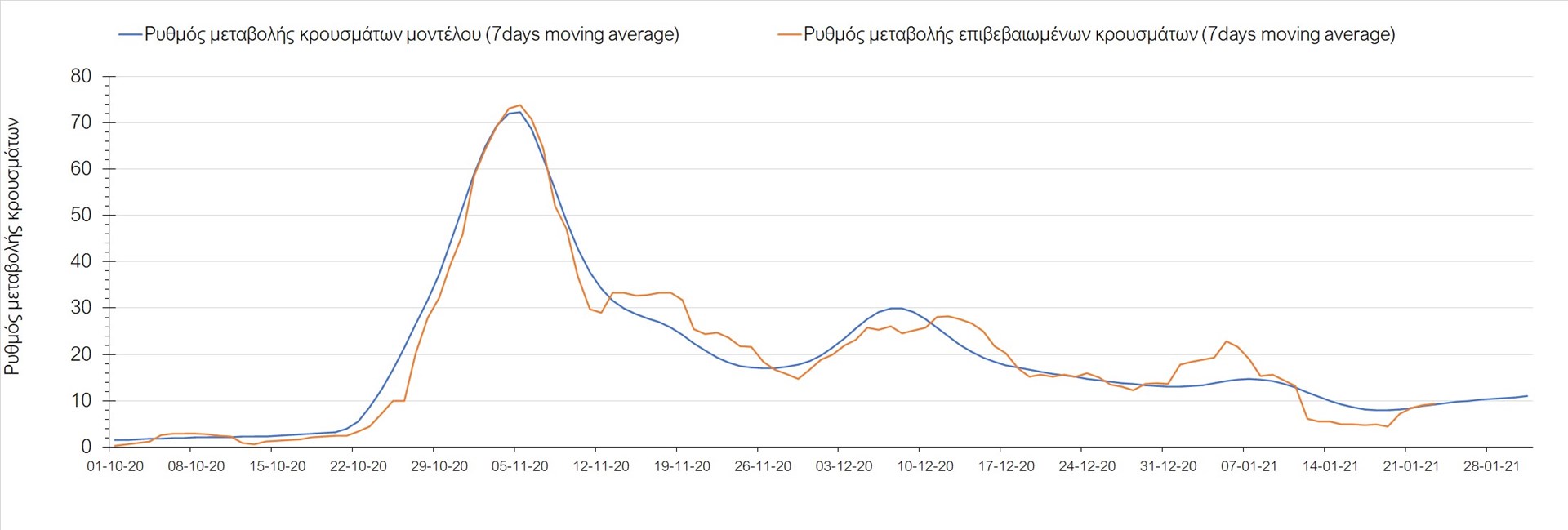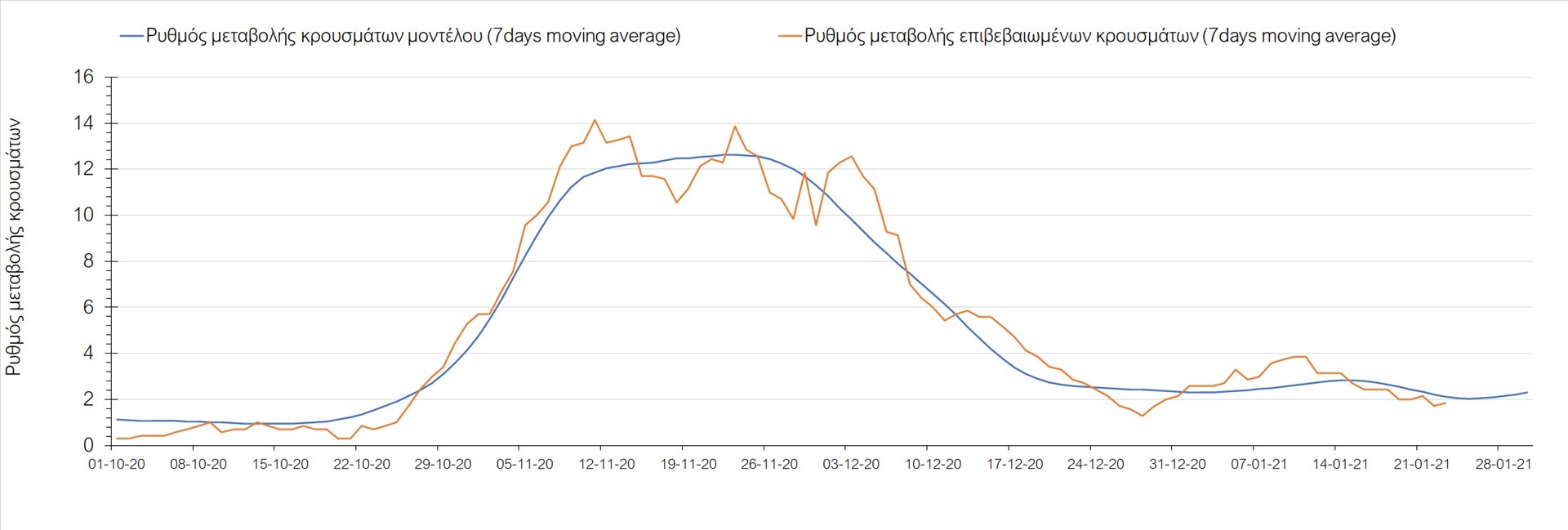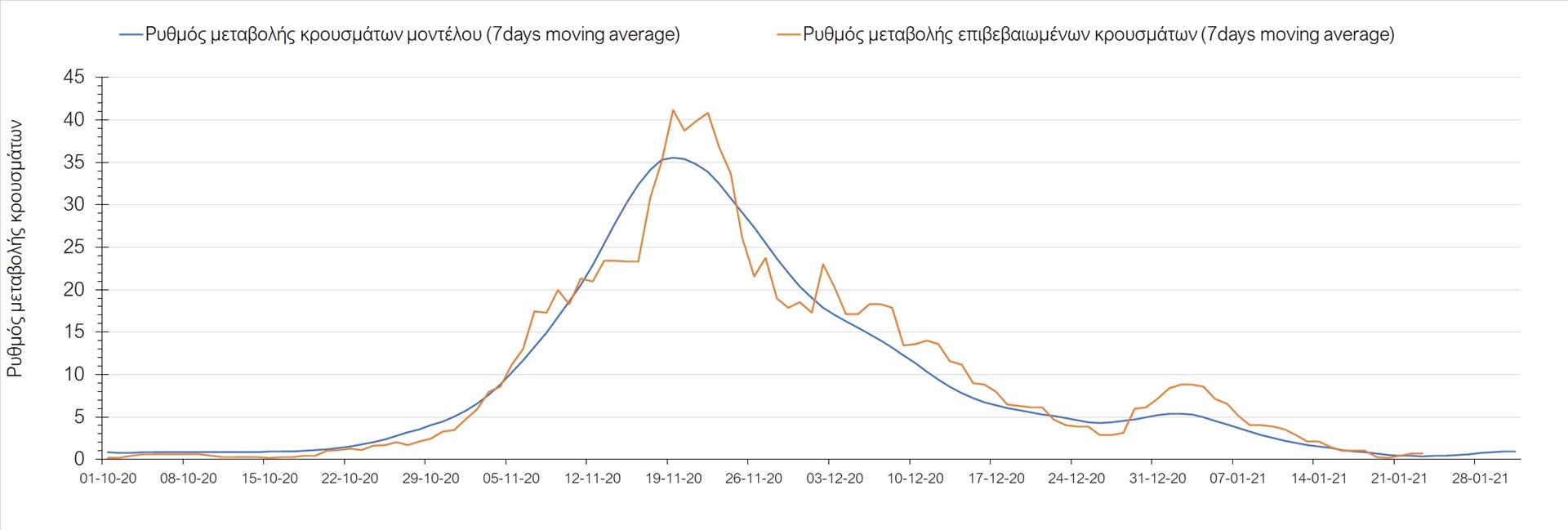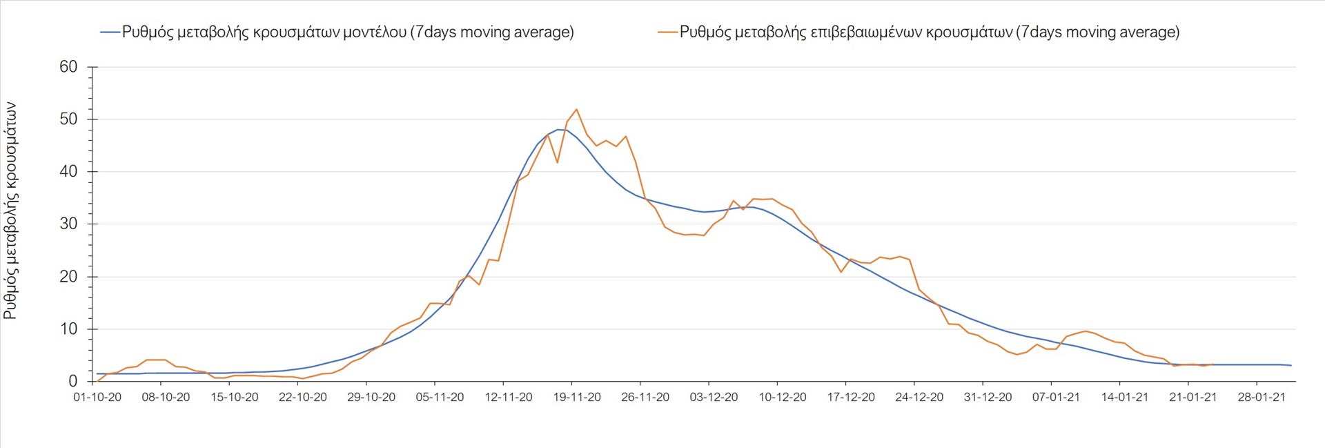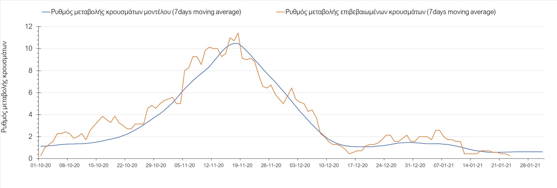 Όπως φαίνεται από το διάγραμμα, από τις 8 Ιανουαρίου έχουμε μια αύξηση κρουσμάτων μέχρι τις 11 Ιανουαρίου η οποία οφείλεται στη μείωση της περιστολής που σημειώθηκε στις γιορτές. Από τις 11 μέχρι τις 18 Ιανουαρίου προβλεπόταν μια μείωση κρουσμάτων λόγω της εφαρμογής του lockdown που είναι σε ισχύ και αυτήν την εβδομάδα και η οποία όντως παρατηρήθηκε. Από τις 23 Ιανουαρίου και έπειτα προβλέπεται να διαφανεί μια ελαφρά αύξηση στον κυλιόμενο μέσο όρο των κρουσμάτων που θα συνεχιστεί μέχρι το τέλος του μήνα, η οποία επίσης έχει αρχίσει να διαφαίνεται, παρόλο που ο αριθμός των τεστ είναι λίγο χαμηλότερος από τα συνήθη επίπεδα των 35000.