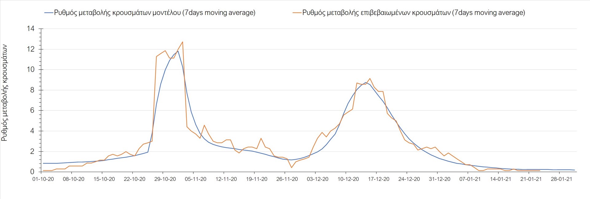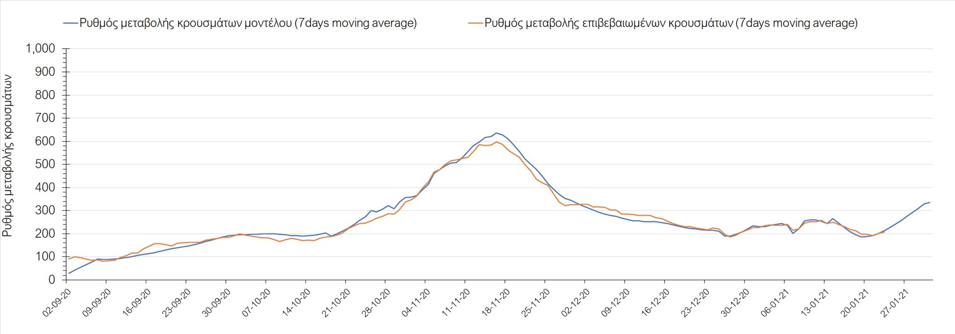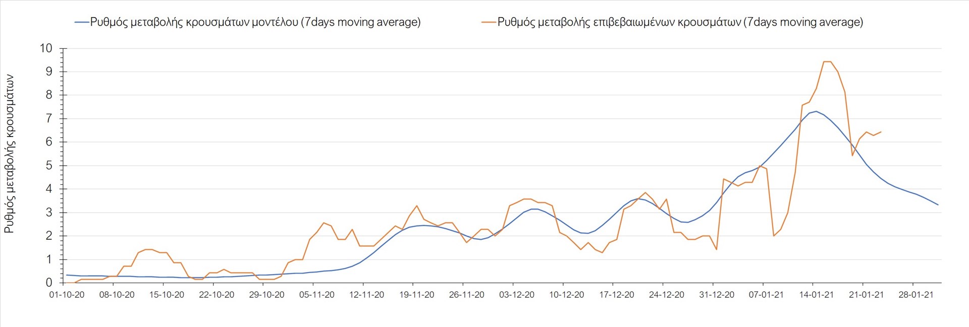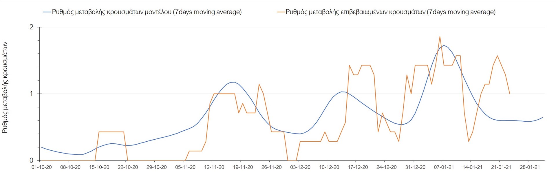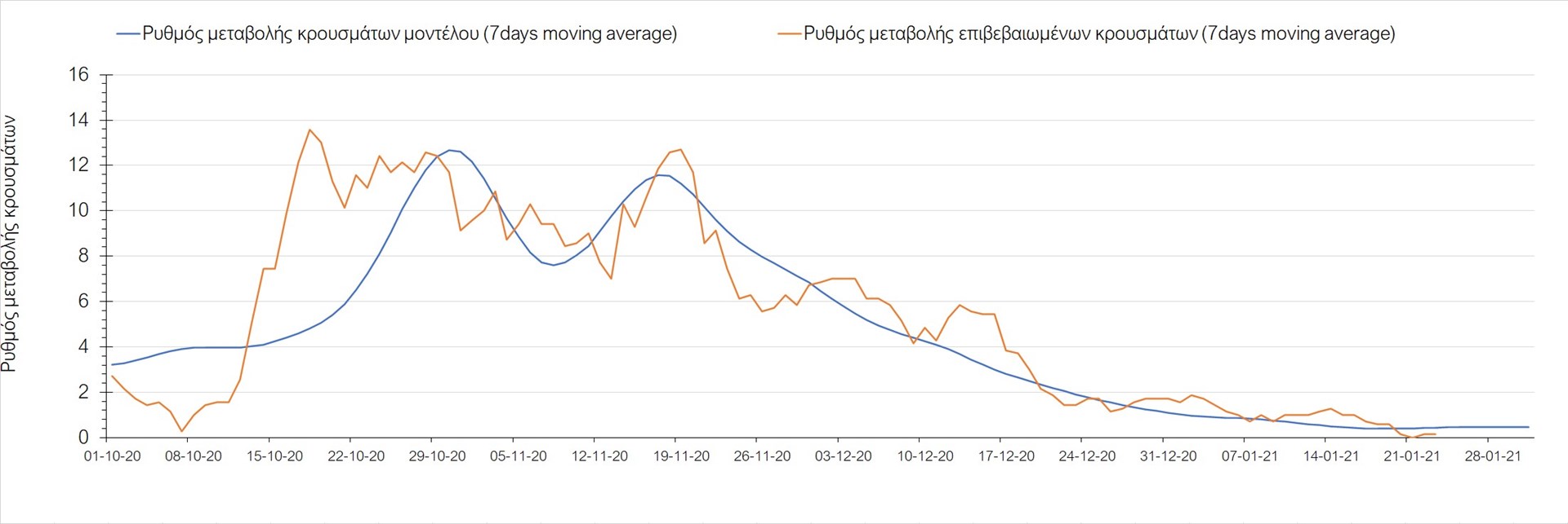 Όπως φαίνεται από το διάγραμμα, από τις 8 Ιανουαρίου έχουμε μια αύξηση κρουσμάτων μέχρι τις 11 Ιανουαρίου η οποία οφείλεται στη μείωση της περιστολής που σημειώθηκε στις γιορτές. Από τις 11 μέχρι τις 18 Ιανουαρίου προβλεπόταν μια μείωση κρουσμάτων λόγω της εφαρμογής του lockdown που είναι σε ισχύ και αυτήν την εβδομάδα και η οποία όντως παρατηρήθηκε. Από τις 23 Ιανουαρίου και έπειτα προβλέπεται να διαφανεί μια ελαφρά αύξηση στον κυλιόμενο μέσο όρο των κρουσμάτων που θα συνεχιστεί μέχρι το τέλος του μήνα, η οποία επίσης έχει αρχίσει να διαφαίνεται, παρόλο που ο αριθμός των τεστ είναι λίγο χαμηλότερος από τα συνήθη επίπεδα των 35000.