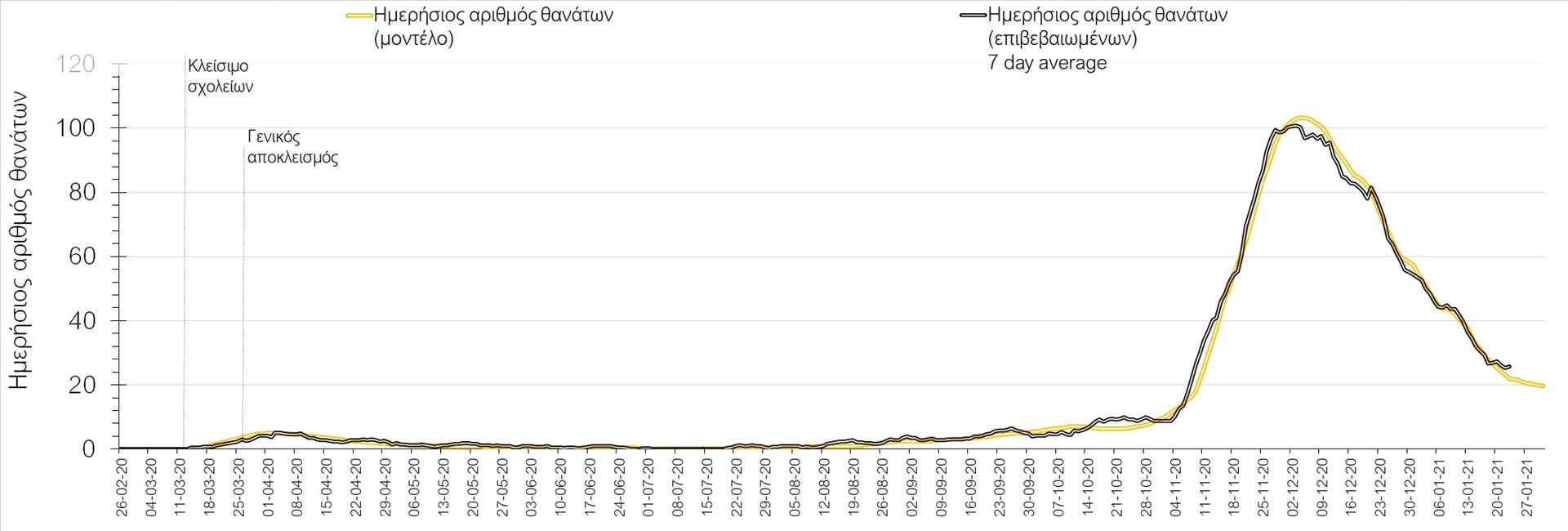 Σχήμα 2. Αριθμός θανάτων (κυλιόμενος μέσος όρος 7 ημερών) σύμφωνα με τα στοιχεία του ΕΟΔΥ και τις προβλέψεις της υπολογιστικής πλατφόρμας CORE.Και στις δύο περιπτώσεις φαίνεται ότι βρισκόμαστε περίπου γύρω στο 92% της αποκλιμάκωσης όπως είχαμε προβλέψει (βλέπε σχήματα 1 και 2). Επιπλέον, τόσο στους ασθενείς σε κρίσιμη κατάσταση (διασωληνωμένοι σε ΜΕΘ), όσο και στον αριθμό των θανάτων από COVID-19, θα υπάρξει μια μείωση στο ρυθμό αποκλιμάκωσης και με δεδομένη την άρση των μέτρων περιστολής που ισχύουν αυτή την εβδομάδα αναμένεται μια αργή αναστροφή της αποκλιμακωτικής πορείας από το τέλος της πρώτης εβδομάδας του Φεβρουαρίου και έπειτα.