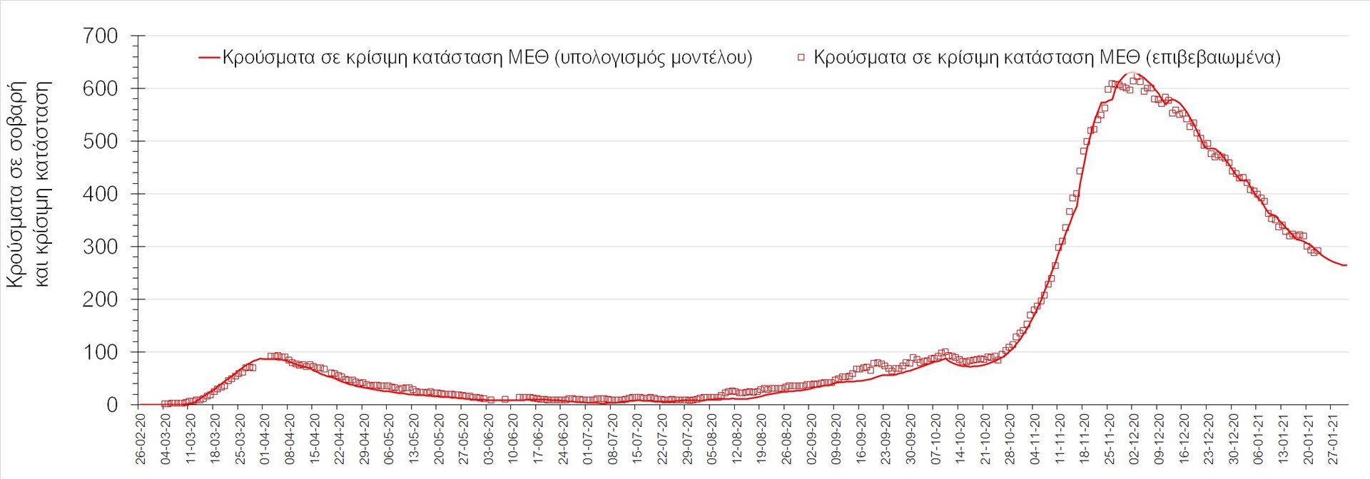 Σχήμα 1. Αριθμός κρουσμάτων σε κρίσιμη κατάσταση (ΜΕΘ) σύμφωνα με τα στοιχεία του ΕΟΔΥ και τις προβλέψεις της υπολογιστικής πλατφόρμας CORE