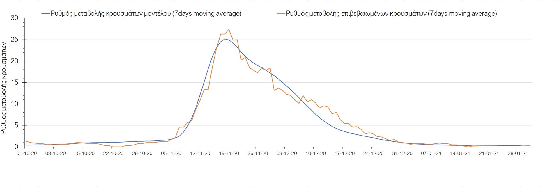 Σχήμα 26. Πορεία του ημερησίου αριθμού των κρουσμάτων (κυλιόμενος μέσος όρος 7 ημερών) στην Πιερία