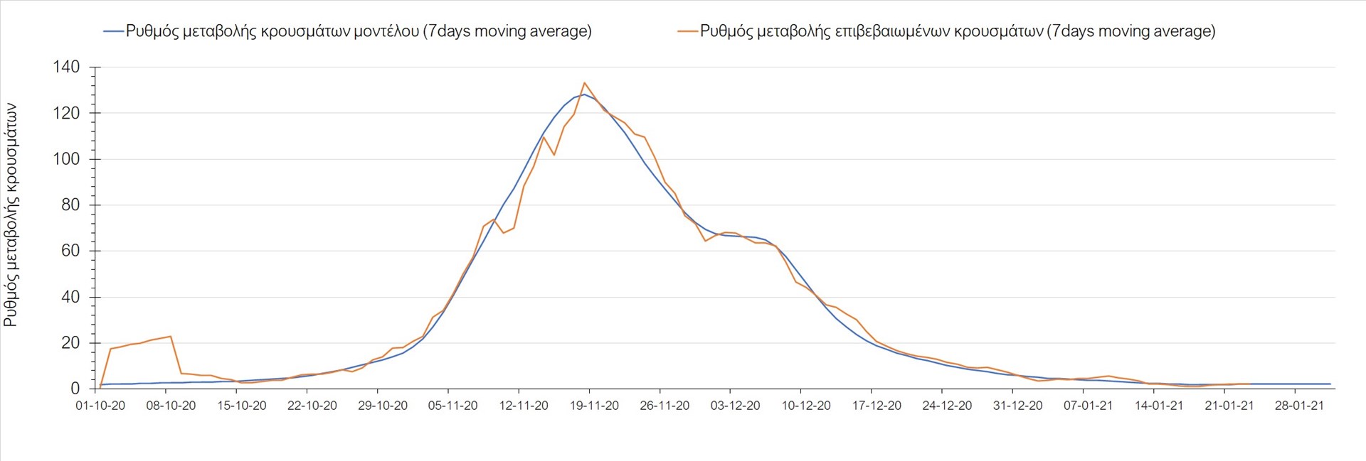 Σχήμα 39. Πορεία του ημερησίου αριθμού των κρουσμάτων (κυλιόμενος μέσος όρος 7 ημερών) στην ΘάσοΣυμπεράσματα:Η συνολική πορεία των κρουσμάτων, αλλά και η αποκλιμάκωση που παρατηρείται στον αριθμό των ασθενών σε κρίσιμη κατάσταση (διασωληνωμένοι σε ΜΕΘ), μετά τα αποτελέσματα του Σαββάτου, συνάδει με τις προσομοιώσεις του μοντέλου CORE για τον επόμενο μήνα. Σε πανελλαδικό επίπεδο ο κυλιόμενος εβδομαδιαίος μέσος όρος του δείκτη θετικότητας παρέμεινε σταθερός στο 2,1% (η ημερήσια τιμή το Σάββατο είναι 1,9%) ενώ ο κυλιόμενος εβδομαδιαίος μέσος όρος του πραγματικού αριθμού αναπαραγωγής Rt (δηλαδή ο αριθμός των ατόμων που ένας φορέας μπορεί να επιμολύνει) είναι 0,91 (τιμές του Rt κάτω από τη μονάδα υποδηλώνουν καθαρή μείωση της διασποράς του ιού στην κοινότητα). Οι τιμές αυτές δείχνουν ότι καλώς εφαρμόσθηκε το γενικευμένο lockdown στις 3 Ιανουαρίου, έτσι ώστε να αποσβεσθούν όποιες αποκλίσεις στην εφαρμογή των μέτρων υπήρξαν κατά την περίοδο των εορτών, δημιουργώντας θετικές προοπτικές στο σταδιακό άνοιγμα της οικονομίας που ξεκίνησε από τη Δευτέρα 18 Ιανουαρίου.