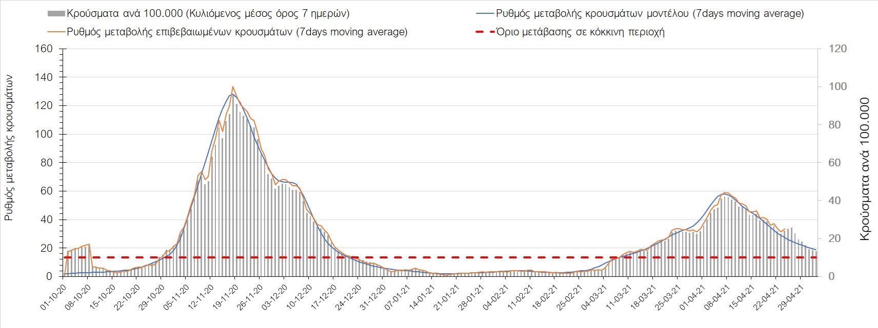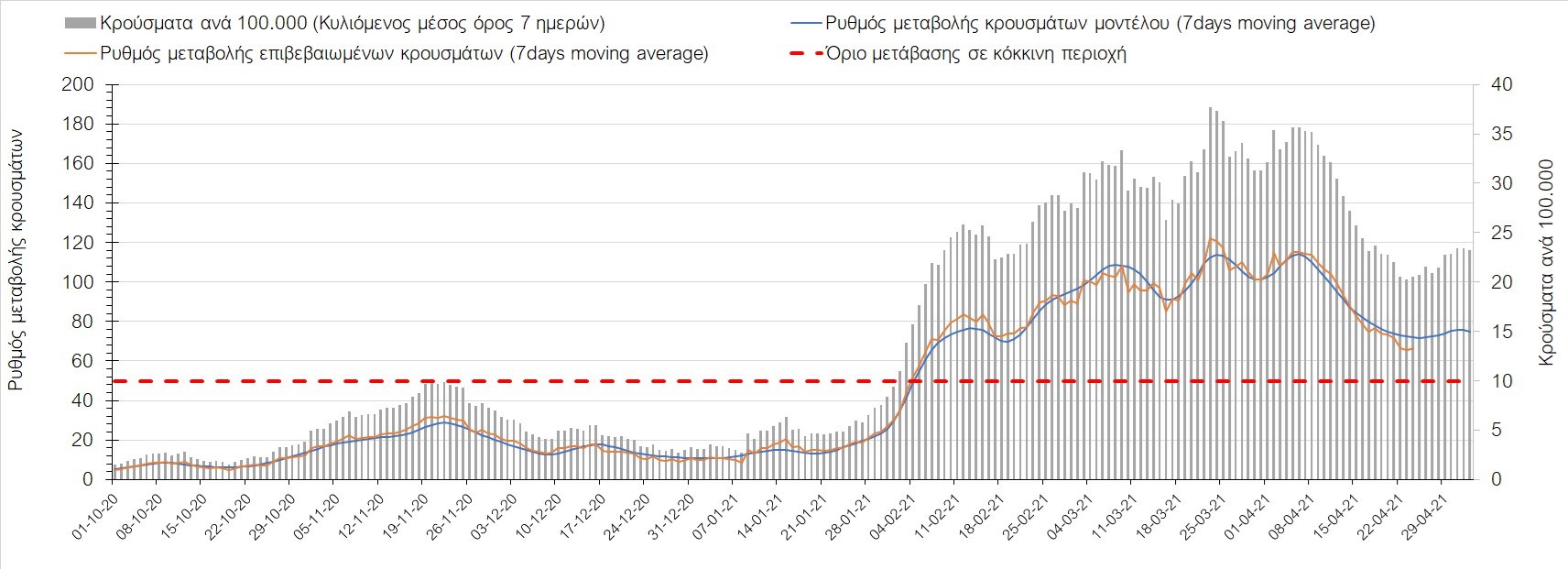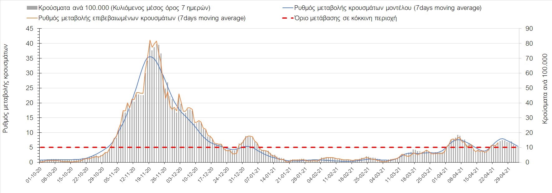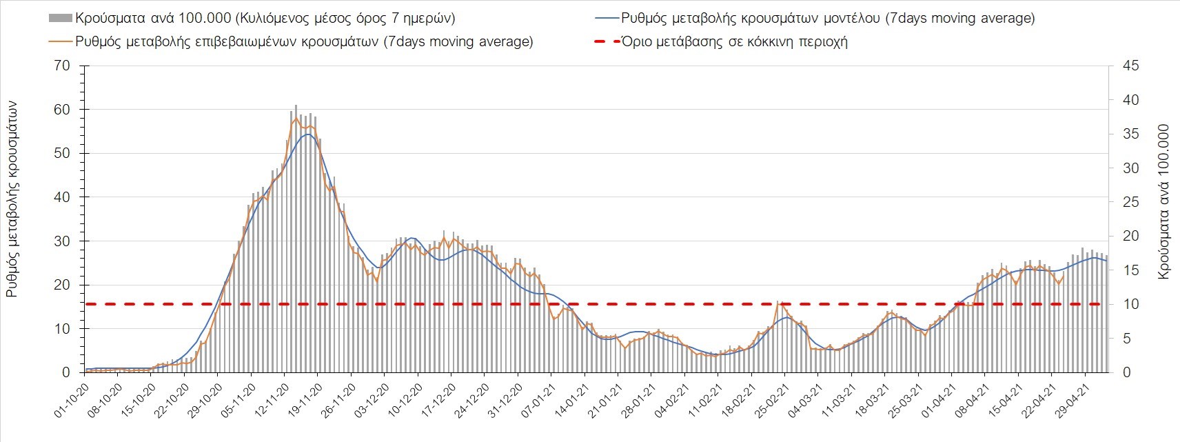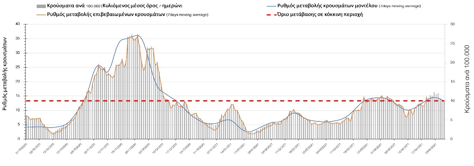Σχήμα 37. Πορεία του ημερησίου αριθμού των κρουσμάτων (κυλιόμενος μέσος όρος 7 ημερών) στην Πιερία