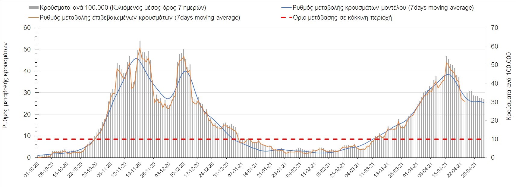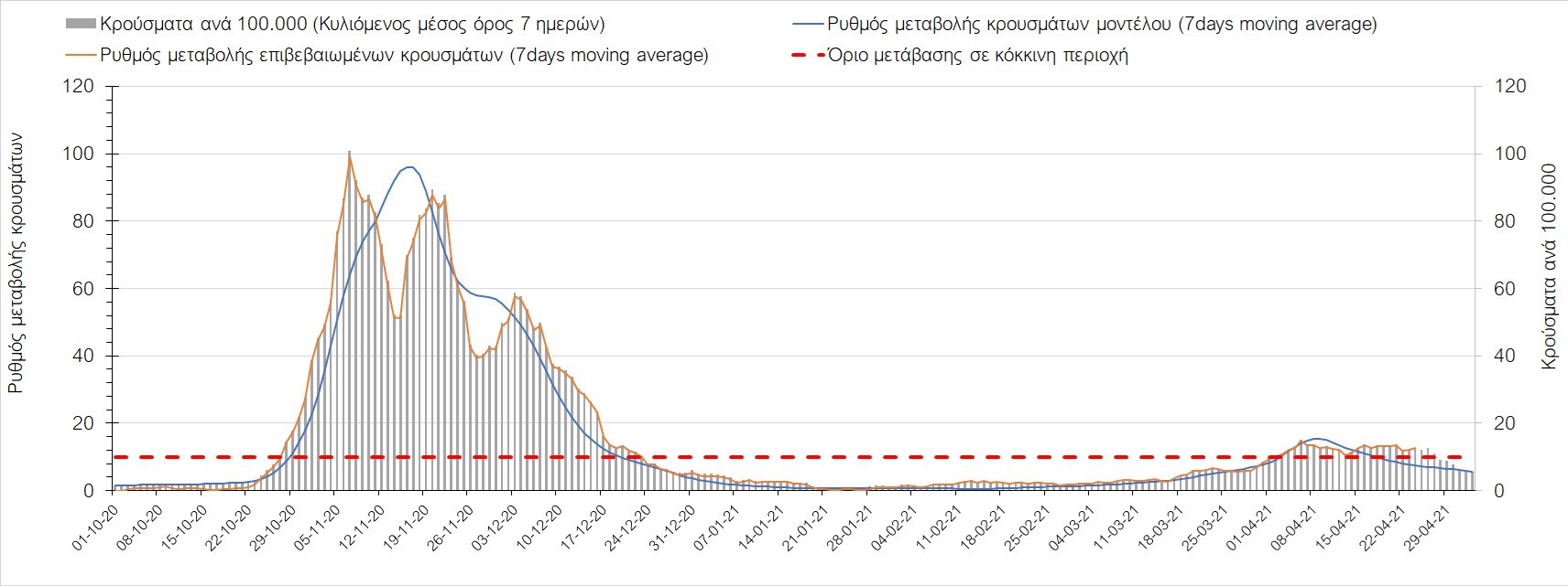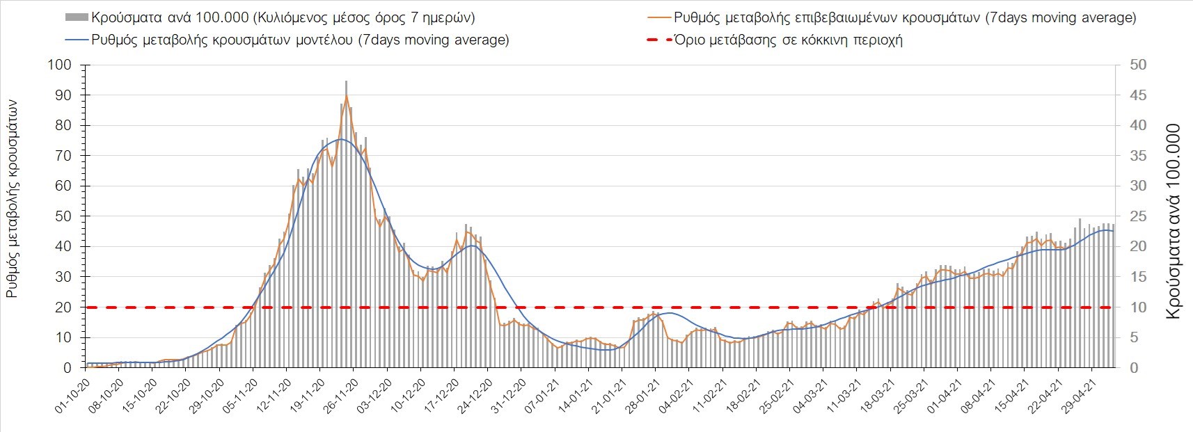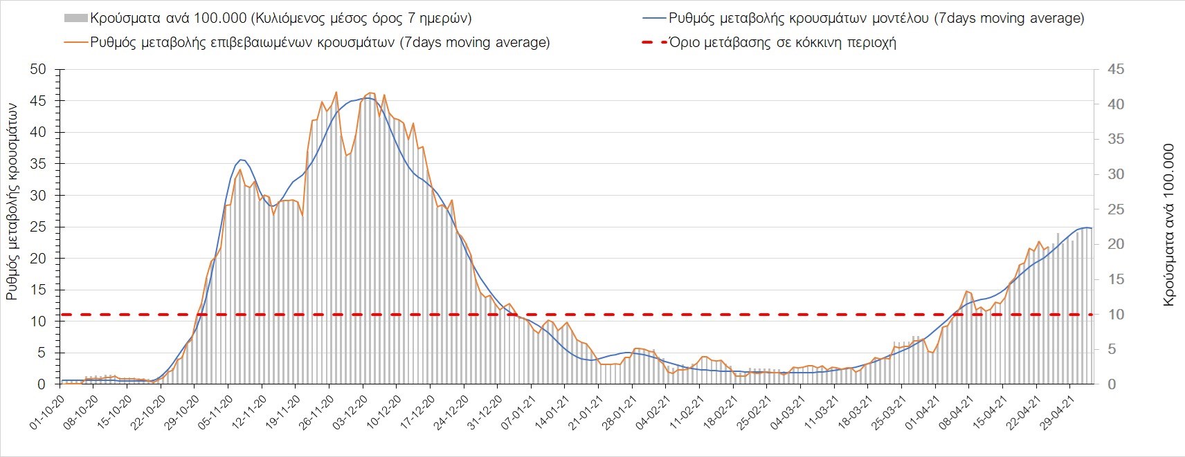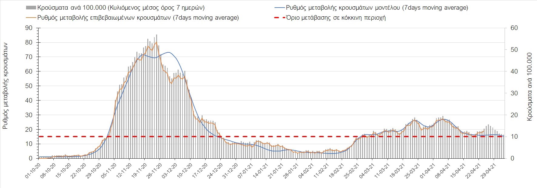 Σχήμα 37. Πορεία του ημερησίου αριθμού των κρουσμάτων (κυλιόμενος μέσος όρος 7 ημερών) στην Πιερία