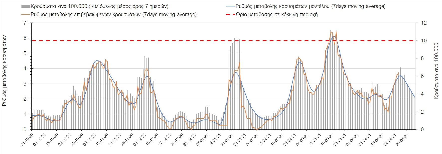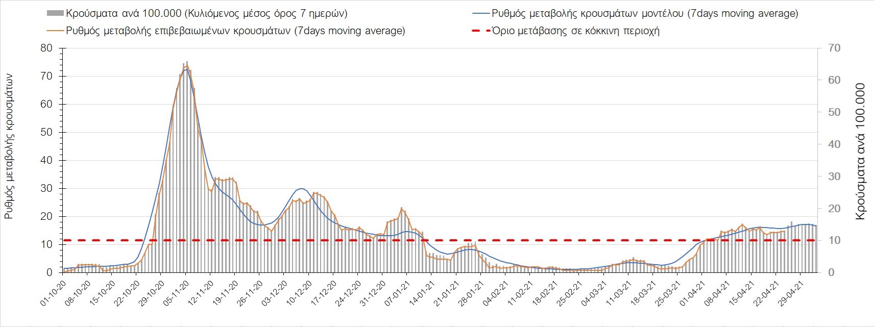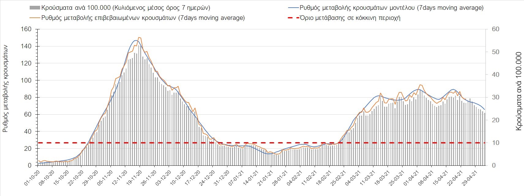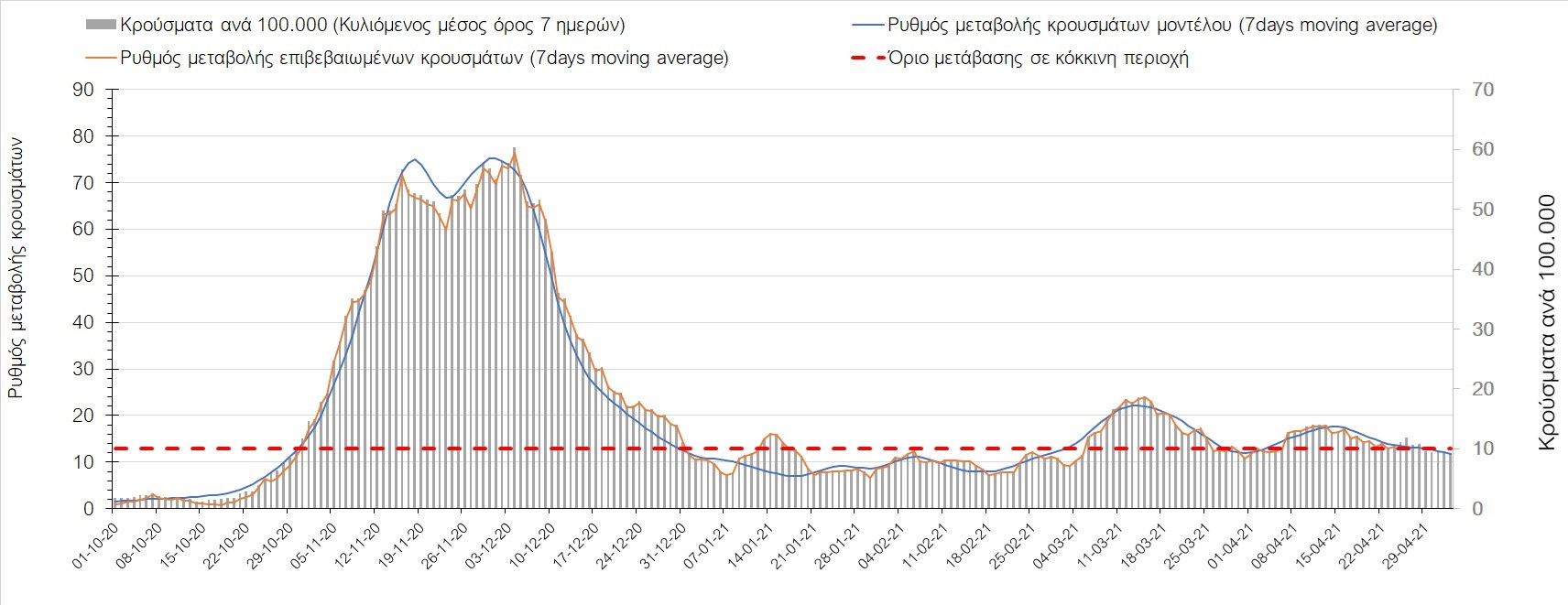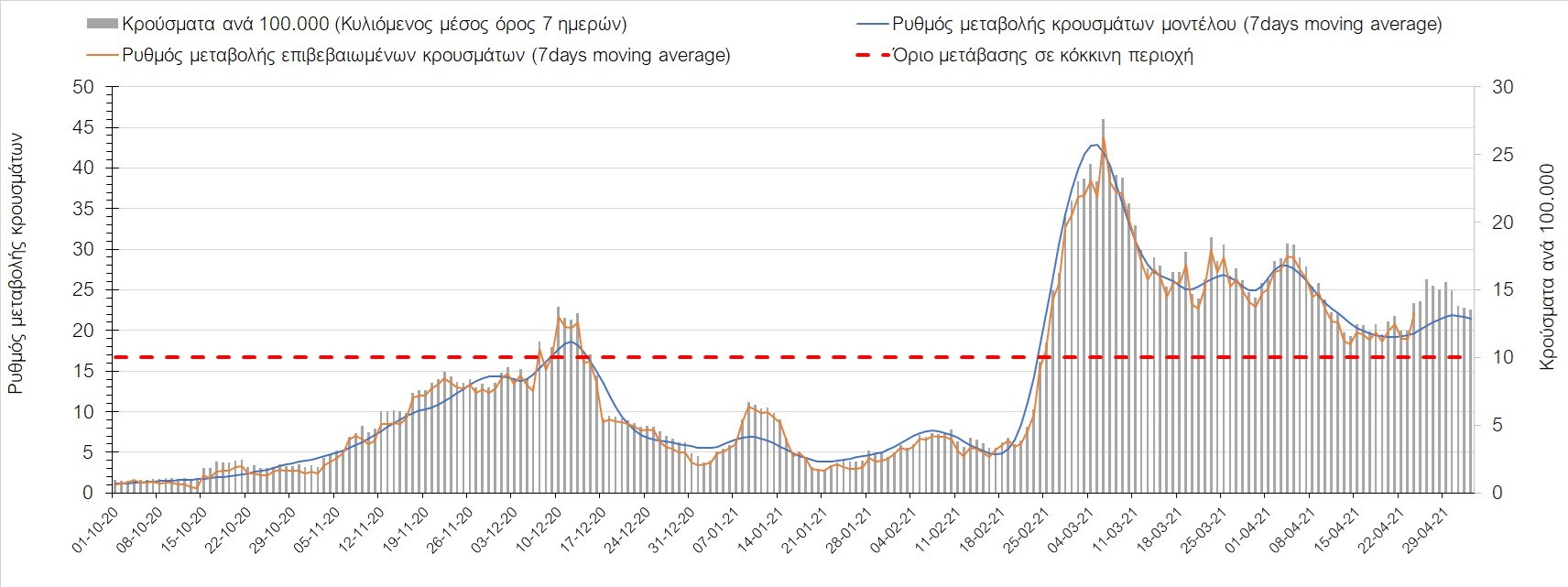 Σχήμα 37. Πορεία του ημερησίου αριθμού των κρουσμάτων (κυλιόμενος μέσος όρος 7 ημερών) στην Πιερία
