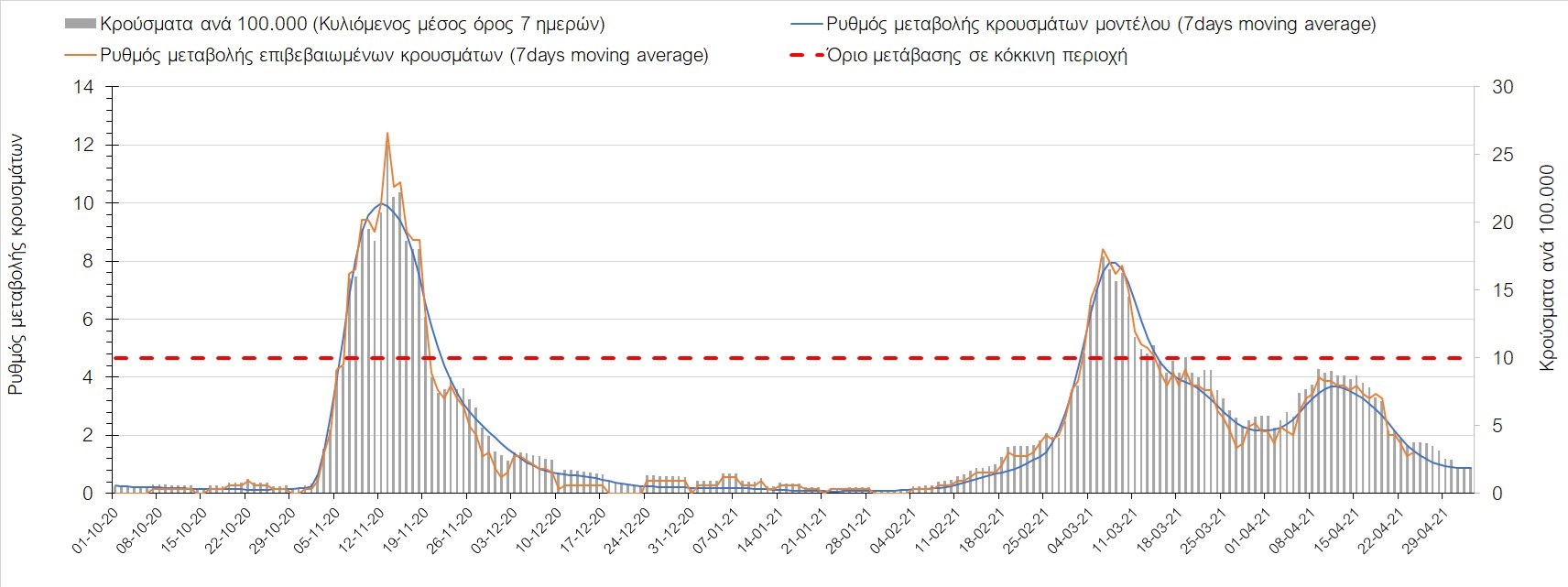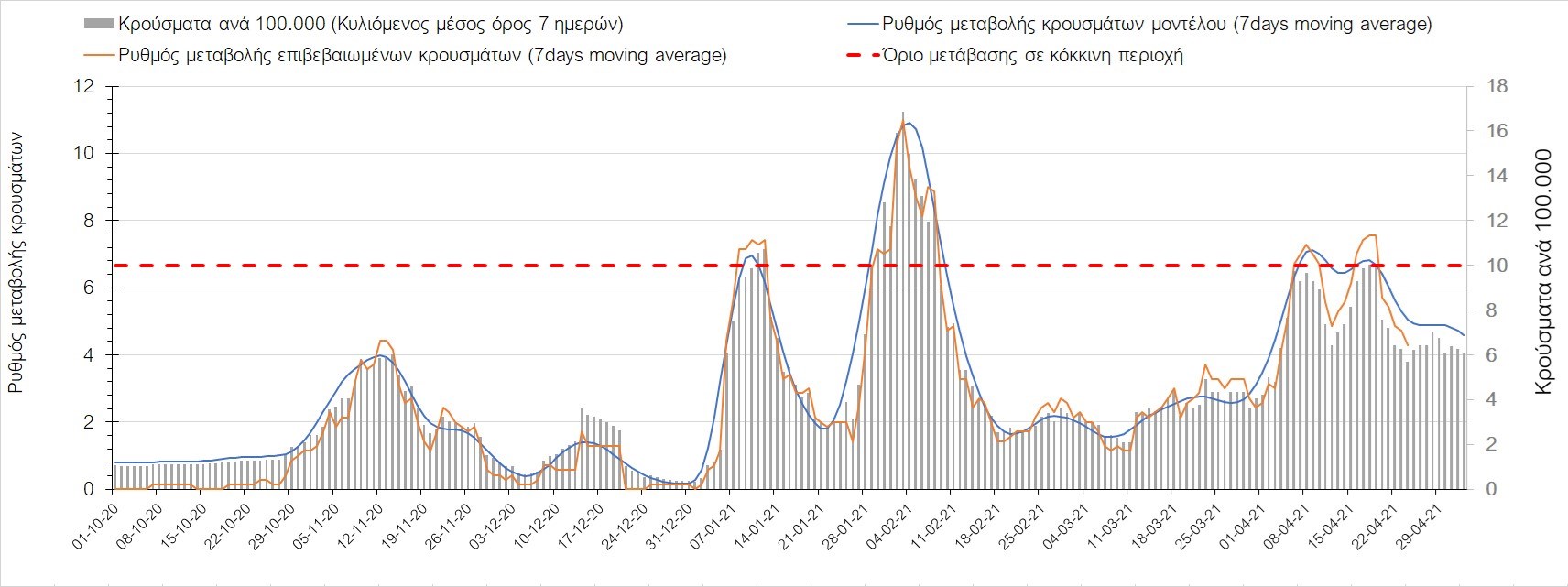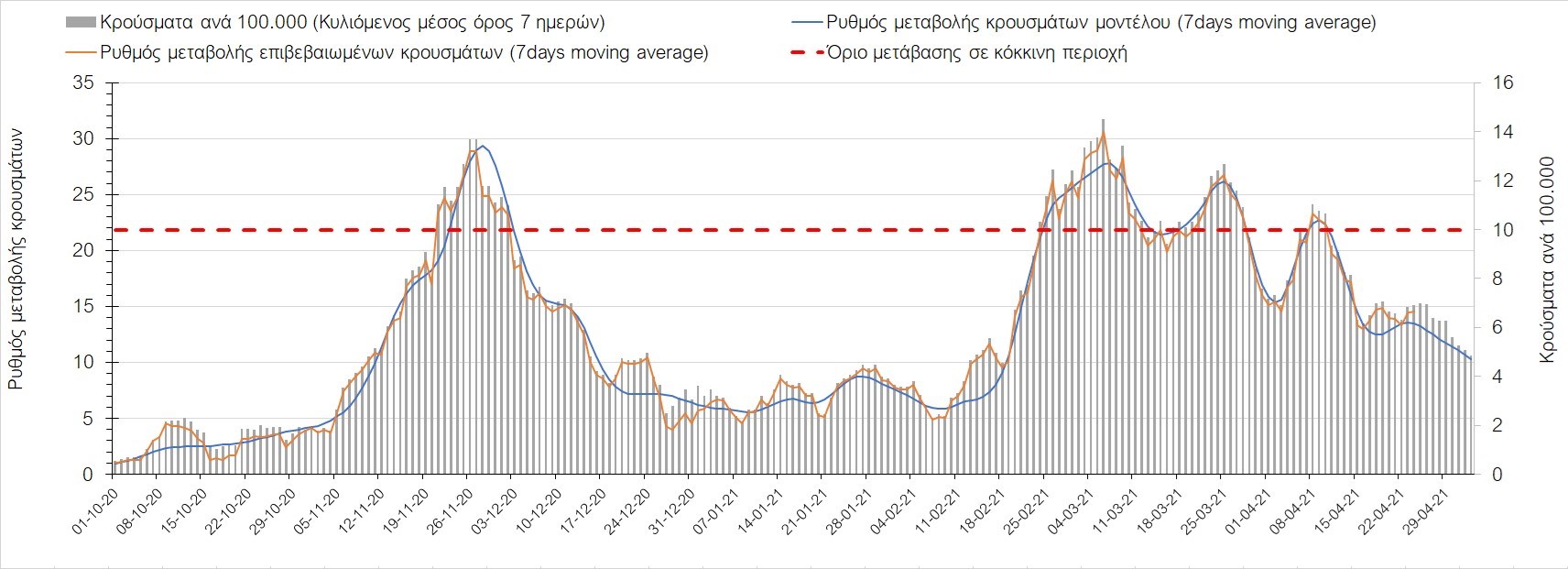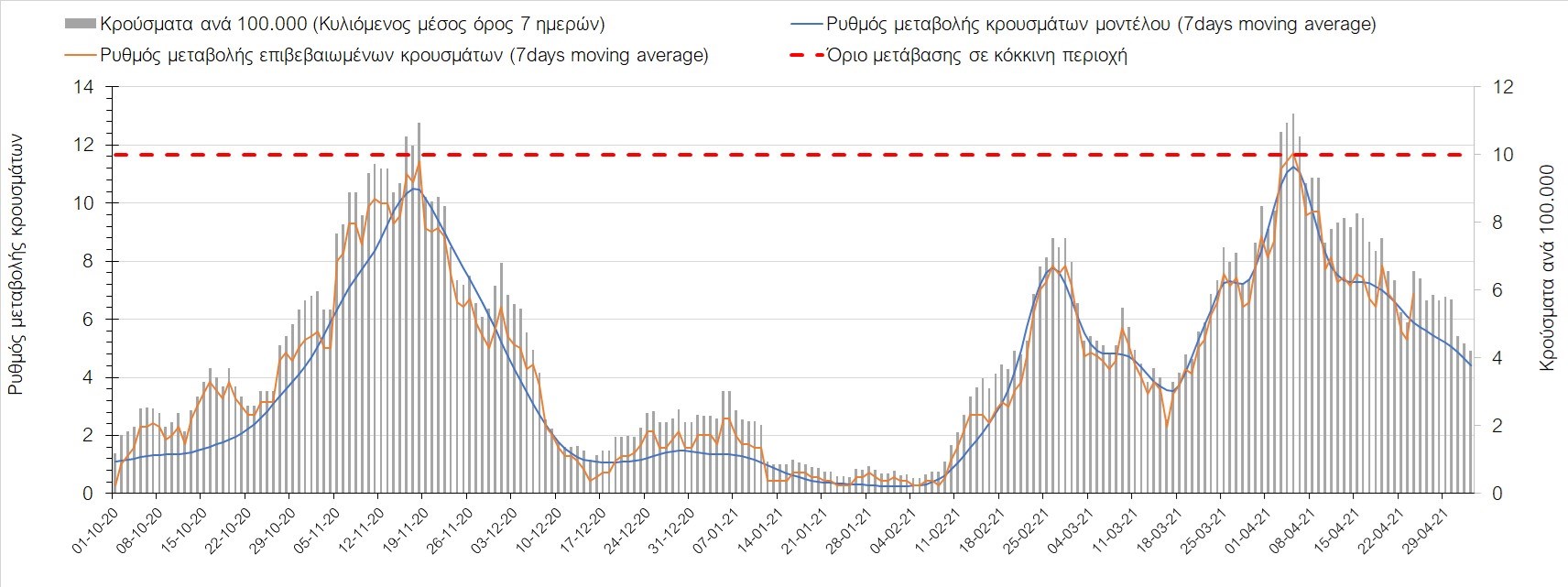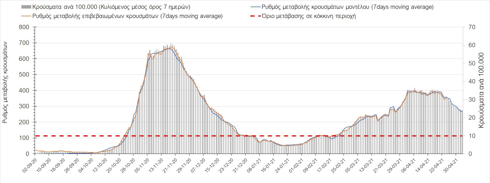 Σχήμα 37. Πορεία του ημερησίου αριθμού των κρουσμάτων (κυλιόμενος μέσος όρος 7 ημερών) στην Πιερία