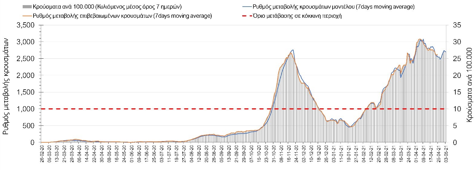 Σχήμα 5. Πορεία του ημερησίου αριθμού των κρουσμάτων (κυλιόμενος μέσος όρος 7 ημερών) στην Αττική