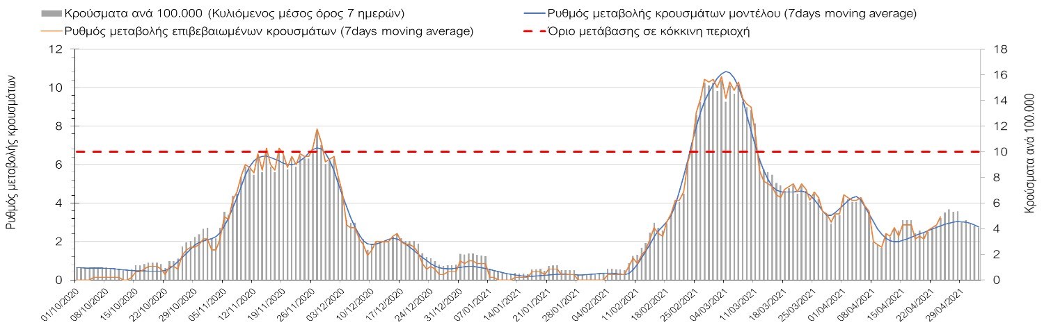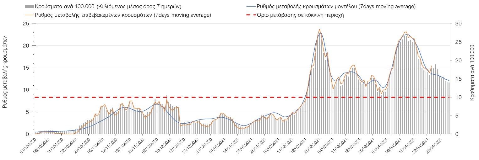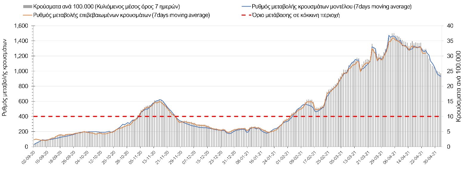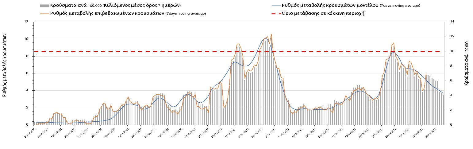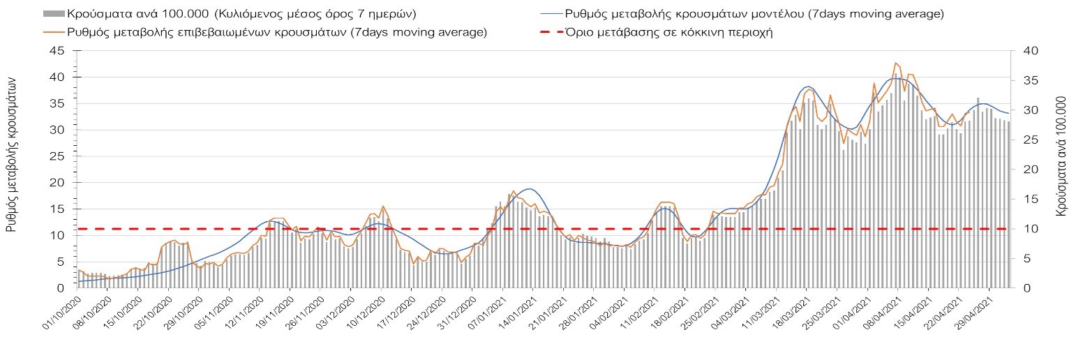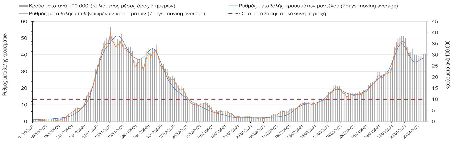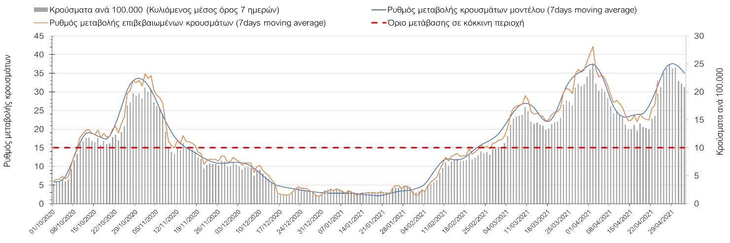 Με τα χθεσινά αποτελέσματα, διαφαίνεται κάμψη στον αριθμό των ασθενών σε κρίσιμη κατάσταση (διασωληνωμένοι σε ΜΕΘ), η οποία θα εκφραστεί σύντομα και στον αριθμό των θανάτων. Οι προβλέψεις αυτές συνάδουν με τις προσομοιώσεις του μοντέλου CORE, όπως και ο αριθμός των κρουσμάτων, μετά και τις επικαιροποιημένες προβλέψεις προ 40 ημερών, όπου ελήφθη υπόψιν η μεγαλύτερη διασπορά των μεταλλαγμένων και ταχύτερα μεταδιδόμενων στελεχών. Σε πανελλαδικό επίπεδο ο κυλιόμενος εβδομαδιαίος μέσος όρος του δείκτη θετικότητας διαμορφώθηκε στο 5,3% (η ημερήσια τιμή το Σάββατο ήταν είναι 3,9%) ενώ ο κυλιόμενος εβδομαδιαίος μέσος όρος του πραγματικού αριθμού αναπαραγωγής Rt (δηλαδή ο αριθμός των ατόμων που ένας φορέας μπορεί να επιμολύνει) διαμορφώθηκε στο 0,96 (τιμές του Rt κάτω από τη μονάδα υποδηλώνουν καθαρή μείωση της διασποράς του ιού στην κοινότητα). Η ταυτόχρονη μείωση και των δύο δεικτών, που παρατηρήθηκε τις προηγούμενες ημέρες και συνεχίζεται και αυτή την εβδομάδα, υποδηλώνει την κάμψη της ανοδικής τάσης στο σύνολο της χώρας. Σε αντίθεση με την προηγούμενη εβδομάδα, ο ρυθμός μείωσης των κρουσμάτων είναι μεγαλύτερος στη Θεσσαλονίκη από ότι στην Αθήνα, και ελπίζουμε να μη συμβεί κάποια αναστροφή της σχετικά καλής πορείας λόγω των φαινομένων συρροής που παρατηρήθηκαν την προηγουμένη εβδομάδα.Η ήπια αναχαίτιση του 3ου κύματος που παρατηρείται, οφείλεται σε ένα συνδυασμό παραμέτρων, οι οποίες είναι η συνέχιση του lockdown, η χρήση των self-test, η αύξηση του αριθμού των τεστ από τον ΕΟΔΥ, γεγονός που συντελεί στην απομάκρυνση από τις αλυσίδες μετάδοσης των ασυμπτωματικών και προσυμπτωματικών φορέων, η προοδευτική βελτίωση του καιρού και σε μικρότερο βαθμό η πρόοδος των εμβολιασμών, η σημασία των οποίων στον έλεγχο της πανδημίας θα αρχίσει να είναι πιο εμφανής από το τέλος του επόμενου μήνα. Όμως, με δεδομένο το άνοιγμα του λιανικού εμπορίου και των Λυκείων, είναι ακόμα πιο σημαντική η τήρηση των μέτρων, ενώ ύψιστης σημασίας στις επόμενες εβδομάδες θα αποδειχθεί η ορθή και μαζική εφαρμογή των self-test, με ταυτόχρονη αύξηση της ιχνηλασίας των επαφών των ανιχνευθέντων ως θετικοί και καραντίνα 14 ημερών για τους συμπολίτες μας που θα επιβεβαιωθεί ότι είναι θετικοί στην μόλυνση με SARS-CoV-2 ακόμη και αν είναι ασυμπτωματικοί. Δεδομένου ότι τελικά ο αριθμός των self-test που πραγματοποιούνται ημερησίως δεν έχει φθάσει στα επιθυμητά νούμερα στα οποία βασίζονται οι προβολές που παρουσιάζονται στην παρούσα τεχνική έκθεση μέχρι το Πάσχα, μόλις έχουμε νεώτερα για τον ακριβή αριθμό τους και τη συχνότητα εκτέλεσης αυτών, θα επαναεπικαιροποιήσουμε τις προβλέψεις μας. Αξίζει επίσης να σημειωθεί ότι στην Αθήνα τις τελευταίες ημέρες παρατηρήθηκαν συρροές, οι πιθανές επιπτώσεις των οποίων θα αποτυπωθούν στις επόμενες ημέρες. Τέλος, πολύ ισχυρές επιφυλάξεις έχουμε για το σχετικά πρόωρο άνοιγμα της εστίασης που αποφασίστηκε για τις 3 Μαΐου, και που θα μπορούσε να συντελέσει σε προσωρινή αναστροφή της διαφαινόμενης σταθεροποιητικής/πτωτικής πορείας προς το τέλος του Μαΐου. Επιπλέον πρέπει να γίνει εντελώς καθαρό ότι το πρόωρο άνοιγμα της εστίασης θα συντελέσει σε αύξηση των επαφών (και άρα της μεταδοτικότητας), και όχι σε αποσυμπίεση των εικόνων συνωστισμού που παρατηρούμε τις τελευταίες ημέρες κυρίως σε περιοχές της Αθήνας, δεδομένου ότι η εστίαση θα δώσει την ευκαιρία αύξησης τω