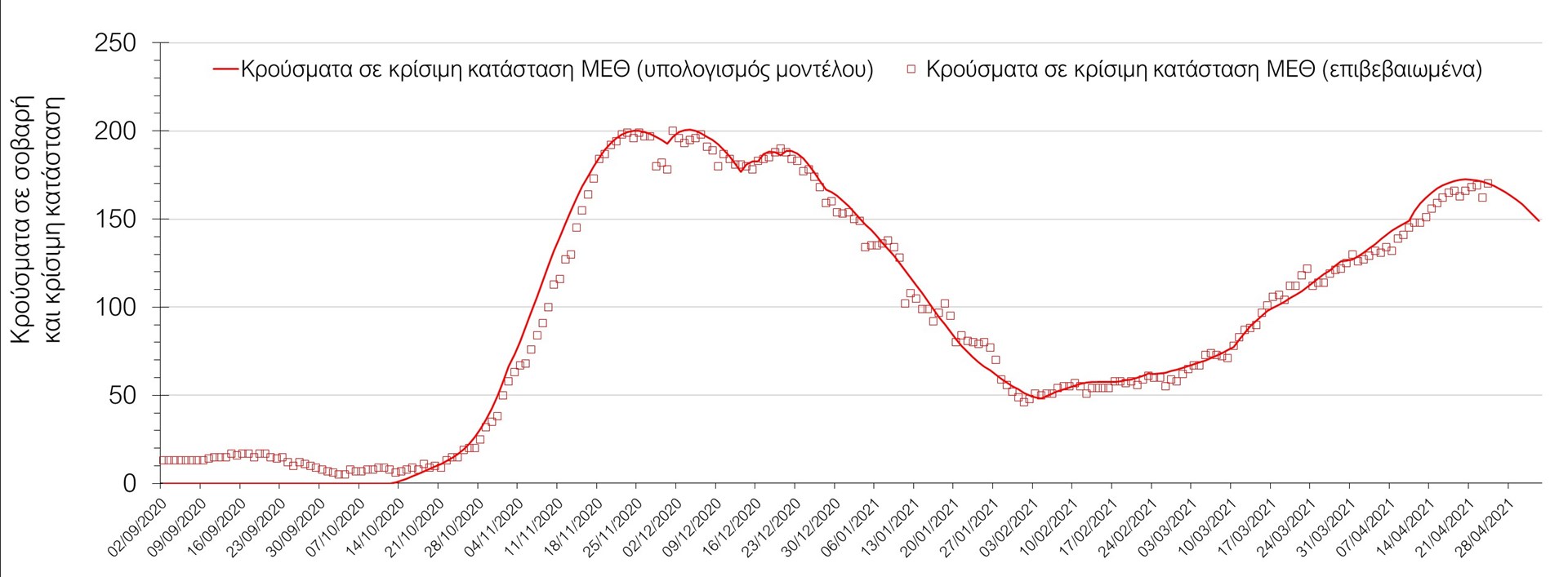 Σχήμα 6. Αριθμός κρουσμάτων σε κρίσιμη κατάσταση (ΜΕΘ) σύμφωνα με τα στοιχεία του ΕΟΔΥ και τις προβλέψεις της υπολογιστικής πλατφόρμας CORE στην ΑθήναΗ πορεία της διασποράς στη Θεσσαλονίκη (Σχήμα 7), αν και στις αρχές Μαρτίου ακολουθούσε τη σχετικά ήπια αύξηση που αναμέναμε, με τα δεδομένα των 395 νέων κρουσμάτων στις 9/3, των 394 στις 17/3 των 535 στις 30/3 μας έχουν οδηγήσει σε αναθεώρηση των προβλέψεων λόγω της επίσης μεγαλύτερη παρουσίας των μεταλλαγμένων στελεχών. Σύμφωνα με τις αναθεωρημένες εκτιμήσεις, αναμένεται να δούμε μια αρχικά αργή αποκλιμάκωση των κρουσμάτων, τουλάχιστον από αυτήν την εβδομάδα. Η πορεία των κρουσμάτων σε κρίσιμη κατάσταση (διασωληνωμένοι σε ΜΕΘ) στη Θεσσαλονίκη, παρουσιάζονται στο Σχήμα 8.