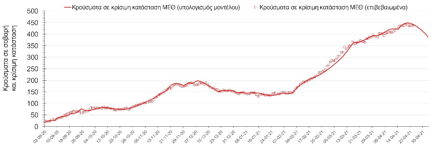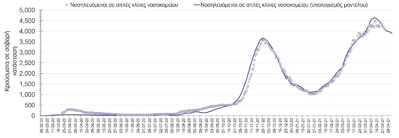 Σύμφωνα με τα στοιχεία του ΕΟΔΥ, ο αριθμός κρουσμάτων το Σάββατο ανέρχεται στα 2597 νέα κρούσματα, με τα αποτελέσματανα συνάδουν με τις προβλέψεις της υπολογιστικής πλατφόρμας CORE (n=2704). Ο αριθμός των τεστ που πραγματοποιήθηκαν ήταν 66151 και σε συνδυασμό με τον αριθμό των κρουσμάτων, ο δείκτης θετικότητας διαμορφώθηκε στο 3,9%. Η πραγματοποίηση αριθμού τεστ σε επίπεδα άνω των 50.000 την ημέρα (όπως και πραγματοποιείται τις τελευταίες ημέρες), συντελεί στο να εξάγουμε πιο ασφαλή συμπεράσματα σχετικά με την πορεία της πανδημίας, αλλά και να εντοπίζονται περισσότεροι ασυμπτωματικοί και προσυμπτωματικοί, συντελώντας στον περιορισμό της πανδημίας. Γενικά όμως θα πρέπει να αυξηθεί κι άλλο ο αριθμός των τεστ ανίχνευσης του SARS-CoV-2 χρησιμοποιώντας τα rapid test και τα fast test για να καταπολεμηθεί η δυναμική αύξησης της διασποράς στις περιοχές όπου μια τέτοια αύξηση διαφαίνεται από τα μέχρι τώρα δεδομένα και την υπολογιστική πλατφόρμα CORE.Ο αριθμός ημερήσιων θανάτων (86) είναι αυξημένος σε σχέση με την Παρασκευή (76) και όπως είχαμε προβλέψει από την προηγούμενη εβδομάδα, ο κυλιόμενος εβδομαδιαίος μέσος όρος που σήμερα είναι 79 αναμένεται να συνεχίσει να αυξάνεται μέχρι τα τέλη της επόμενης εβδομάδας, δεδομένου ότι μόλις τώρα έχει ξεκινήσει η ήπια αποκλιμάκωση του αριθμού των διασωληνωμένων, και παρά τη διαφαινόμενη μέχρι τώρα ελαφρά πτωτική πορεία του αριθμού των κρουσμάτων.Όσον αφορά στους ασθενείς σε κρίσιμη κατάσταση (διασωληνωμένοι σε ΜΕΘ), το Σάββατο ο αριθμός τους μειώθηκε σε σχέση με την Παρασκευή (797 από 819), και διαφαίνεται να έχει ξεκινήσει η αποκλιμάκωση με βάση την επικαιροποιημένη πρόβλεψη (αυτό βέβαια με την παραδοχή ότι θα συνεχίσουν να τηρούνται τα ισχύοντα μέτρα, συμπεριλαμβανομένων των προβλεπόμενων self-test και ανοίγματα δραστηριοτήτων υψηλού συγχρωτισμού, όπως τα mall και η εστίαση θα γίνουν με την κατάλληλη προετοιμασία). Αξίζει να σημειωθεί ότι ο αριθμός των ασθενών σε κρίσιμη κατάσταση όπως και των θανάτων είναι αναλογικά χαμηλότερος σε σχέση με τα αντίστοιχα μεγέθη στο δεύτερο κύμα, τόσο λόγω των εμβολιασμών ευπαθών ομάδων, όσο και του υψηλότερου αριθμού τεστ ανίχνευσης, που συντελεί στον εντοπισμό περισσότερων ασυμπτωματικών ή ήπια συμπτωματικών κρουσμάτων. Επίσης, η διασπορά των μεταλλαγμένων στελεχών που έχουν μεγαλύτερη μεταδοτικότητα από το στέλεχος του SARS-CoV-2 που κυριαρχούσε μέχρι το τέλος Φεβρουαρίου και η αυξημένη κινητικότητα του πληθυσμού έχουν μεγαλώσει το ποσοστό των νεότερων ηλικιών που μολύνονται με αποτέλεσμα η μέση ηλικία των μολύνσεων να έχει πέσει σημαντικά. Η καμπύλη εξέλιξης του αριθμού των ασθενών που νοσηλεύονται σε κλίνες ΜΕΘ με βάση τις προσομοιώσεις της πλατφόρμας CORE, όπως αυτή παρουσιάζεται στο Σχήμα 1, των ασθενών που νοσηλεύονται σε απλές κλίνες στο Σχήμα 2, ενώ μια εκτίμηση για την πορεία των θανάτων ανά ημέρα παρουσιάζεται στο Σχήμα 3.