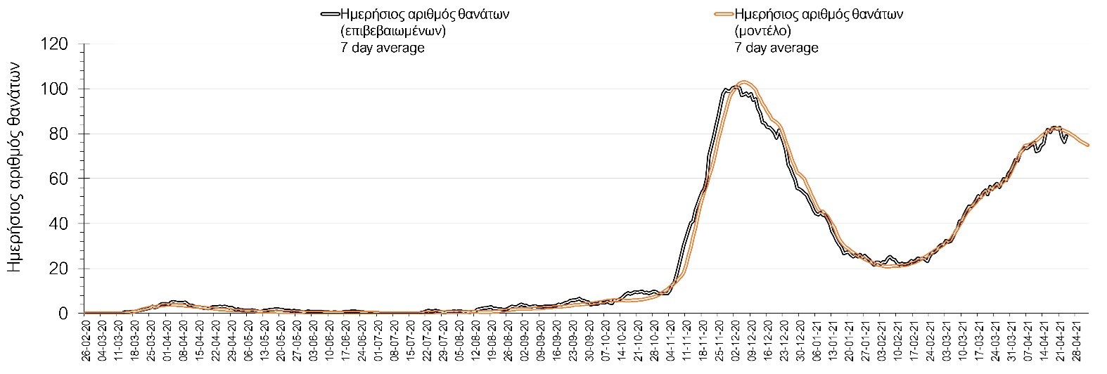 Σχήμα 3. Αριθμός θανάτων (κυλιόμενος μέσος όρος 7 ημερών) σύμφωνα με τα στοιχεία του ΕΟΔΥ και τις προβλέψεις της υπολογιστικής πλατφόρμας CORE.Η πορεία της μέσης εβδομαδιαίας τιμής των κρουσμάτων, καθώς και του κυλιόμενου μέσου όρου 7 ημερών του αριθμού των κρουσμάτων ανά 100.000 πληθυσμού, όπως έχουν καταγραφεί από τον ΕΟΔΥ και η αναμενόμενη πορεία τους όπως προδιαγράφεται από την υπολογιστική πλατφόρμα CORE για την Ελληνική επικράτεια μέχρι το Πάσχα, αποτυπώνονται στο Σχήμα 4. Φαίνεται μια αρχική σταθεροποίηση σε υψηλό αριθμό κορυσμάτων μέχρι το τέλος του μήνα και έπειτα μια μικρή αύξηση με κορύφωση στις 8 Απριλίου. Μετά από αυτήν την ημερομηνία και ανάλογα με τα μέτρα που θα έχουμε εφαρμόσει θα μπορούμε να δούμε σταδιακή αποκλιμάκωση της πανδημίας πανελλαδικά. Αξίζει να σημειωθεί, ότι αυτή η προβλεπόμενη πορεία, που αφορά τόσο τα κρούσματα, όσο και τις ΜΕΘ και τους θανάτους, βασίζεται στις ακόλουθες παραδοχές: